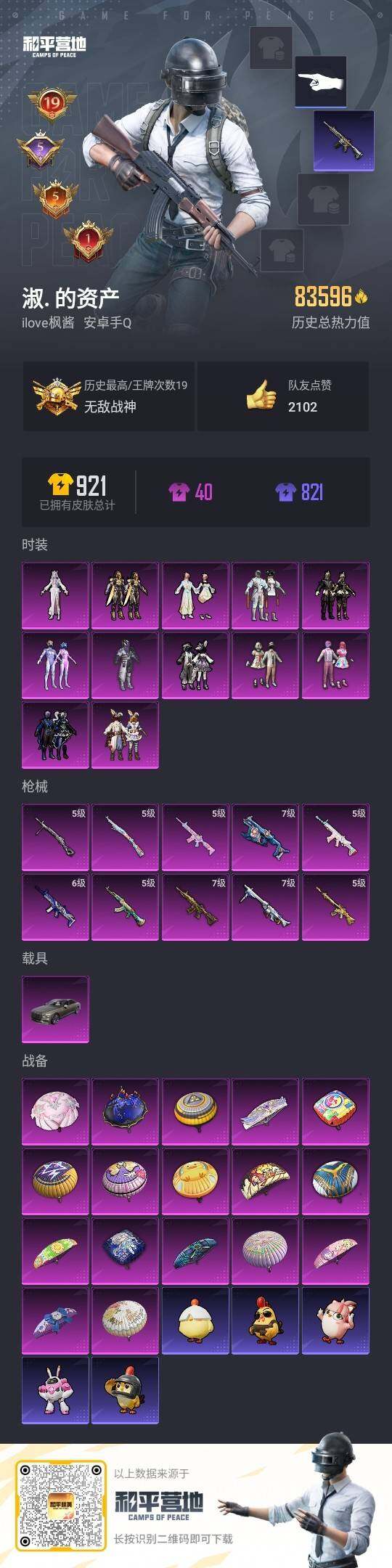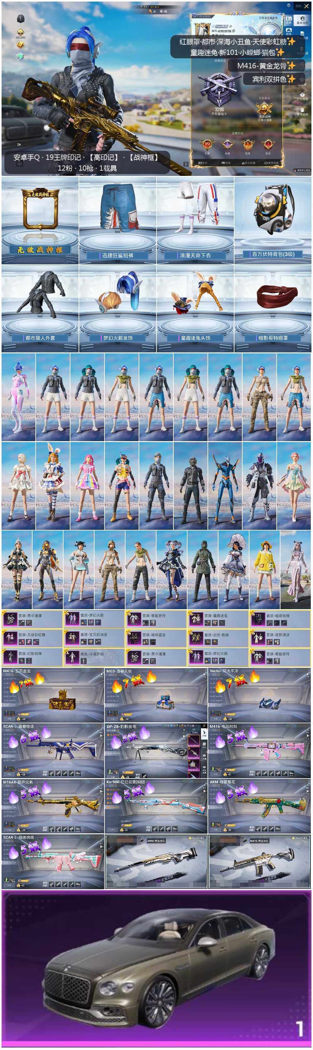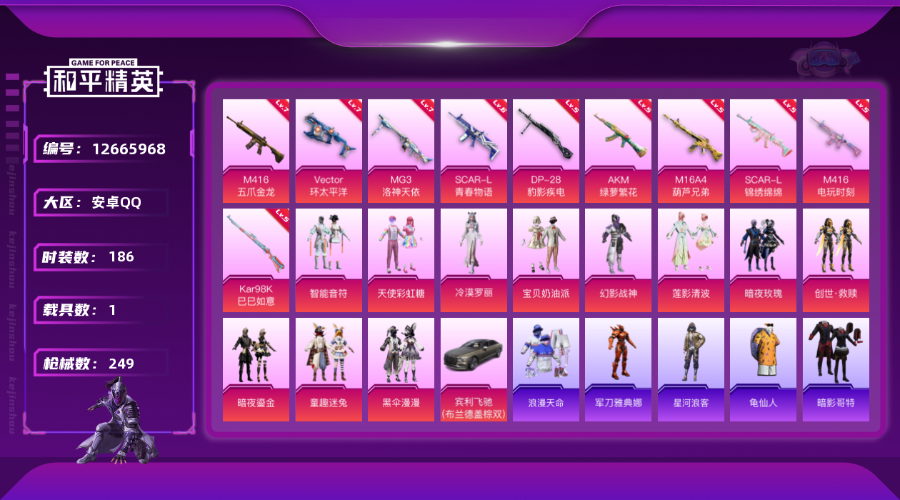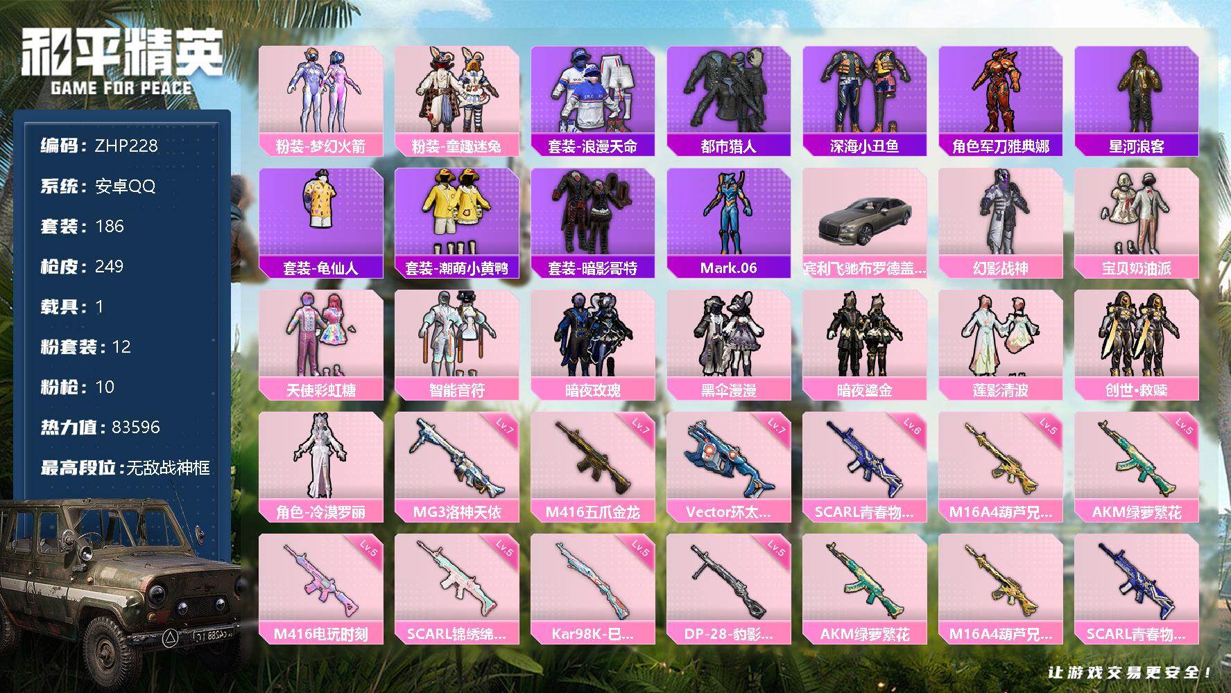 [12665968]素材身法号/无敌战神框3/绝世印记1/地铁满天赋 安卓 手Q-无敌战神框-12粉装-10特效枪-1载具-8.3w热力值-19王牌印记-186套装-249枪皮【热门品类】:粉装-梦幻火箭,粉装-童趣迷兔,套装-浪漫天命,套装-都市猎人,套装-深海小丑鱼,角色-军刀雅典娜,套装-星河浪客,套装-龟仙人,套装-潮萌小黄鸭,套装-暗影哥特,角色-Mark.06【粉色载具】:宾利飞驰(布罗德盖棕双色)【粉色套装】:粉装-幻影战神,粉装-宝贝奶油派,粉装-天使彩虹糖,粉装-梦幻火箭,粉装-智能音符,粉装-童趣迷兔,粉装-暗夜玫瑰,粉装-黑伞漫漫,粉装-暗夜鎏金,粉装-莲影清波,套装-创世·救赎,角色-冷漠罗丽【粉色枪皮等级】:AKM-绿萝繁花(五级),M16A4-葫芦兄弟(五级),SCAR-L-青春物语(六级),SCAR-L-锦绣绵绵(五级),M416-五爪金龙(七级),M416-电玩时刻(五级),Vector-环太平洋(七级),Kar98K-巳巳如意(五级),DP-28-豹影疾电(五级),MG3-洛神天依(七级)