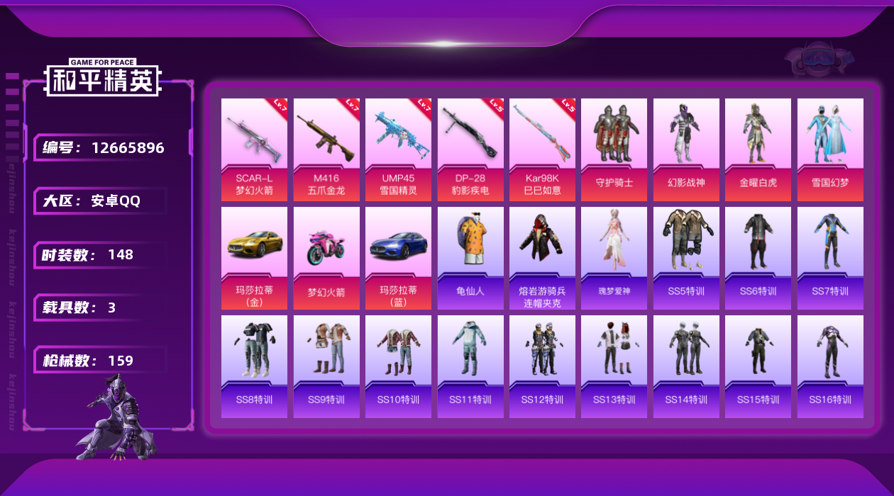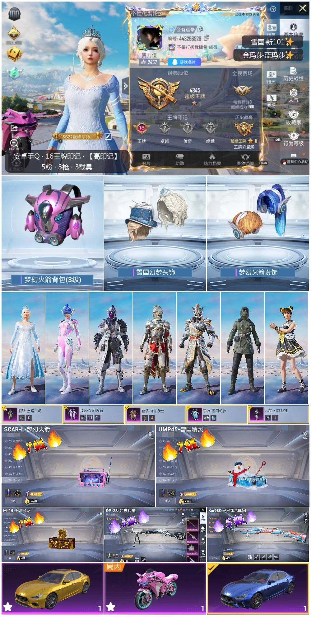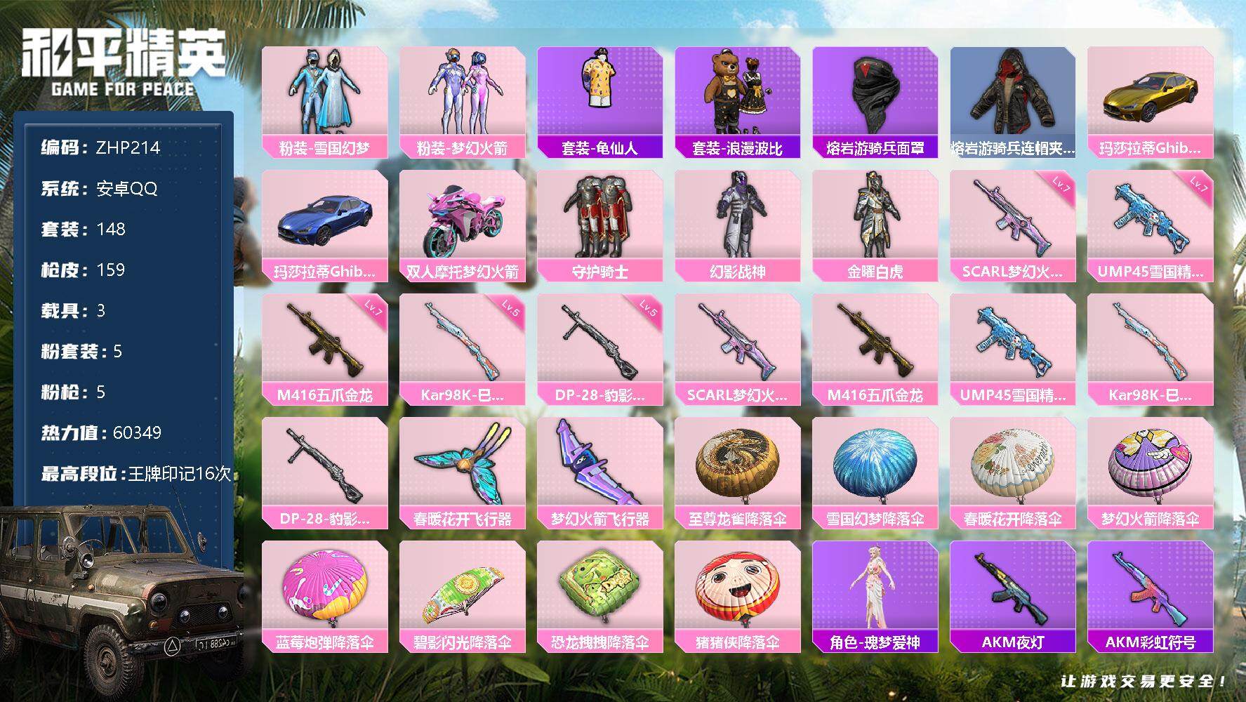 [12665896]雪国幻梦!新101 金玛莎!安卓 手Q-5粉装-5特效枪-3载具-2粉色飞行器-60349热力值-16王牌印记-148套装-159枪皮