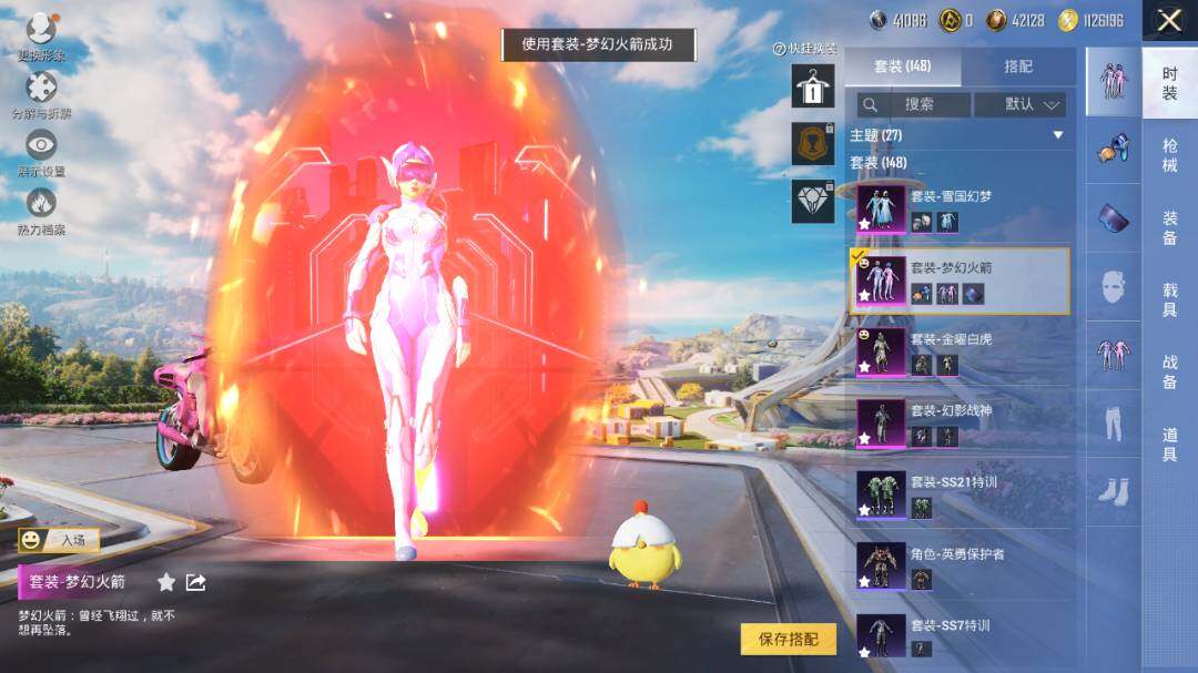 【粉色套装】:粉装-守护骑士,粉装-幻影战神,粉装-金曜白虎,粉装-雪国幻梦,粉装-梦幻火箭