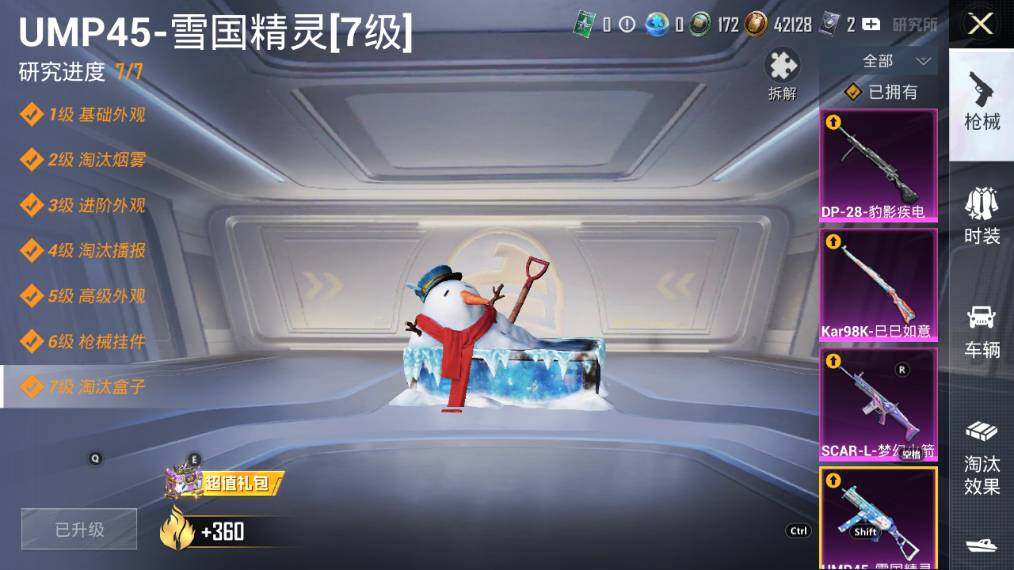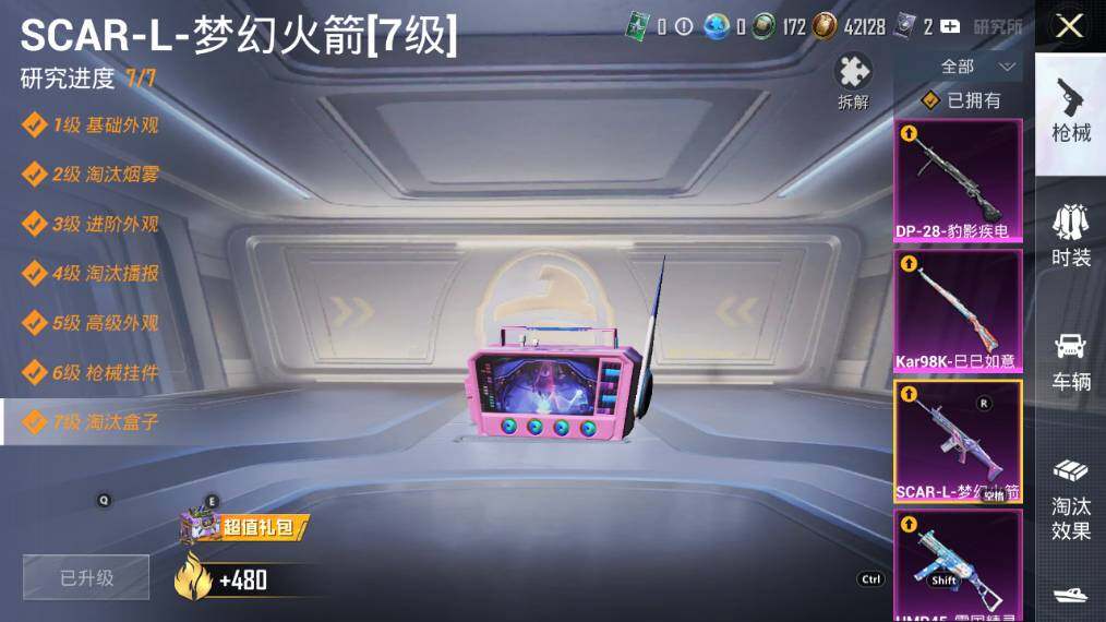 【粉色枪皮等级】:SCAR-L-梦幻火箭(七级),M416-五爪金龙(七级),UMP45-雪国精灵(七级),Kar98K-巳巳如意(五级),DP-28-豹影疾电(五级)