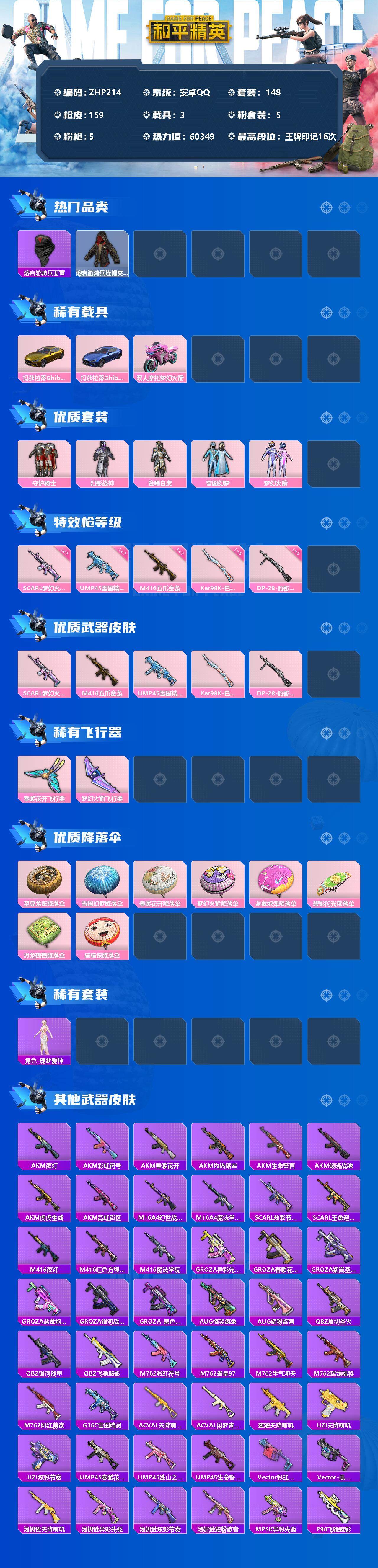 [12665896]雪国幻梦!新101 金玛莎!安卓 手Q-5粉装-5特效枪-3载具-2粉色飞行器-60349热力值-16王牌印记-148套装-159枪皮 【热门品类】:粉装-雪国幻梦,粉装-梦幻火箭,套装-龟仙人,套装-浪漫波比,熔岩游骑兵面罩,熔岩游骑兵连帽夹克 【粉色载具】:玛莎拉蒂Ghibli(金),玛莎拉蒂Ghibli(蓝),双人摩托-梦幻火箭 【粉色套装】:粉装-守护骑士,粉装-幻影战神,粉装-金曜白虎,粉装-雪国幻梦,粉装-梦幻火箭 【粉色枪皮等级】:SCAR-L-梦幻火箭(七级),M416-五爪金龙(七级),UMP45-雪国精灵(七级),Kar98K-巳巳如意(五级),DP-28-豹影疾电(五级) 【粉色枪皮】:SCAR-L-梦幻火箭,M416-五爪金龙,UMP45-雪国精灵,Kar98K-巳巳如意,DP-28-豹影疾电 【粉色飞行器】:春暖花开飞行器,梦幻火箭飞行器 【粉色降落伞】:至尊龙雀降落伞,雪国幻梦降落伞,春暖花开降落伞,梦幻火箭降落伞,蓝莓炮弹降落伞,碧影闪光降落伞,恐龙拽拽降落伞,猪猪侠降落伞 【稀有套装】:套装-龟仙人,角色-瑰梦爱神 【稀有枪皮】:AKM-夜灯,AKM-彩虹符号,AKM-春暖花开,AKM-灼热熔岩,AKM-生命誓言,AKM-破晓战魂,AKM-虎虎生威,AKM-霓虹街区,M16A4-幻世战舞者,M16A4-魔法学院,SCAR-L-炫彩节奏,SCAR-L-玉兔迎春,M416-夜灯,M416-红色方程式,M416-魔法学院,GROZA-异彩先驱,GROZA-春暖花开,GROZA-紫翼圣骑,GROZA-蓝莓炮弹,GROZA-银河战甲,GROZA-黑色刀锋,AUG-怪笑疯兔,AUG-耀粉歌者,QBZ-原初圣火,QBZ-银河战甲,QBZ-飞驰魅影,M762-彩虹符号,M762-拳皇97,M762-牛气冲天,M762-瑞龙福将,M762-绯红前夜,G36C-雪国精灵,AC-VAL-天降萌叽,AC-VAL-闲梦青缨,蜜獾-天降萌叽,UZI-天降萌叽,UZI-炫彩节奏,UMP45-春暖花开,UMP45-涂山之恋,UMP45-生命誓言,Vector-彩虹符号,Vector-黑色刀锋,汤姆逊-天降萌叽,汤姆逊-异彩先驱,汤姆逊-炫彩节奏,汤姆逊-耀粉歌者,MP5K-异彩先驱,P90-飞驰魅影,Kar98K-彩虹符号,Kar98K-梦幻火箭,Kar98K-飞