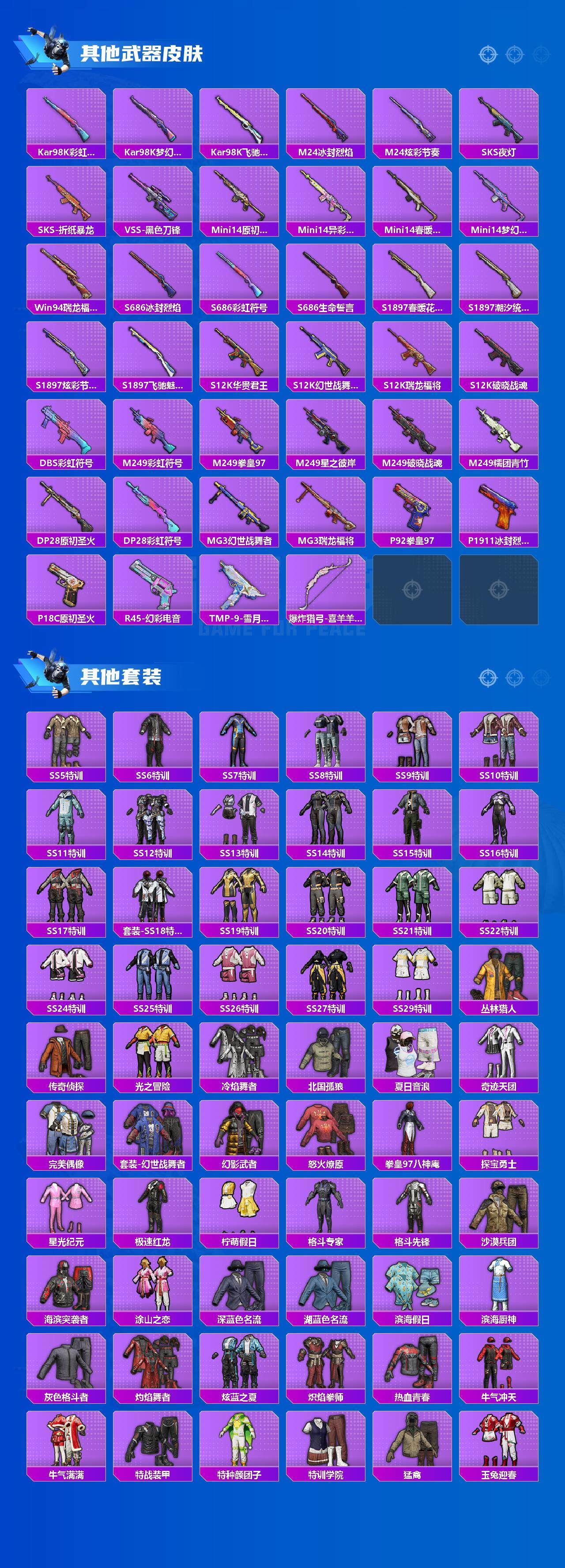 【稀有枪皮】:AKM-夜灯,AKM-彩虹符号,AKM-春暖花开,AKM-灼热熔岩,AKM-生命誓言,AKM-破晓战魂,AKM-虎虎生威,AKM-霓虹街区,M16A4-幻世战舞者,M16A4-魔法学院,SCAR-L-炫彩节奏,SCAR-L-玉兔迎春,M416-夜灯,M416-红色方程式,M416-魔法学院,GROZA-异彩先驱,GROZA-春暖花开,GROZA-紫翼圣骑,GROZA-蓝莓炮弹,GROZA-银河战甲,GROZA-黑色刀锋,AUG-怪笑疯兔,AUG-耀粉歌者,QBZ-原初圣火,QBZ-银河战甲,QBZ-飞驰魅影,M762-彩虹符号,M762-拳皇97,M762-牛气冲天,M762-瑞龙福将,M762-绯红前夜,G36C-雪国精灵,AC-VAL-天降萌叽,AC-VAL-闲梦青缨,蜜獾-天降萌叽,UZI-天降萌叽,UZI-炫彩节奏,UMP45-春暖花开,UMP45-涂山之恋,UMP45-生命誓言,Vector-彩虹符号,Vector-黑色刀锋,汤姆逊-天降萌叽,汤姆逊-异彩先驱,汤姆逊-炫彩节奏,汤姆逊-耀粉歌者,MP5K-异彩先驱,P90-飞驰魅影,Kar98K-彩虹符号,Kar98K-梦幻火箭,Kar98K-飞