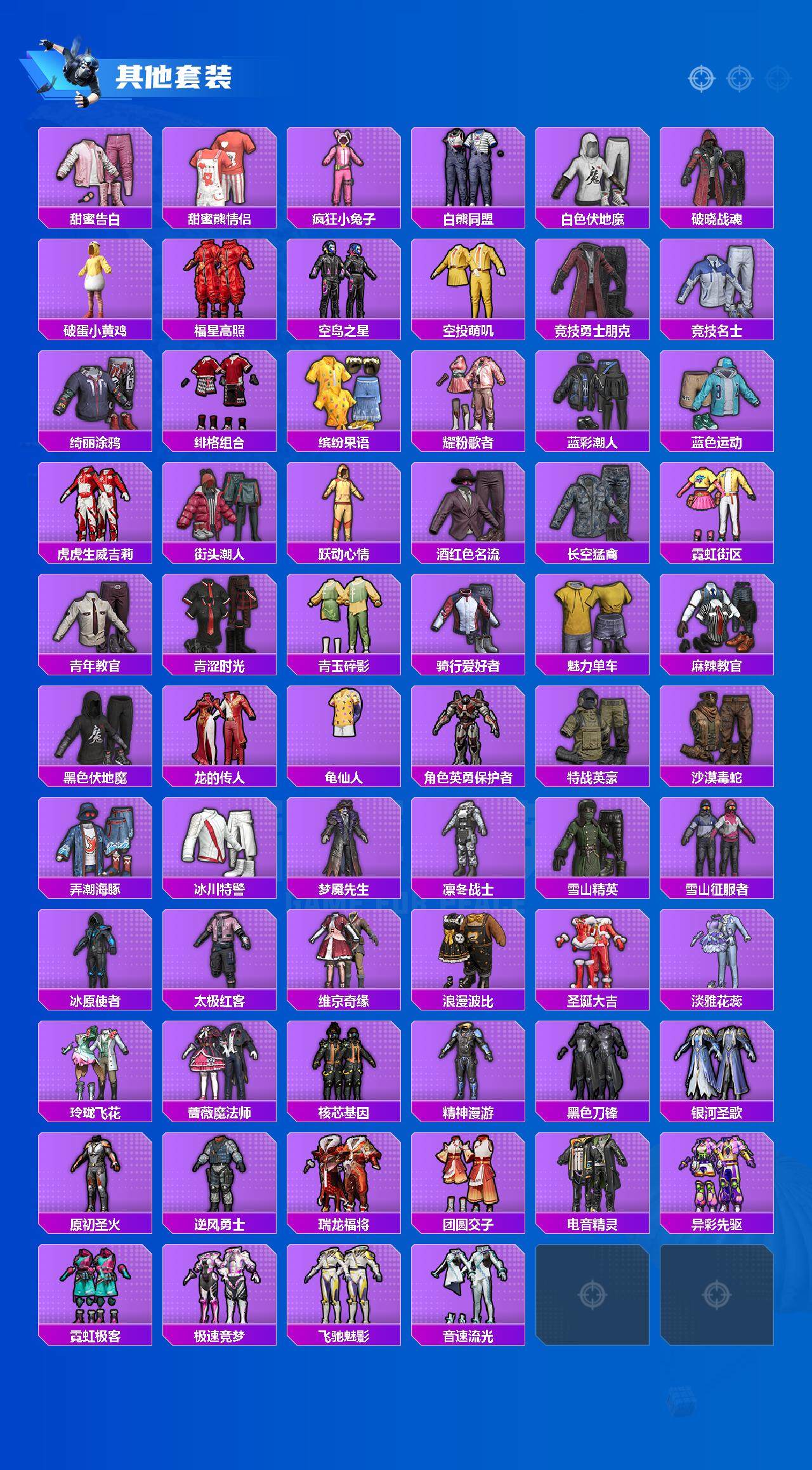 套装-龟仙人,套装-极速红龙,套装-破蛋小黄鸡,角色-英勇保护者,套装-弄潮海豚,套装-雪山精英,套装-黑色刀锋,套装-瑞龙福将,套装-团圆交子