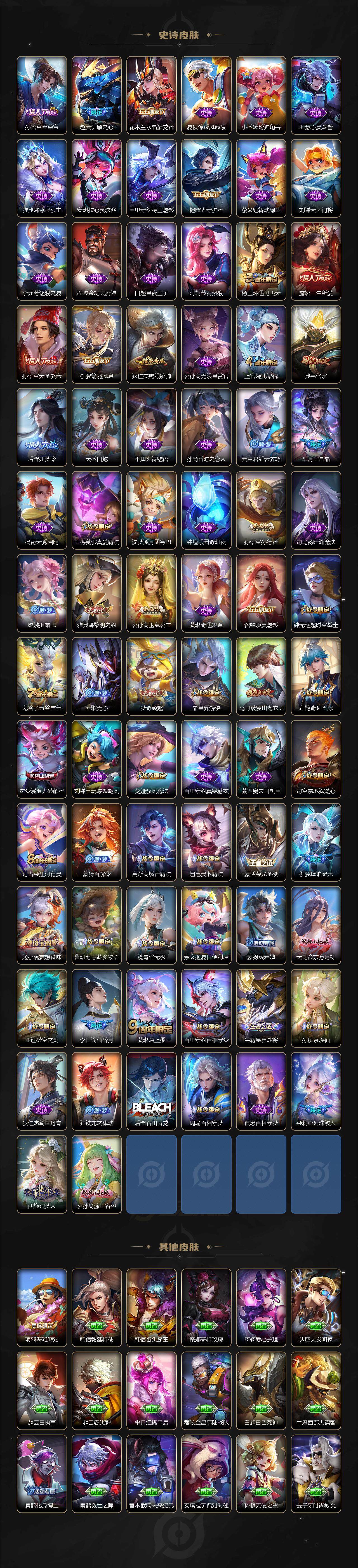 【限定皮肤】:蒙犽顽岩魄,蔡文姬夏日便利店,大乔绒语心约,虞姬夏日便利店,姜子牙天穹之誓,李白谪仙醉月,狄仁杰阴阳师,赵云皇家上将,赵云引擎之心,孙尚香异界灵契,鲁班七号时之奇旅,钟无艳超时空战士,扁鹊奇幻香踪,芈月白晶晶,元歌无心,甄姬落雪兰心,典韦岱宗,马可波罗山海玄木吟,狄仁杰魔术师,狄仁杰万华元夜,狄仁杰神器狴犴令,达摩沙漠行僧,项羽海滩派对,程咬金演武夺筹,露娜一生所爱,兰陵王影龙天霄,孙悟空至尊宝,孙悟空大圣娶亲,孙悟空零号赤焰,孙悟空孙行者,后羿如梦令,李元芳云中旅人,虞姬启明星使,钟馗驱傩正仪,杨玉环遇见飞天,杨戬潮玩骑兵,女娲朔望之晖,干将莫邪胡桃夹子,干将莫邪真爱魔法,雅典娜黎明之约,鬼谷子原初探秘者,鬼谷子五谷丰年,诸葛亮鹤羽星尊,苏烈千军破阵,百里玄策白虎志,梦奇顽趣,公孙离玉兔公主,沈梦溪匿光破解者,裴擒虎寅虎赤拳,裴擒虎擒涛扼浪,云中君纤云弄巧,上官婉儿梁祝,嫦娥拒霜思,嫦娥暖冬兔眠,西施玲珑珍味,鲁班大师探海日志,桑启海盐诗旅,夏洛特浮生妄,暃星界游侠,戈娅驭风魔法,艾琳流音漫舞,司空震地狱燃心,阿古朵江河有灵,张良古海寻踪,王昭君永恒水手月亮,狄仁杰夜礼服假面,蒙犽百解令,蒙恬荣光圣徽,高渐离燃音魔法,妲己灵卜魔法,鬼谷子天穹祈灯,伽罗琥珀纪元,姬小满妄想食味,孙尚香乘龙问璇玑,孙策乘龙淬吴钩,沈梦溪龙舞盛年,鲁班七号蔬乡物语,李元芳蔬乡物语,刘邦剑破天穹,程咬金群星魔术团,镜青焰无极,项羽苍威无极,周瑜熔金海岸