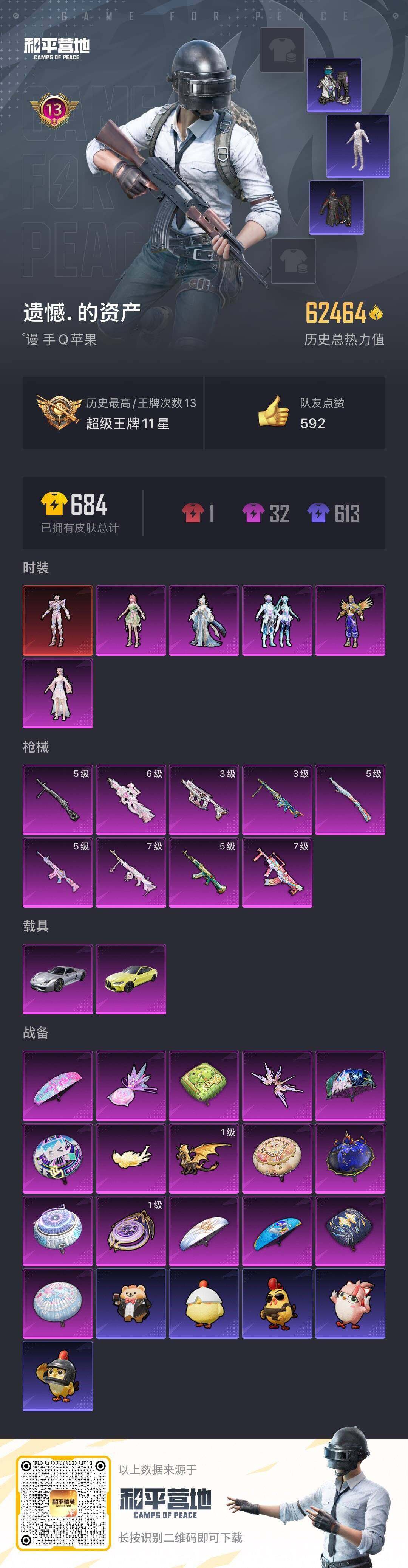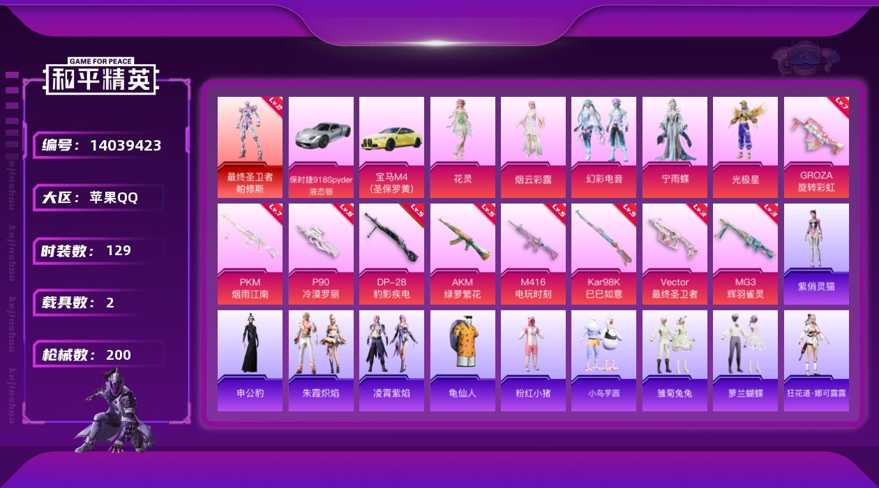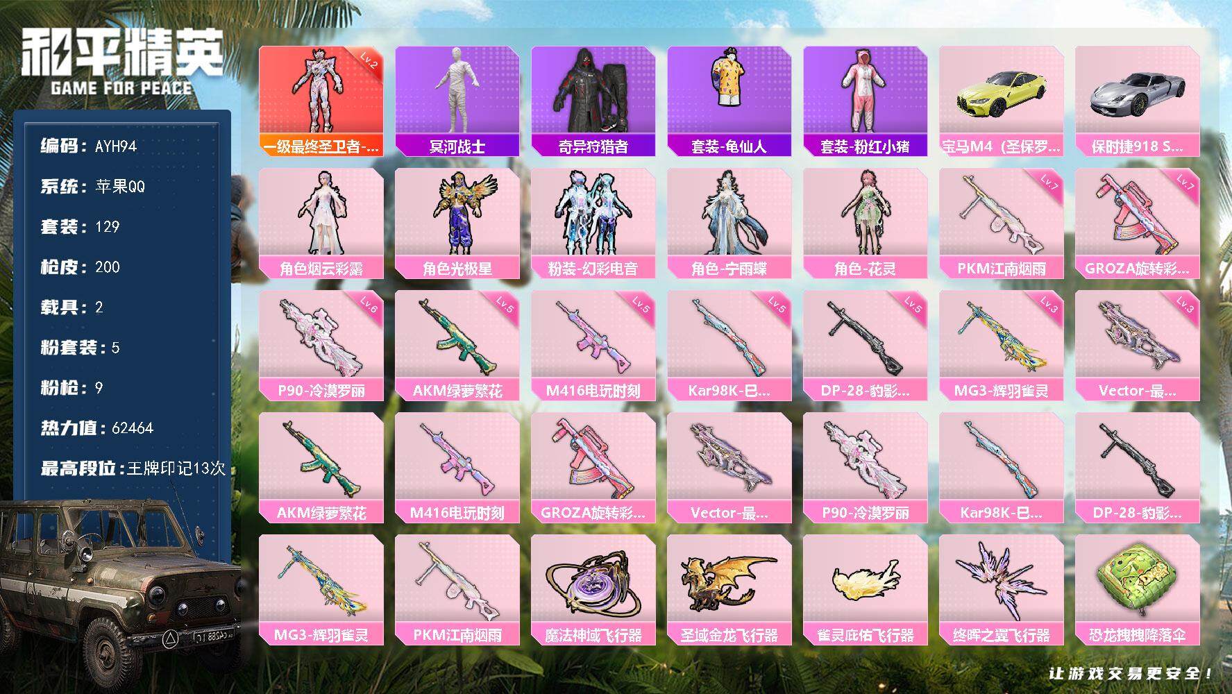 [14039423]老木乃伊/地铁满天赋【店主推荐捡漏号!可直接换绑】苹果 手Q-1神装-5粉装-9特效枪-2载具-5粉色飞行器-62464热力值-13王牌印记-129套装-200枪皮【红色神装等级】:最终圣卫者-帕修斯(二级)【红色角色神装】:最终圣卫者-帕修斯【热门品类】:套装-冥河战士,套装-奇异狩猎者,套装-龟仙人,套装-粉红小猪【粉色载具】:宝马M4(圣保罗黄),保时捷918 Spyder(液态银)【粉色套装】:角色-烟云彩露,角色-光极星,粉装-幻彩电音,角色-宁雨蝶,角色-花灵【粉色枪皮等级】:AKM-绿萝繁花(五级),M416-电玩时刻(五级),GROZA-旋转彩虹(七级),Vector-最终圣卫者(三级),P90-冷漠罗丽(六级),Kar98K-巳巳如意(五级),DP-28-豹影疾电(五级),MG3-辉羽雀灵(三级),PKM-江南烟雨(七级)【粉色枪皮】:AKM-绿萝繁花,M416-电玩时刻,GROZA-旋转彩虹,Vector-最终圣卫者,P90-冷漠罗丽,Kar98K-巳巳如意,DP-28-豹影疾电,MG3-辉羽雀灵,PKM-江南烟雨【粉色飞行器】:魔法神域飞行器,圣域金龙飞行器,雀灵庇佑飞行器,终晖之翼飞行器