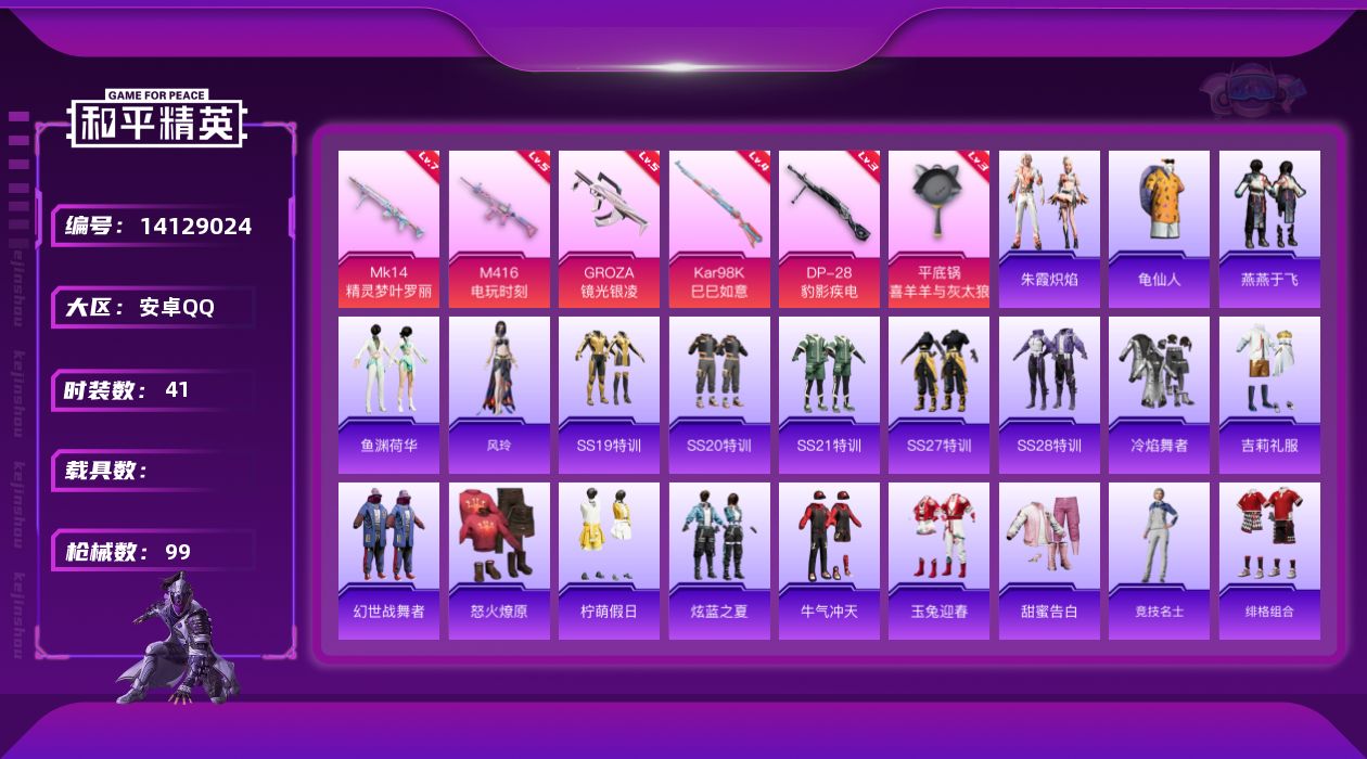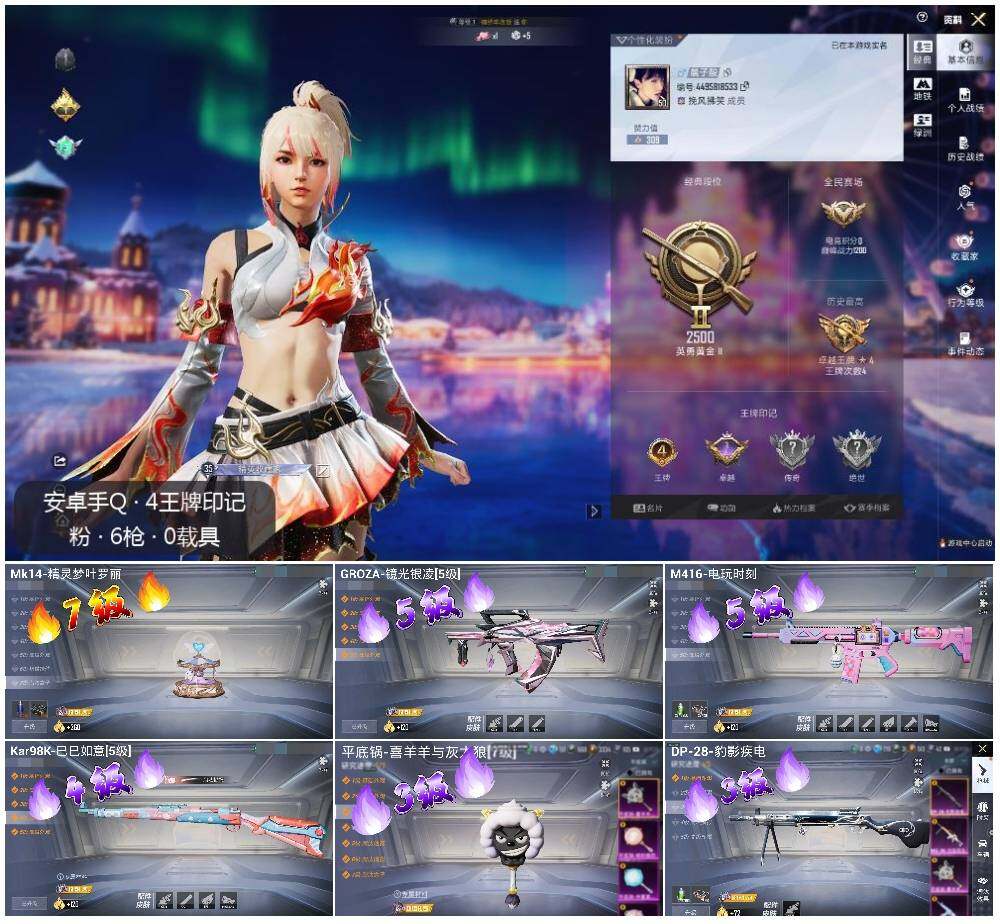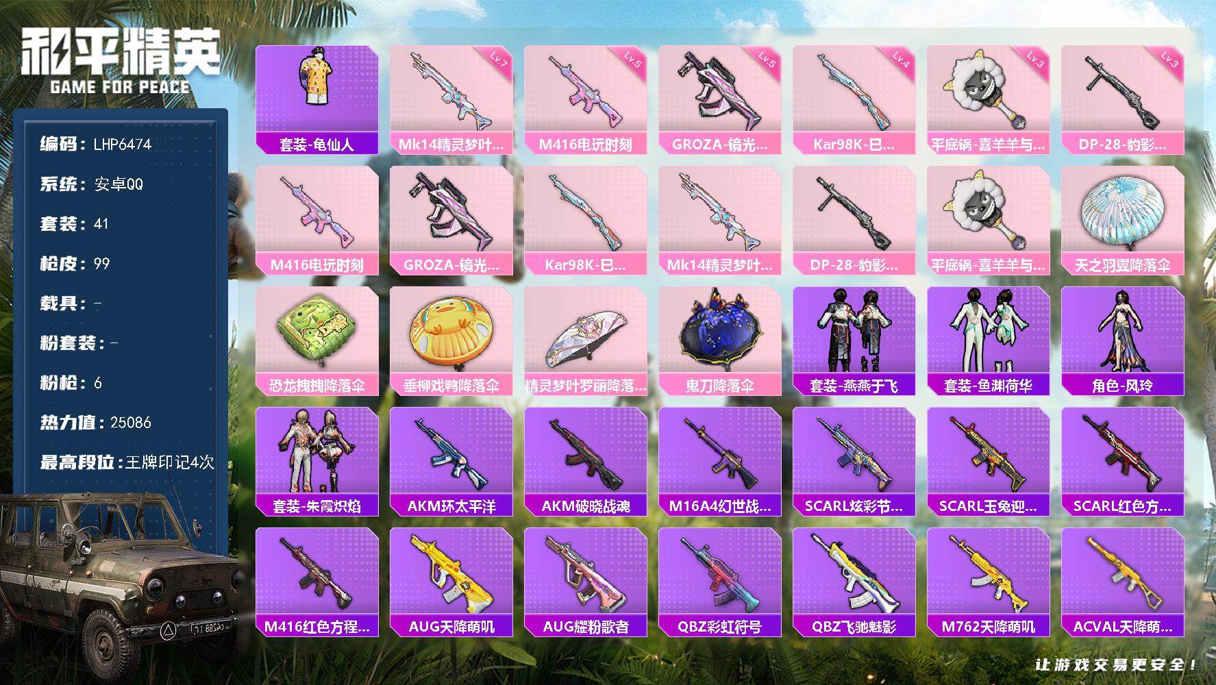 [14129024]可二次【店主推荐捡漏号!可直接换绑】 安卓 手Q-6特效枪-2.5w热力值-4王牌印记-41套装-99枪皮【热门品类】:套装-龟仙人【粉色枪皮等级】:M416-电玩时刻(五级),GROZA-镜光银凌(五级),Kar98K-巳巳如意(四级),Mk14-精灵梦叶罗丽(七级),DP-28-豹影疾电(三级),平底锅-喜羊羊与灰太狼(三级)
