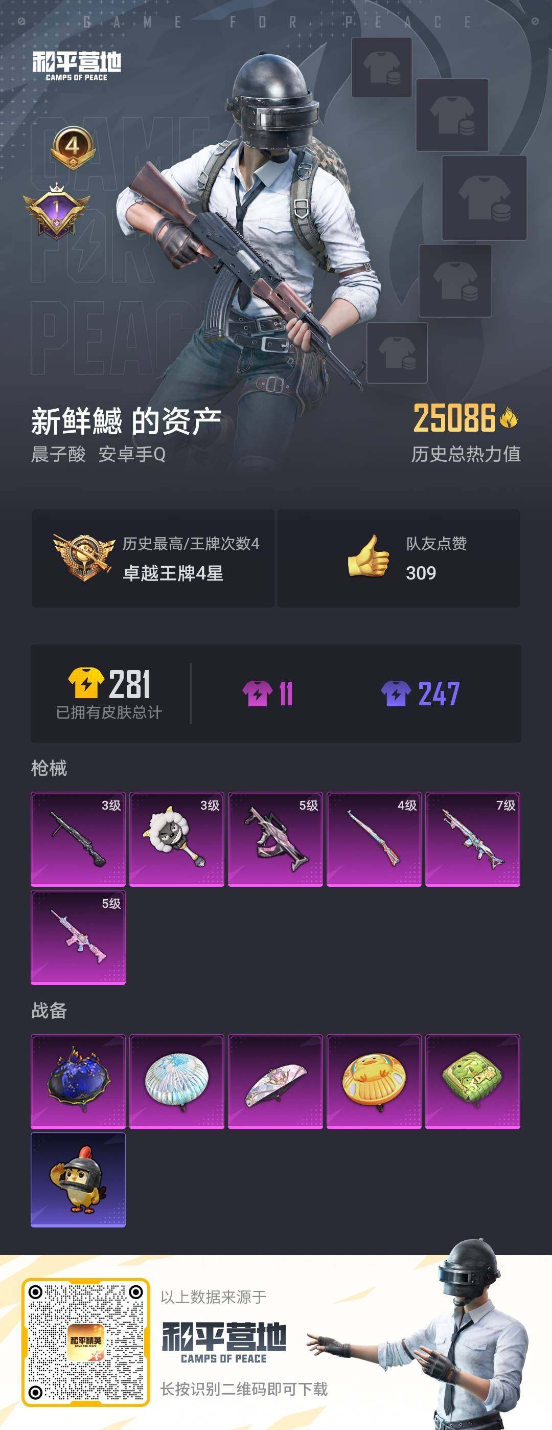 - PX_2104474-??螂】安卓Q-YXc9953【可二次】【因赛季更新游戏段付以上号为准!】 13王牌印记 历史超级王牌6星 138套装 189枪皮 【2载具】 永恒黄蜂 萌喵橘座 【1稀有】 AKM-缤纷海域 【4粉装】 水仙星 烟云彩露 猩猩队长 未来歌姬 【4特效枪】 Kar98K-巳巳如意 (5级) UMP45-量子极限 (5级) Kar98K-未来歌姬 (5级) SCAR-L-青春物