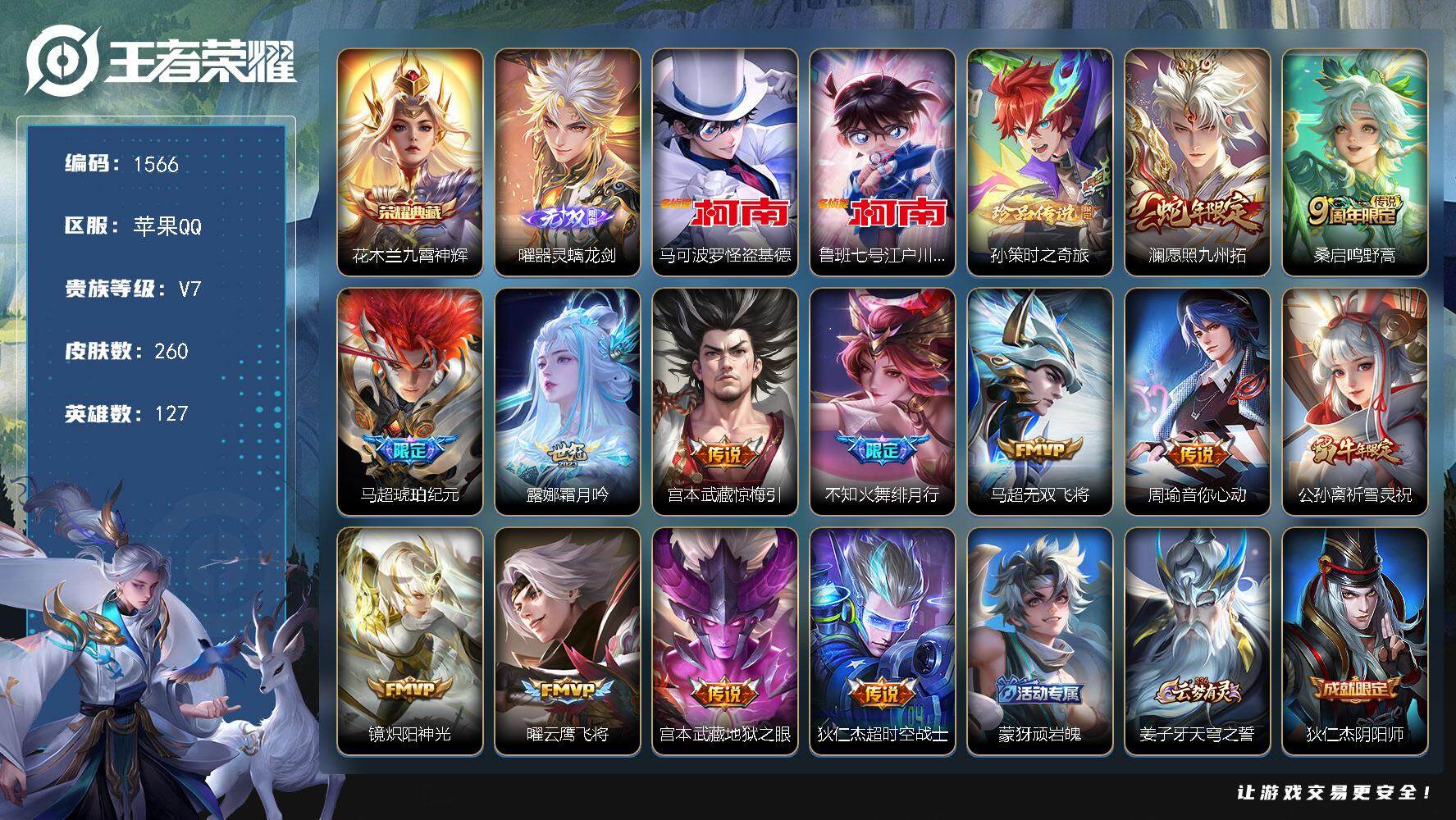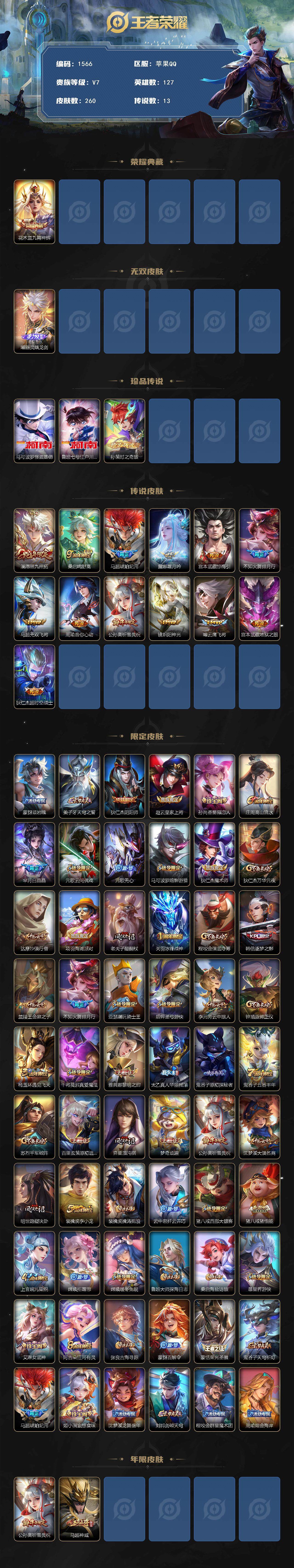 [14137187]苹果Q-V7-最强王者段位-127英雄-260皮肤-1典藏皮肤-1无双-3珍品传说-13传说-76史诗