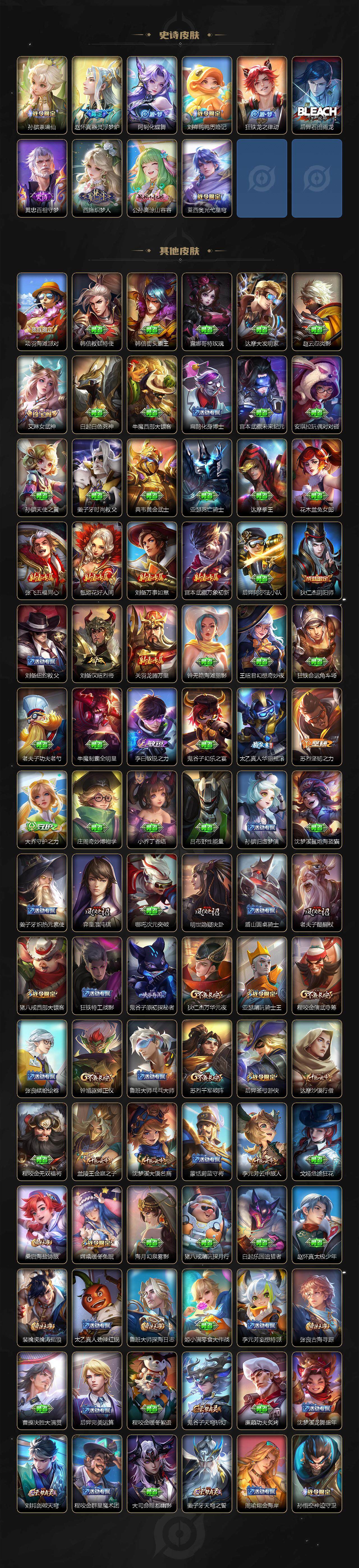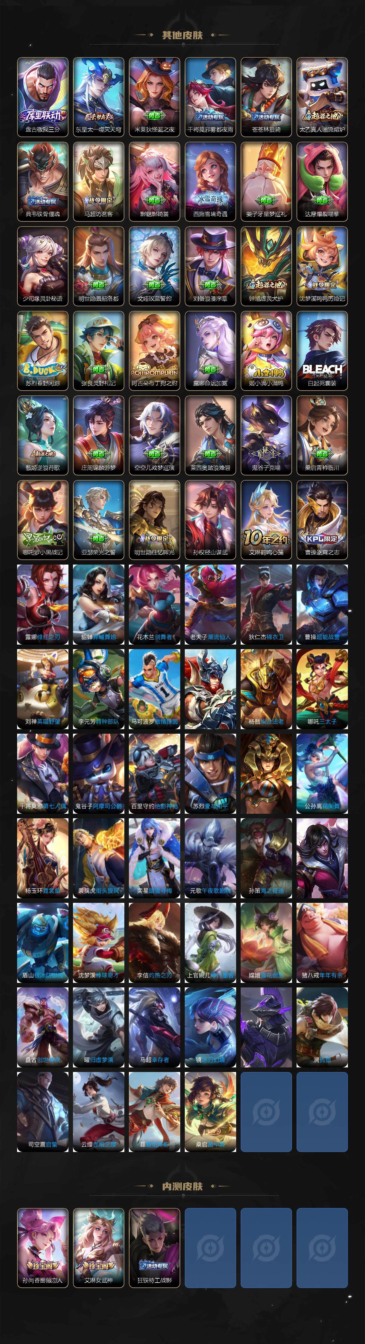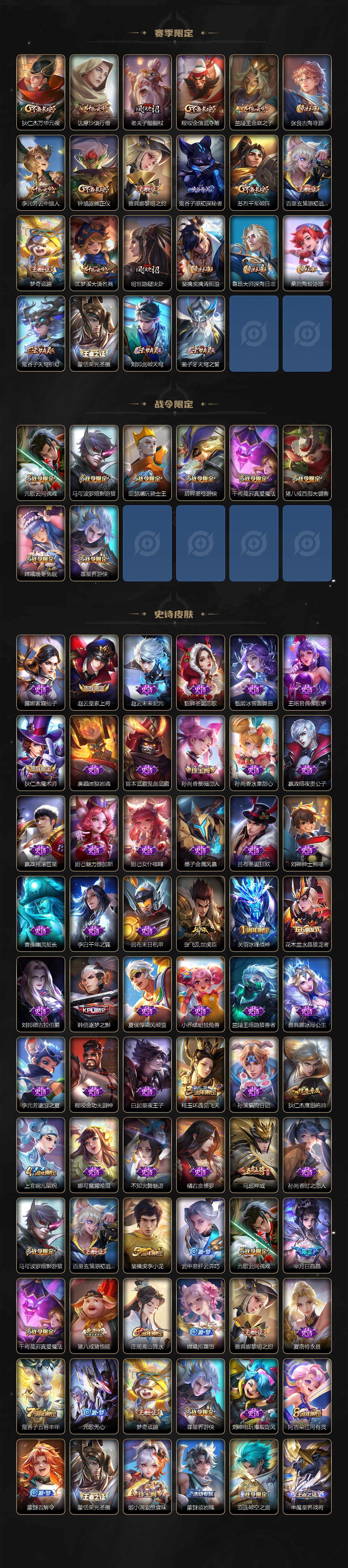 【限定皮肤】:蒙犽顽岩魄,姜子牙天穹之誓,狄仁杰阴阳师,赵云皇家上将,孙尚香蔷薇恋人,庄周高山流水,芈月白晶晶,元歌云间偶戏,元歌无心,马可波罗暗影游猎,狄仁杰魔术师,狄仁杰万华元夜,达摩沙漠行僧,项羽海滩派对,老夫子醍醐杖,关羽冰锋战神,程咬金演武夺筹,韩信逐梦之影,兰陵王金庭之子,不知火舞绯月行,亚瑟潮玩骑士王,后羿圣弓游侠,李元芳云中旅人,钟馗驱傩正仪,杨玉环遇见飞天,干将莫邪真爱魔法,雅典娜黎明之约,太乙真人华丽摇滚,鬼谷子原初探秘者,鬼谷子五谷丰年,苏烈千军破阵,百里玄策原初追逐者,弈星混沌棋,梦奇顽趣,公孙离祈雪灵祝,沈梦溪大漠名商,明世隐疑决卦,裴擒虎李小龙,裴擒虎擒涛扼浪,云中君纤云弄巧,猪八戒西部大镖客,猪八戒猪悟能,上官婉儿梁祝,嫦娥拒霜思,嫦娥暖冬兔眠,鲁班大师探海日志,桑启海盐诗旅,暃星界游侠,艾琳女武神,阿古朵江河有灵,张良古海寻踪,蒙犽百解令,蒙恬荣光圣徽,鬼谷子天穹祈灯,马超琥珀纪元,姬小满妄想食味,沈梦溪龙舞盛年,刘邦剑破天穹,程咬金群星魔术团,周瑜熔金海岸