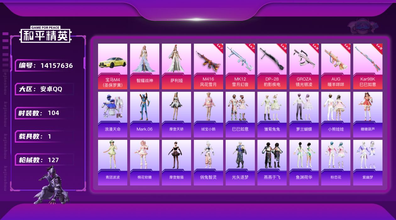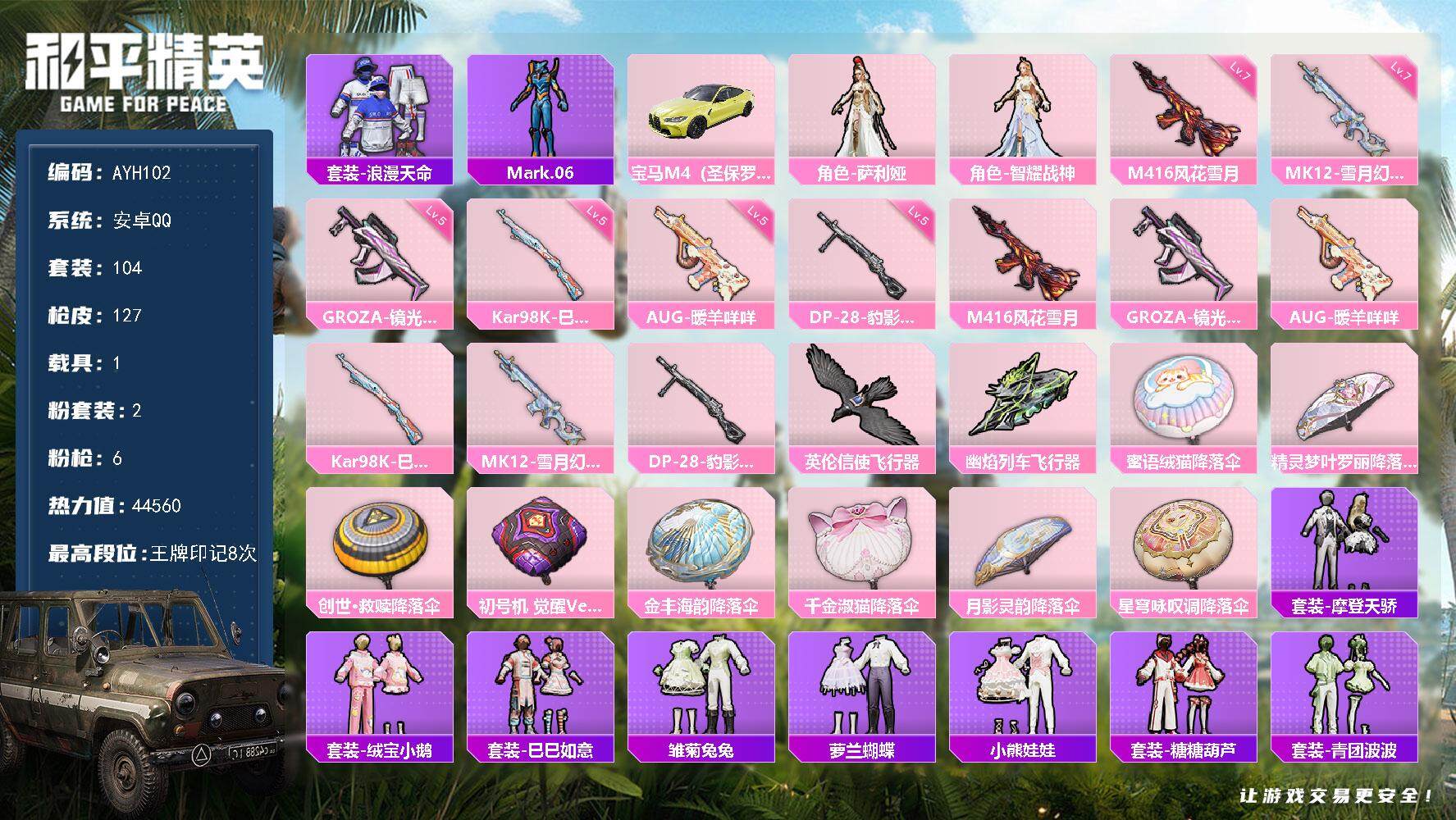 [14157636]地铁满天赋/可二次,【店主推荐捡漏号!可直接换绑】安卓 手Q-2粉装-6特效枪-1载具-3粉色飞行器-44560热力值-8王牌印记-104套装-127枪皮【热门品类】:套装-浪漫天命,角色-Mark.06【粉色载具】:宝马M4(圣保罗黄)【粉色套装】:角色-萨利娅,角色-智耀战神【粉色枪皮等级】:M416-风花雪月(七级),GROZA-镜光银凌(五级),AUG-暖羊咩咩(五级),Kar98K-巳巳如意(五级),MK12-雪月幻音(七级),DP-28-豹影疾电(五级)【粉色枪皮】:M416-风花雪月,GROZA-镜光银凌,AUG-暖羊咩咩,Kar98K-巳巳如意,MK12-雪月幻音,DP-28-豹影疾电【粉色飞行器】:英伦信使飞行器,幽焰列车飞行器