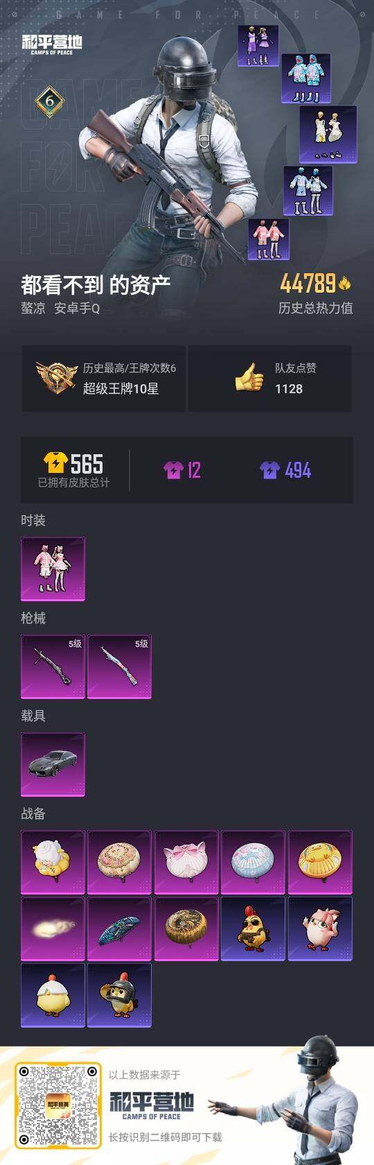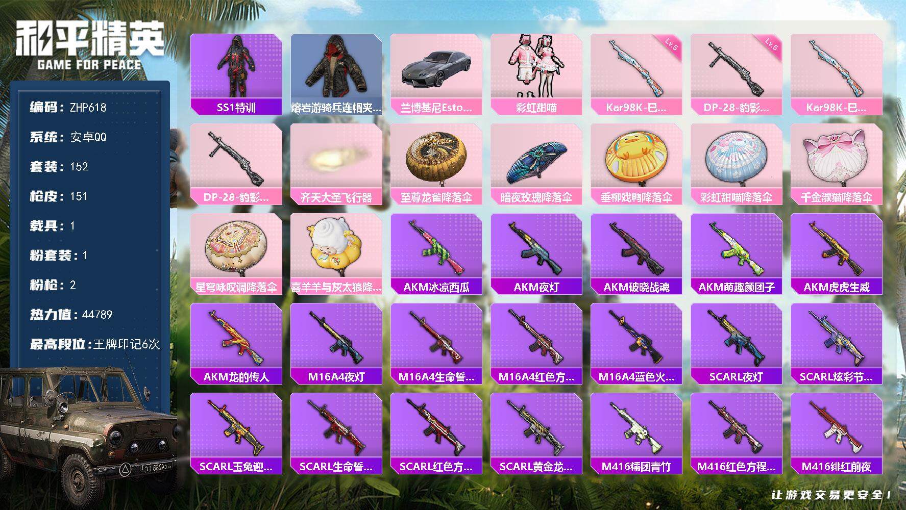 [14158254]可二次【店主推荐捡漏号!可直接换绑】 安卓 手Q-1粉装-2特效枪-1载具-1粉色飞行器-4.4w热力值-6王牌印记-152套装-151枪皮【热门品类】:套装-SS1特训,熔岩游骑兵连帽夹克【粉色载具】:兰博基尼Estoque(银翼灰)【粉色套装】:粉装-彩虹甜喵【粉色枪皮等级】:Kar98K-巳巳如意(五级),DP-28-豹影疾电(五级)【粉色飞行器】:齐天大圣飞行器