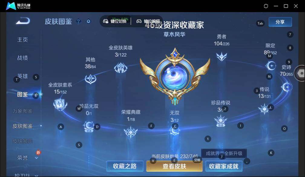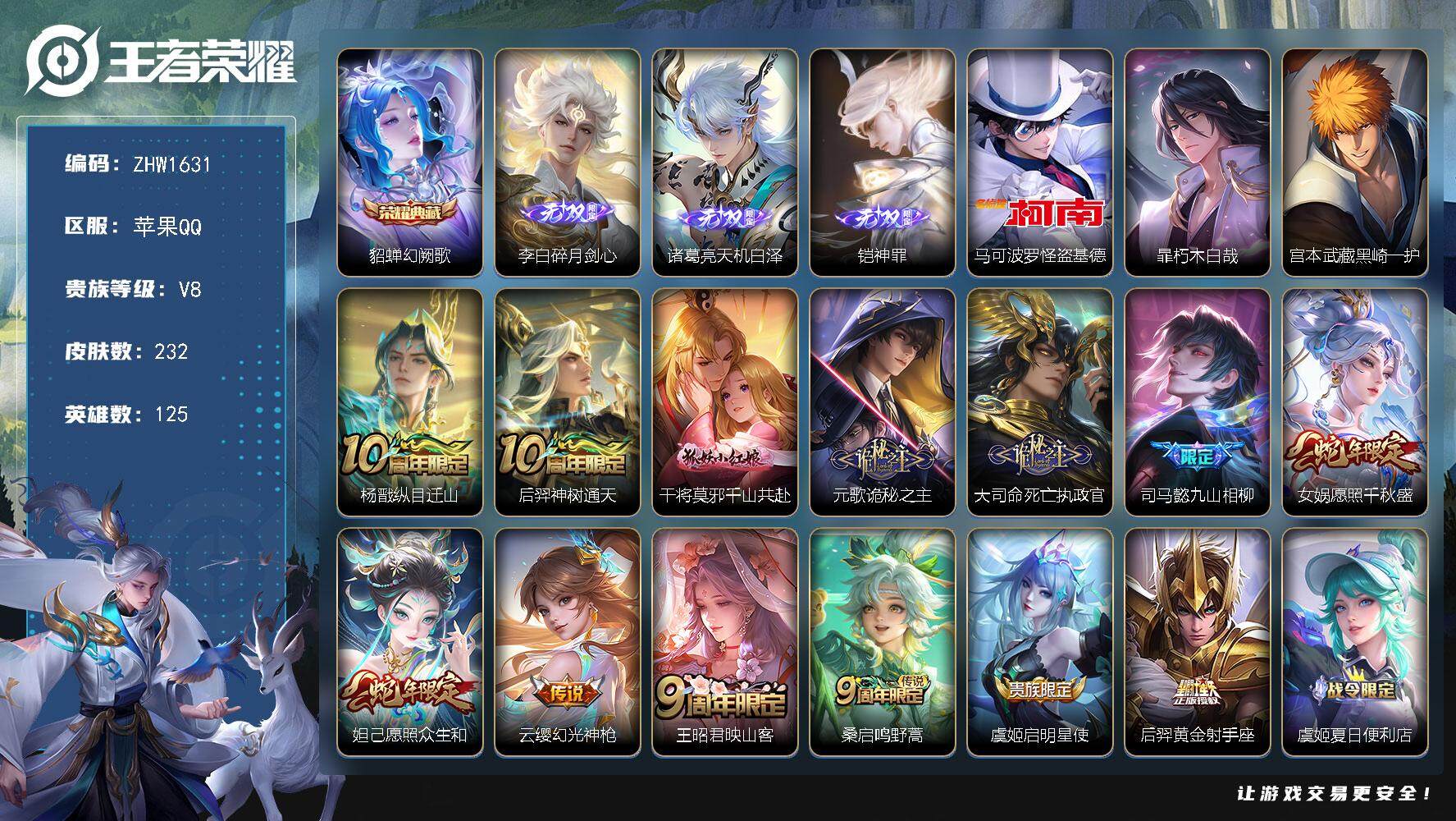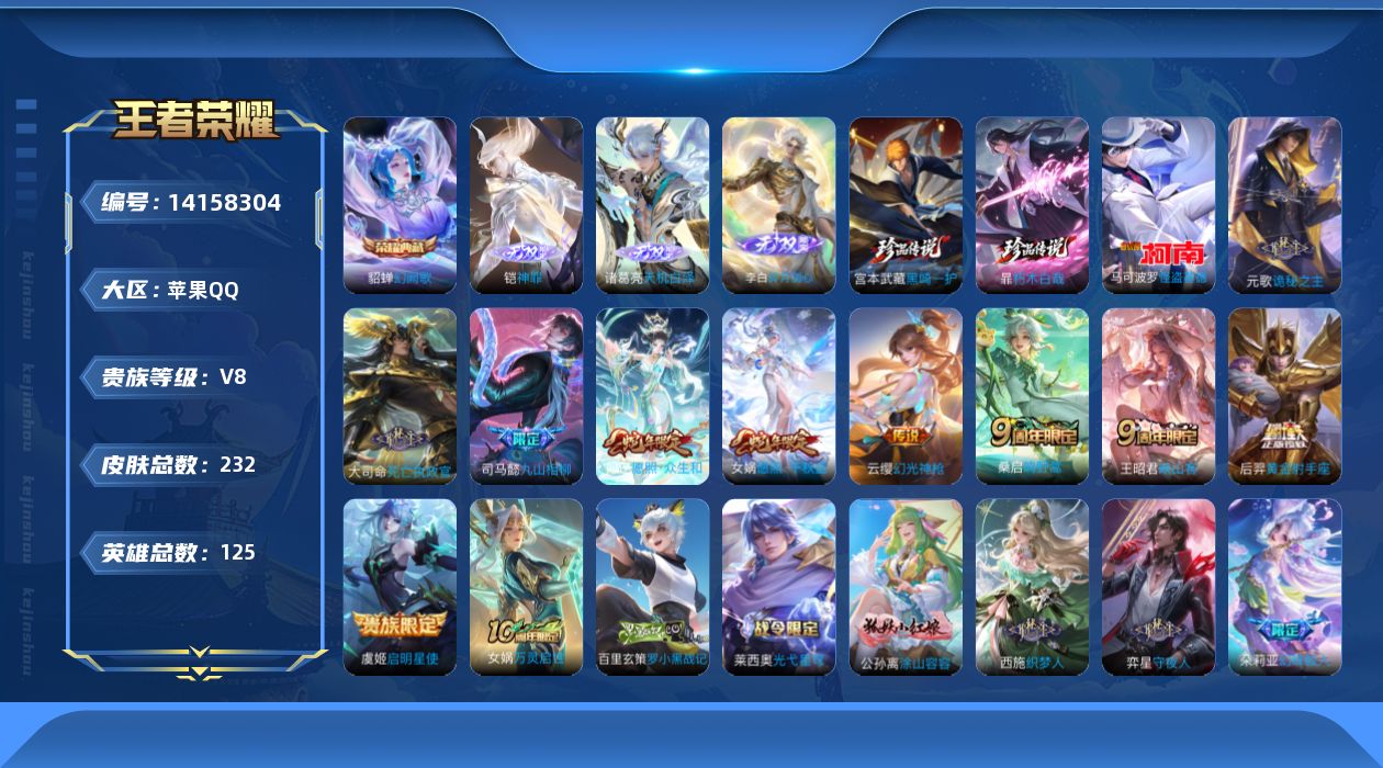 [14158304]【店主推荐捡漏号!可直接换绑/省50奕星】:苹果Q-V8-至尊星耀II段位-125英雄-232皮肤-1典藏-3无双-3珍品传说-13传说-70史诗