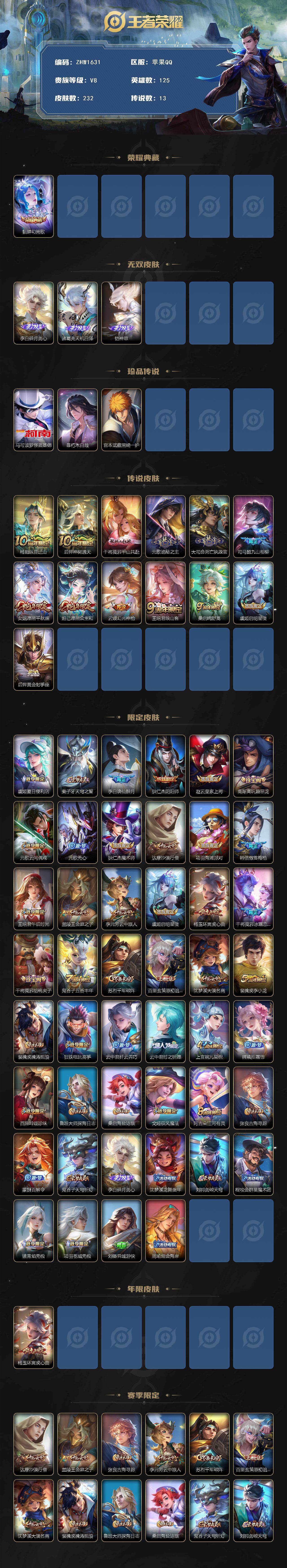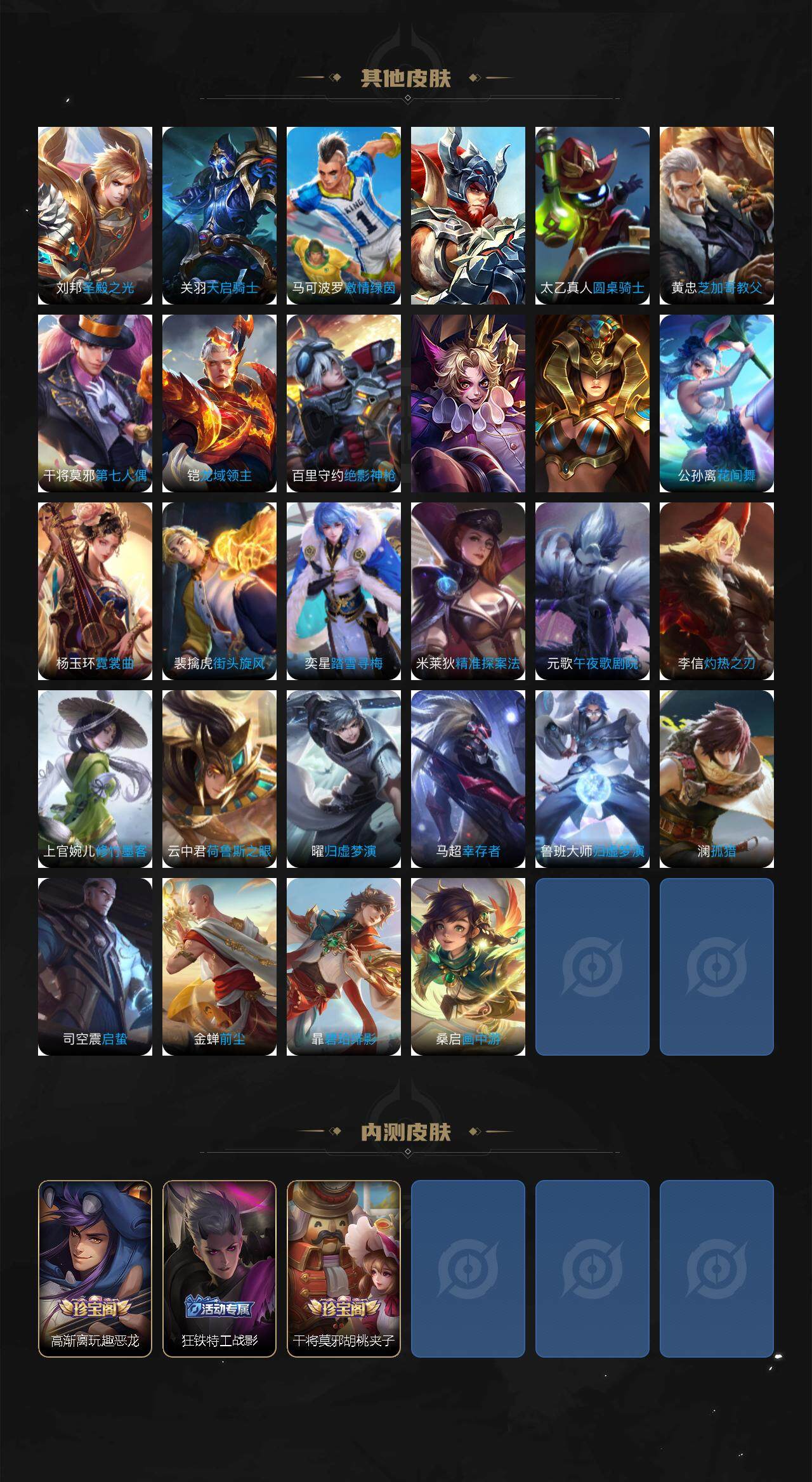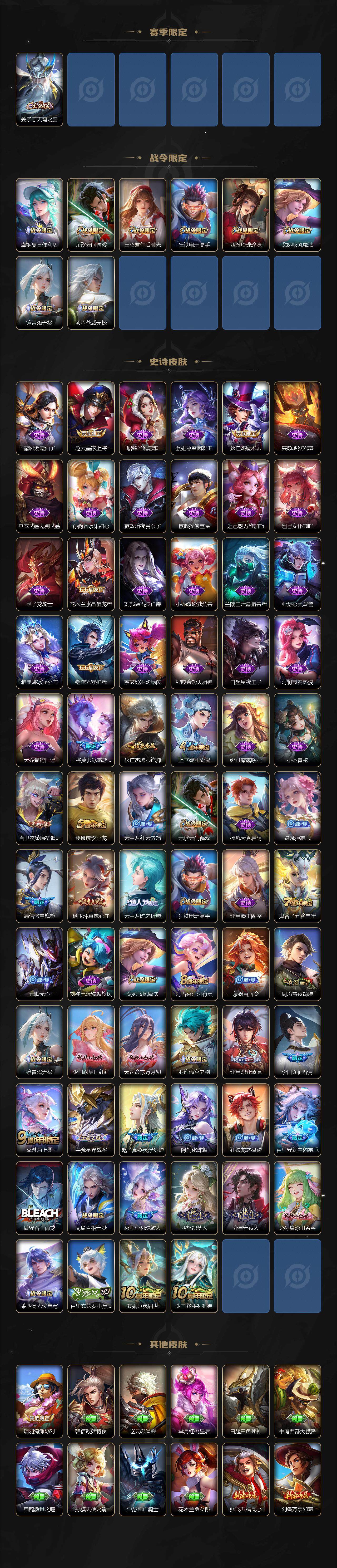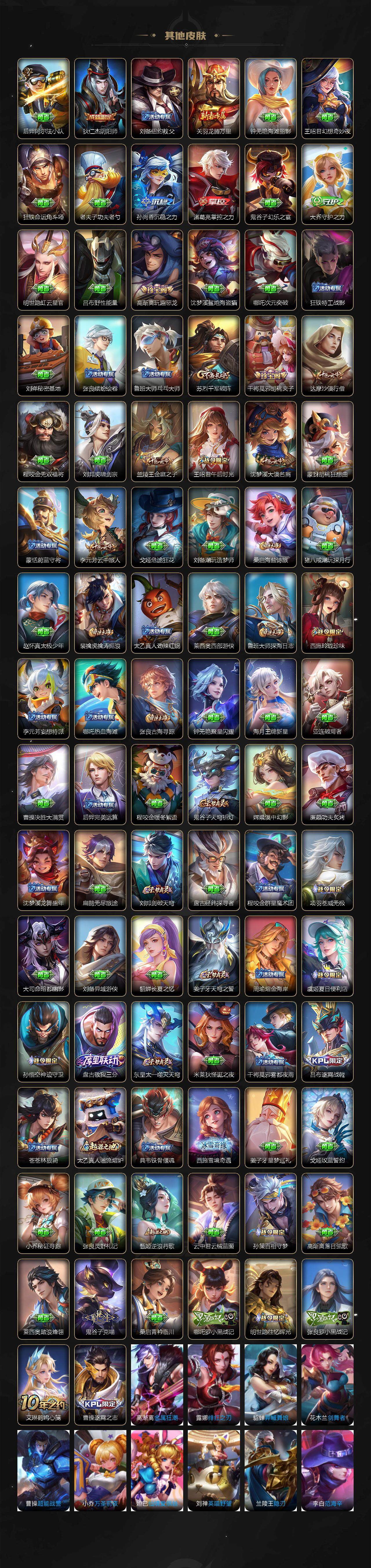 【限定皮肤】:虞姬夏日便利店,姜子牙天穹之誓,李白谪仙醉月,狄仁杰阴阳师,赵云皇家上将,高渐离玩趣恶龙,元歌云间偶戏,元歌无心,狄仁杰魔术师,达摩沙漠行僧,项羽海滩派对,韩信傲雪梅枪,王昭君午后时光,兰陵王金庭之子,李元芳云中旅人,虞姬启明星使,杨玉环寅虎心曲,干将莫邪冰霜恋舞曲,干将莫邪胡桃夹子,鬼谷子五谷丰年,苏烈千军破阵,百里玄策原初追逐者,沈梦溪大漠名商,裴擒虎李小龙,裴擒虎擒涛扼浪,狂铁电玩高手,云中君纤云弄巧,云中君时之祈愿,上官婉儿梁祝,嫦娥拒霜思,西施玲珑珍味,鲁班大师探海日志,桑启海盐诗旅,戈娅驭风魔法,阿古朵江河有灵,张良古海寻踪,蒙犽百解令,鬼谷子天穹祈灯,李白碎月剑心,沈梦溪龙舞盛年,刘邦剑破天穹,程咬金群星魔术团,镜青焰无极,项羽苍威无极,刘备异域游侠,周瑜熔金海岸