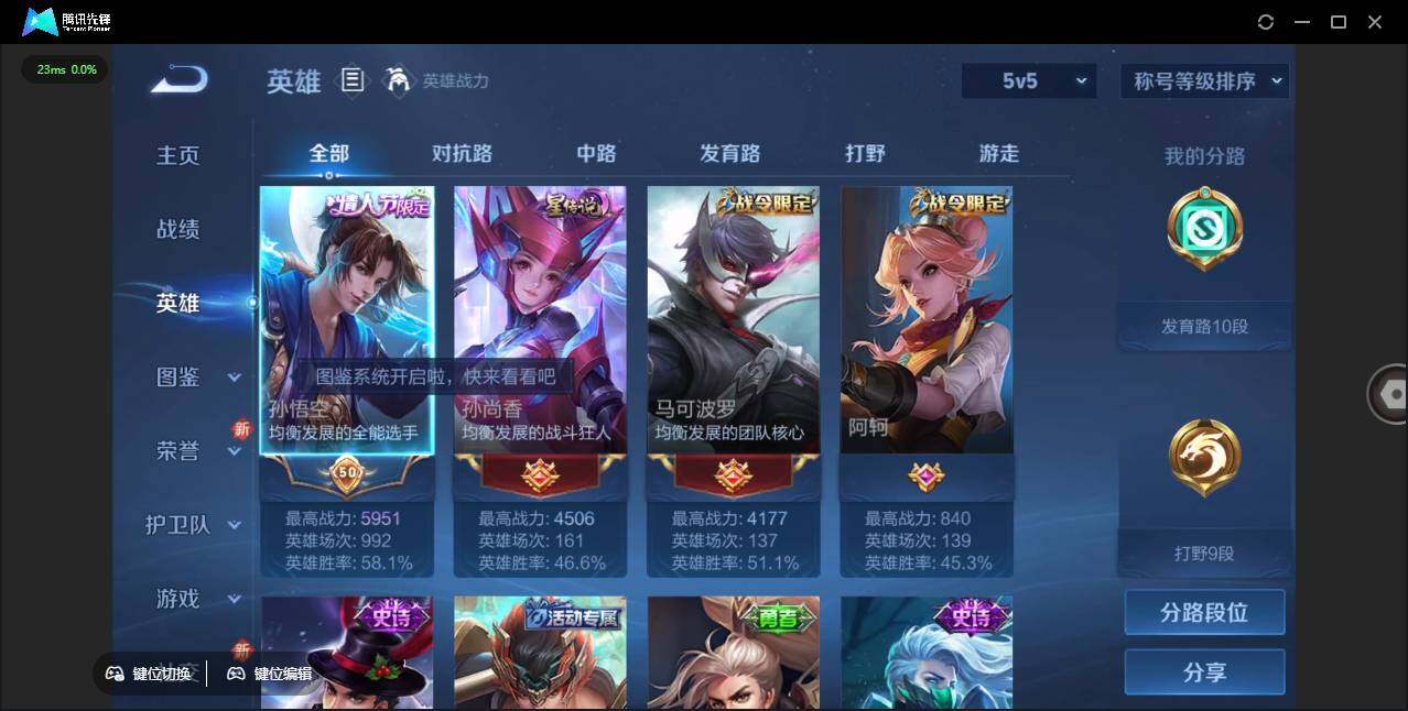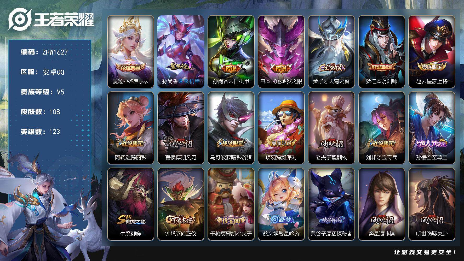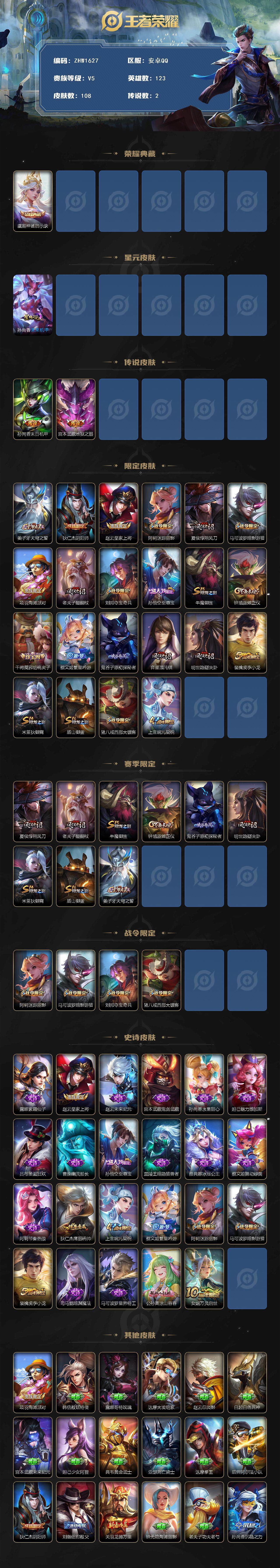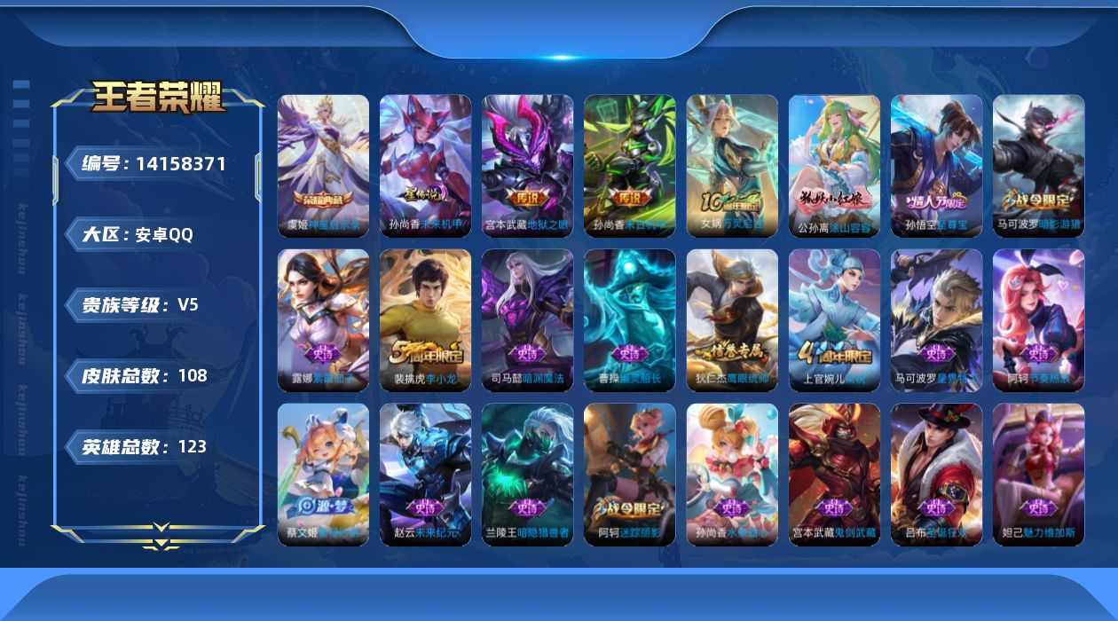 [14158371]【店主推荐捡漏号!可直接换绑】安卓Q-V5-至尊星耀II段位-123英雄-108皮肤-1典藏-1星传说-2传说-23史诗