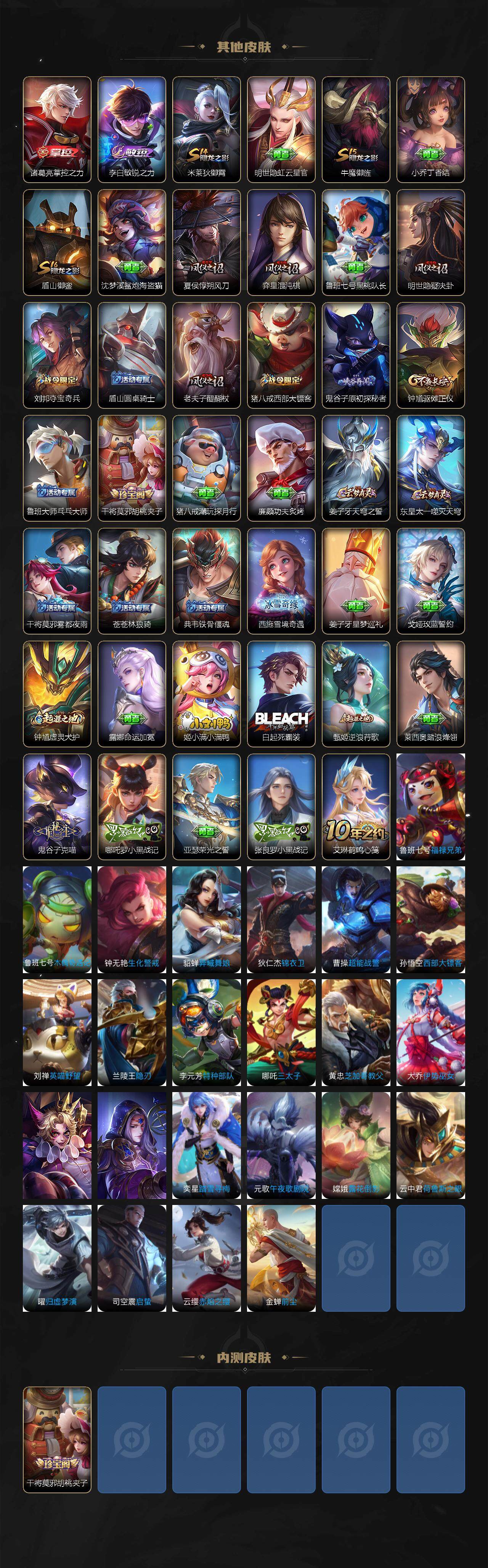 【其他皮肤】:项羽海滩派对,韩信教廷特使,露娜哥特玫瑰,达摩大发明家,赵云忍炎影,白起白色死神,宫本武藏未来纪元,妲己少女阿狸,典韦黄金武士,亚瑟死亡骑士,达摩拳王,后羿阿尔法小队,狄仁杰阴阳师,刘备纽约教父,关羽龙腾万里,钟无艳海滩丽影,老夫子功夫老勺,孙尚香沉稳之力,诸葛亮掌控之力,李白敏锐之力,米莱狄御霄,明世隐虹云星官,牛魔御旌,小乔丁香结,盾山御銮,沈梦溪鲨炮海盗猫,夏侯惇朔风刀,弈星混沌棋,鲁班七号黑桃队长,明世隐疑决卦,刘邦夺宝奇兵,盾山圆桌骑士,老夫子醍醐杖,猪八戒西部大镖客,鬼谷子原初探秘者,钟馗驱傩正仪,鲁班大师乓乓大师,干将莫邪胡桃夹子,猪八戒潮玩探月行,廉颇功夫炙烤,姜子牙天穹之誓,东皇太一噬灭天穹,干将莫邪雾都夜雨,苍苍林狼骑,典韦铁骨偃魂,西施雪境奇遇,姜子牙星梦巡礼,戈娅玫蓝誓约,钟馗虚灵犬护,露娜命运加冕,姬小满小满鸭,白起死霸装,甄姬逆浪荇歌,莱西奥踏浪烽翎,鬼谷子克喵,哪吒罗小黑战记,亚瑟荣光之誓,张良罗小黑战记,艾琳鹤鸣心笺