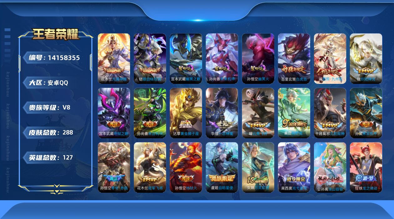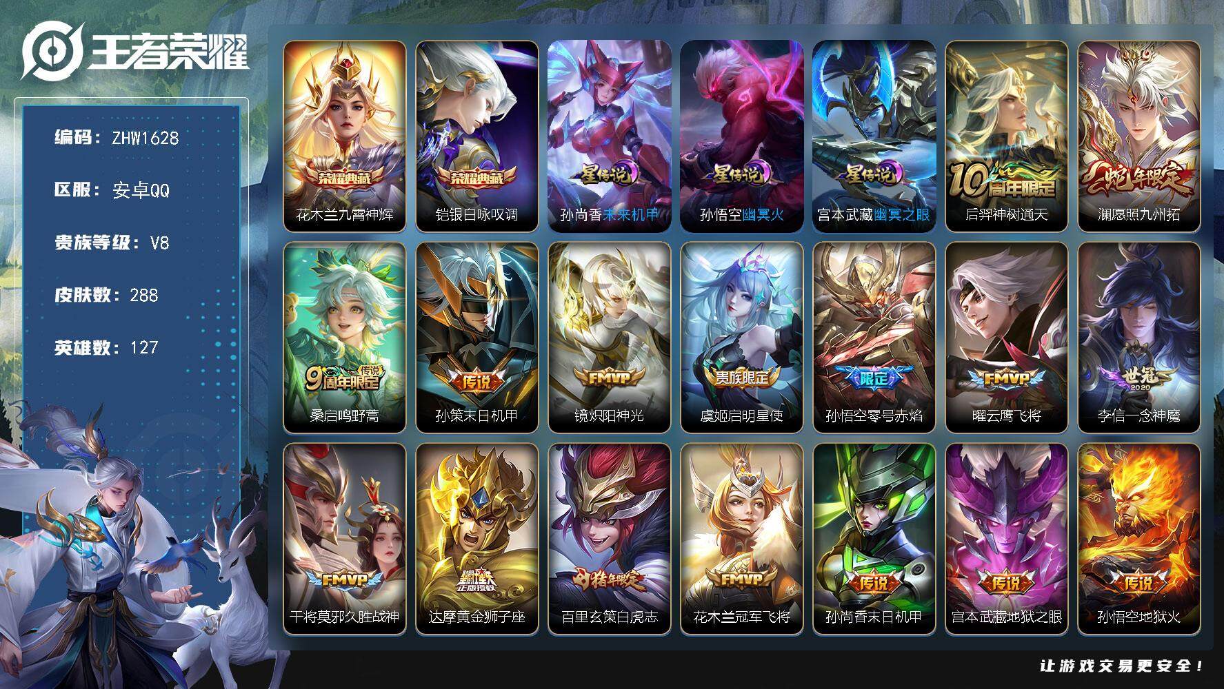 [14158355]【店主推荐捡漏号!可直接换绑】小国1.2w姬小满 1.1w狂铁 1.1w亚连 万战孙策 对抗路63段 打野39段 安卓Q-V8-最强王者段位-127英雄-288皮肤-2典藏-3星传说-16传说-100史诗 【英雄全皮】:鬼谷子全皮,蒙恬全皮,影全皮 【荣耀典藏】:花木兰九霄神辉,铠银白咏叹调 【传说皮肤】:后羿神树通天,澜愿照九州拓,桑启鸣野蒿,孙策末日机甲,镜炽阳神光,虞姬启明星使,孙悟空零号赤焰,曜云鹰飞将,李信一念神魔,干将莫邪久胜战神,达摩黄金狮子座,百里玄策白虎志,花木兰冠军飞将,孙尚香末日机甲,宫本武藏地狱之眼,孙悟空地狱火 【限定皮肤】:蔡文姬夏日便利店,虞姬夏日便利店,姜子牙天穹之誓,狄仁杰阴阳师,赵云皇家上将,嬴政优雅恋人,庄周高山流水,高渐离死亡摇滚,高渐离玩趣恶龙,阿轲迷踪丽影,钟无艳王者之锤,钟无艳超时空战士,芈月幻夜卜梦,吕布御风骁将,元歌云间偶戏,元歌无心,甄姬落雪兰心,马可波罗暗影游猎,狄仁杰魔术师,狄仁杰万华元夜,达摩星际陆战队,达摩沙漠行僧,项羽海滩派对,老夫子醍醐杖,程咬金演武夺筹,刘邦夺宝奇兵,兰陵王金庭之子,花木兰青春决赛季,亚瑟潮玩骑士王,孙悟空至尊宝,孙悟空大圣娶亲,孙悟空零号赤焰,张飞虎魄,李元芳云中旅人,虞姬启明星使,钟馗驱傩正仪,杨玉环遇见飞天,干将莫邪冰霜恋舞曲,雅典娜单词大作战,雅典娜黎明之约,蔡文姬繁星吟游,太乙真人华丽摇滚,鬼谷子原初探秘者,鬼谷子五谷丰年,黄忠火炮绅士,铠青龙志,苏烈千军破阵,百里玄策白虎志,百里玄策原初追逐者,弈星混沌棋,梦奇顽趣,沈梦溪星空之诺,沈梦溪大漠名商,明世隐疑决卦,裴擒虎李小龙,米莱狄胡桃异想国,云中君纤云弄巧,猪八戒西部大镖客,上官婉儿天狼绘梦者,嫦娥拒霜思,西施玲珑珍味,蒙犽狂想玩偶喵,鲁班大师探海日志,镜匿光追影者,桑启海盐诗旅,戈娅驭风魔法,艾琳流音漫舞,司空震地狱燃心,阿古朵江河有灵,张良古海寻踪,蒙恬荣光圣徽,高渐离燃音魔法,妲己灵卜魔法,鬼谷子天穹祈灯,姬小满妄想食味,沈梦溪龙舞盛年,刘邦剑破天穹,程咬金群星魔术团,周瑜熔金海岸 【年限皮肤】:百里玄策白虎志,铠青龙志,吕布御风骁将,张飞虎魄 【赛季限定】:狄仁杰万华元夜,达摩沙漠行僧,老夫子醍醐杖,程咬金演武夺筹,兰陵王金庭之子,张良古海寻踪,李元芳云中旅人,钟馗驱傩正仪,雅典娜黎明之约,鬼谷子原初探秘者,苏烈