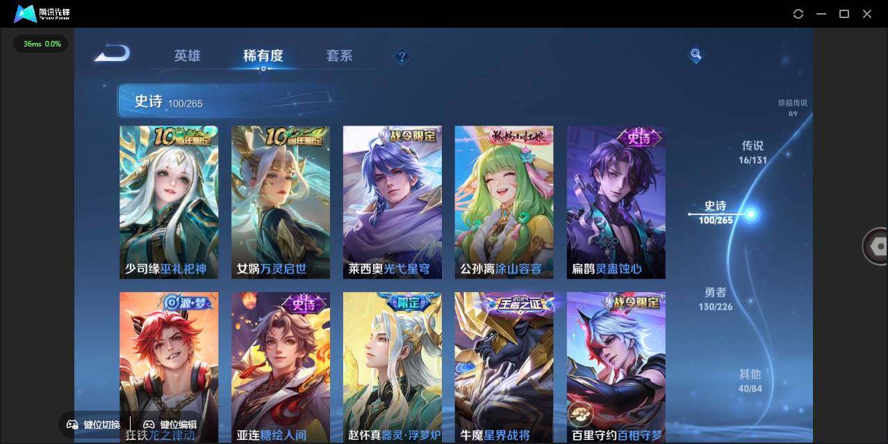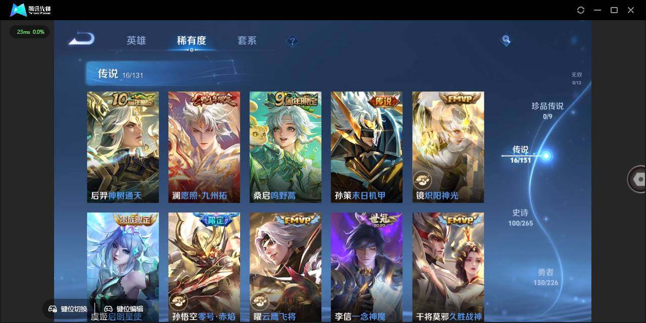- PX_2096217-81 安卓QQ/最强王者/272皮肤/125英雄/1典藏/0珍品无双/0无双/1珍品传说/12传说/68史诗/9稀有英雄 【1 珍品传说】时之奇旅 孙策, 【1 典藏皮肤】鸣剑·曳影 李白, 【12 传说皮肤】武圣 关羽,无双飞将 马超,地狱火 孙悟空,云鹰飞将 曜,霜月吟 露娜,久胜战神 干将莫邪,绛天战甲 铠,霜北刀 夏侯惇,冥王哈迪斯 铠,黄金白羊座 张良,幻光神枪 云