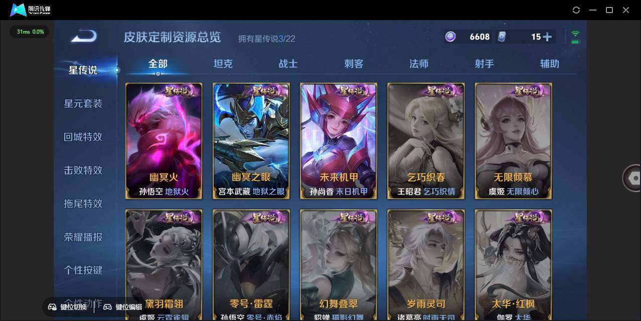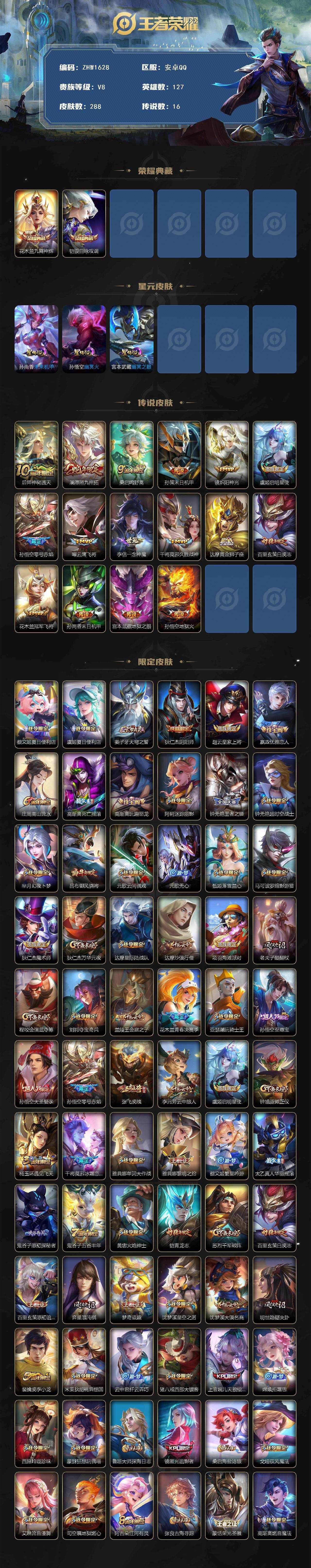 - [12090201]V8 1典藏 17传说 125英雄 365皮肤 可修改实名 优质装备:杀手不太冷,黄金射手座,云鹰飞将(小将军),一念神魔,云霓雀翎,末日机甲-孙尚香(绿蚂蚱),零号·赤焰,地狱之眼,游龙清影(小青龙),末日机甲-孙策,涂山容容 传说皮:乘龙·铭钟鼎(赵云年限),九山相柳,云诺千山 珍宝阁皮:妄想食味,优雅恋人,玩趣恶龙 限定皮:鸣野蒿,至尊宝,时雨天司(水龙头),神威(电光马子),飞衡(韩信年限),遇见飞天,高山流水,诗剑行,降魔,五谷丰年,青龙志(铠年限),游园惊梦,梁祝,御风骁将(吕布年限),烈魂,岱宗(典韦年限),李小龙,朱雀志(守约年限),孙行者,猪悟能,大圣娶亲,匿光追影者,寅虎·御盾(廉颇年限),深海之息(深海大菠萝),山海·玄木吟(马可年限) 史诗皮:化蝶舞,星界战将,龙之律动,石田雨龙,百相守梦-周瑜,茶境仙,怒海争锋,琥珀纪元伽罗,蔬乡物语(鲁班七号),百相守梦-黄忠,紫霞仙子,苍穹之光,白龙吟,黄金分割率,特工魅影,千年之狐,江河有灵,雪夜绮愿(周瑜),百解令(蒙犽),高渐离燃音魔法,蒙恬荣光圣徽,青蛇,偶像歌手,晚萤,龙骑士(小龙虾),末日机甲-吕布,猫狗日记-孙策,猫狗日记-大乔,时之恋人-孙尚香,乱世虎臣,节奏热浪,修罗,女仆咖啡,摇滚巨星,水果甜心,绅士熊喵,天才门将,星夜王子,心灵骇客,功夫厨神,德古拉伯爵,暗隐猎兽者,幽灵船长,鬼剑武藏,暗渊魔法,心灵战警,天秀·启明,舞动绿茵,地狱岩魂,纤云弄巧,拒霜思,缤纷独角兽,乘风破浪,逐浪之夏,龙鼓争鸣,月团寄思,水晶猎龙者,曙光守护者,箭羽风息,金属风暴,原初追逐者,圣诞狂欢,圣诞恋歌,鹰眼统帅,暗夜贵公子,魅力维加斯,黎明之约,赏金猎手,寅虎·御盾,无心,未来纪元-赵云