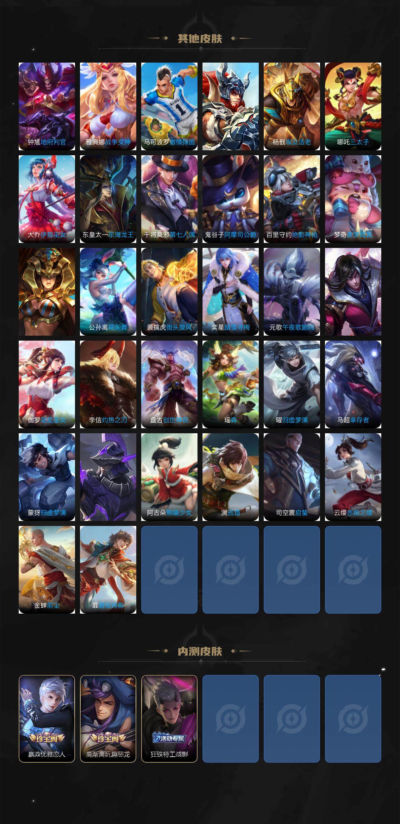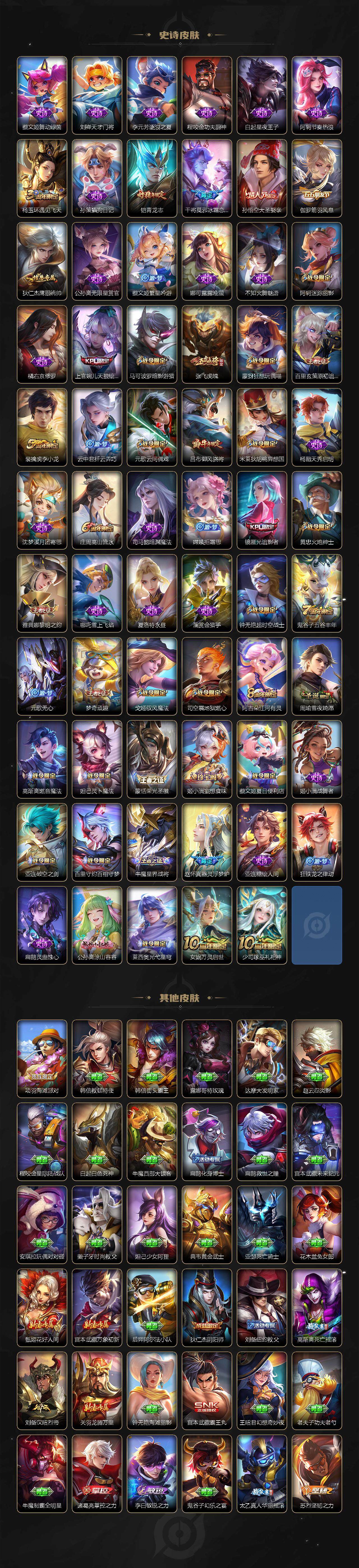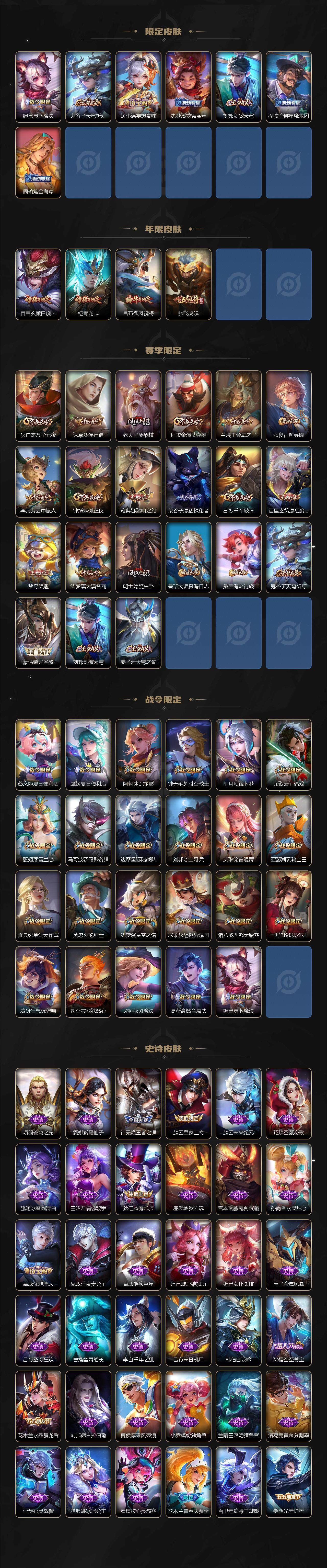 【限定皮肤】:蔡文姬夏日便利店,虞姬夏日便利店,姜子牙天穹之誓,狄仁杰阴阳师,赵云皇家上将,嬴政优雅恋人,庄周高山流水,高渐离死亡摇滚,高渐离玩趣恶龙,阿轲迷踪丽影,钟无艳王者之锤,钟无艳超时空战士,芈月幻夜卜梦,吕布御风骁将,元歌云间偶戏,元歌无心,甄姬落雪兰心,马可波罗暗影游猎,狄仁杰魔术师,狄仁杰万华元夜,达摩星际陆战队,达摩沙漠行僧,项羽海滩派对,老夫子醍醐杖,程咬金演武夺筹,刘邦夺宝奇兵,兰陵王金庭之子,花木兰青春决赛季,亚瑟潮玩骑士王,孙悟空至尊宝,孙悟空大圣娶亲,孙悟空零号赤焰,张飞虎魄,李元芳云中旅人,虞姬启明星使,钟馗驱傩正仪,杨玉环遇见飞天,干将莫邪冰霜恋舞曲,雅典娜单词大作战,雅典娜黎明之约,蔡文姬繁星吟游,太乙真人华丽摇滚,鬼谷子原初探秘者,鬼谷子五谷丰年,黄忠火炮绅士,铠青龙志,苏烈千军破阵,百里玄策白虎志,百里玄策原初追逐者,弈星混沌棋,梦奇顽趣,沈梦溪星空之诺,沈梦溪大漠名商,明世隐疑决卦,裴擒虎李小龙,米莱狄胡桃异想国,云中君纤云弄巧,猪八戒西部大镖客,上官婉儿天狼绘梦者,嫦娥拒霜思,西施玲珑珍味,蒙犽狂想玩偶喵,鲁班大师探海日志,镜匿光追影者,桑启海盐诗旅,戈娅驭风魔法,艾琳流音漫舞,司空震地狱燃心,阿古朵江河有灵,张良古海寻踪,蒙恬荣光圣徽,高渐离燃音魔法,妲己灵卜魔法,鬼谷子天穹祈灯,姬小满妄想食味,沈梦溪龙舞盛年,刘邦剑破天穹,程咬金群星魔术团,周瑜熔金海岸