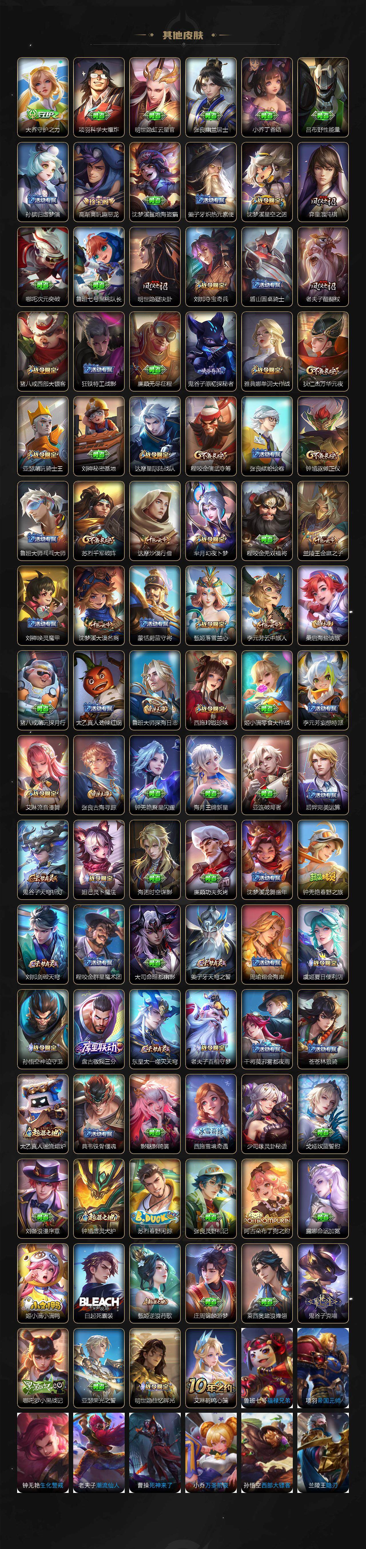 娜可露露晚萤,伽罗箭羽风息,李元芳逐浪之夏,不知火舞魅语,公孙离无限星赏官,孙策猫狗日记,阿轲节奏热浪,露娜紫霞仙子,诸葛亮黄金分割率,王昭君偶像歌手,韩信白龙吟,项羽苍穹之光,雅典娜冰冠公主,吕布末日机甲,橘右京修罗,嬴政摇滚巨星,刘禅天才门将,白起星夜王子,安琪拉心灵骇客,程咬金功夫厨神,刘邦德古拉伯爵,兰陵王暗隐猎兽者,曹操幽灵船长,宫本武藏鬼剑武藏,司马懿暗渊魔法,亚瑟心灵战警,杨戬天秀·启明,蔡文姬舞动绿茵,廉颇地狱岩魂,小乔缤纷独角兽,夏侯惇乘风破浪,花木兰水晶猎龙者,铠曙光守护者,墨子金属风暴,百里玄策原初追逐者,吕布圣诞狂欢,貂蝉圣诞恋歌,百里守约特工魅影,嬴政暗夜贵公子,嫦娥拒霜思,雅典娜黎明之约,李白千年之狐,哪吒雪上飞焰,夏洛特永昼,澜赏金猎手,周瑜雪夜绮愿,高渐离燃音魔法,赵怀真器灵·浮梦炉,亚连糖绘人间