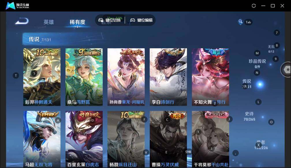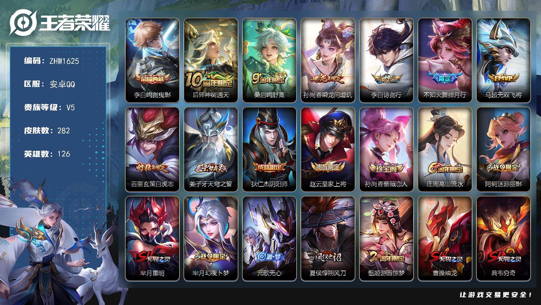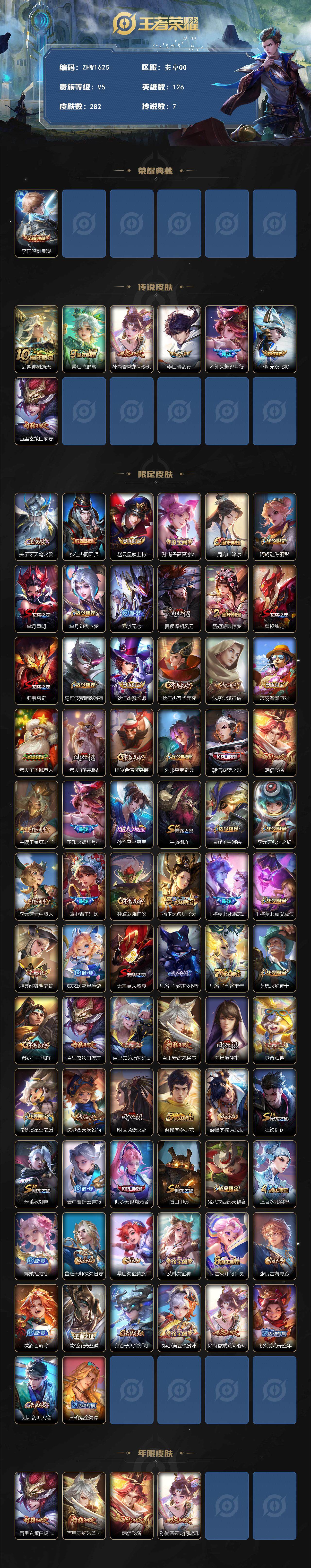 - [11685209]V7 5传说 125英雄 249皮肤 可修改实名 优质装备:久胜战神,涂山容容 传说皮:幻光神枪 珍宝阁皮:万物之道,优雅恋人 限定皮:愿照·九州拓(澜年限),愿照·山河定(司空震年限),逐霄战戟,鸣野蒿,至尊宝,遇见飞天,梁祝,一生所爱,大圣娶亲,引擎之心 史诗皮:器灵·浮梦炉,化蝶舞,星界战将,谪仙醉月,龙之律动,石田雨龙,怒海争锋,蒙犽顽岩魄,琥珀纪元伽罗,百相守梦-黄忠,紫霞仙子,白龙吟,黄金分割率,特工魅影,江河有灵,魅语,百解令(蒙犽),蒙恬荣光圣徽,冰冠公主,电玩·爆裂旋风,龙骑士(小龙虾),猫狗日记-孙策,修罗,女仆咖啡,摇滚巨星,水果甜心,星夜王子,功夫厨神,暗隐猎兽者,鬼剑武藏,舞动绿茵,地狱岩魂,纤云弄巧,拒霜思,乘风破浪,逐浪之夏,水晶猎龙者,曙光守护者,箭羽风息,金属风暴,原初追逐者,圣诞狂欢,圣诞恋歌,鹰眼统帅,魅力维加斯,未来纪元-赵云,玫瑰异探