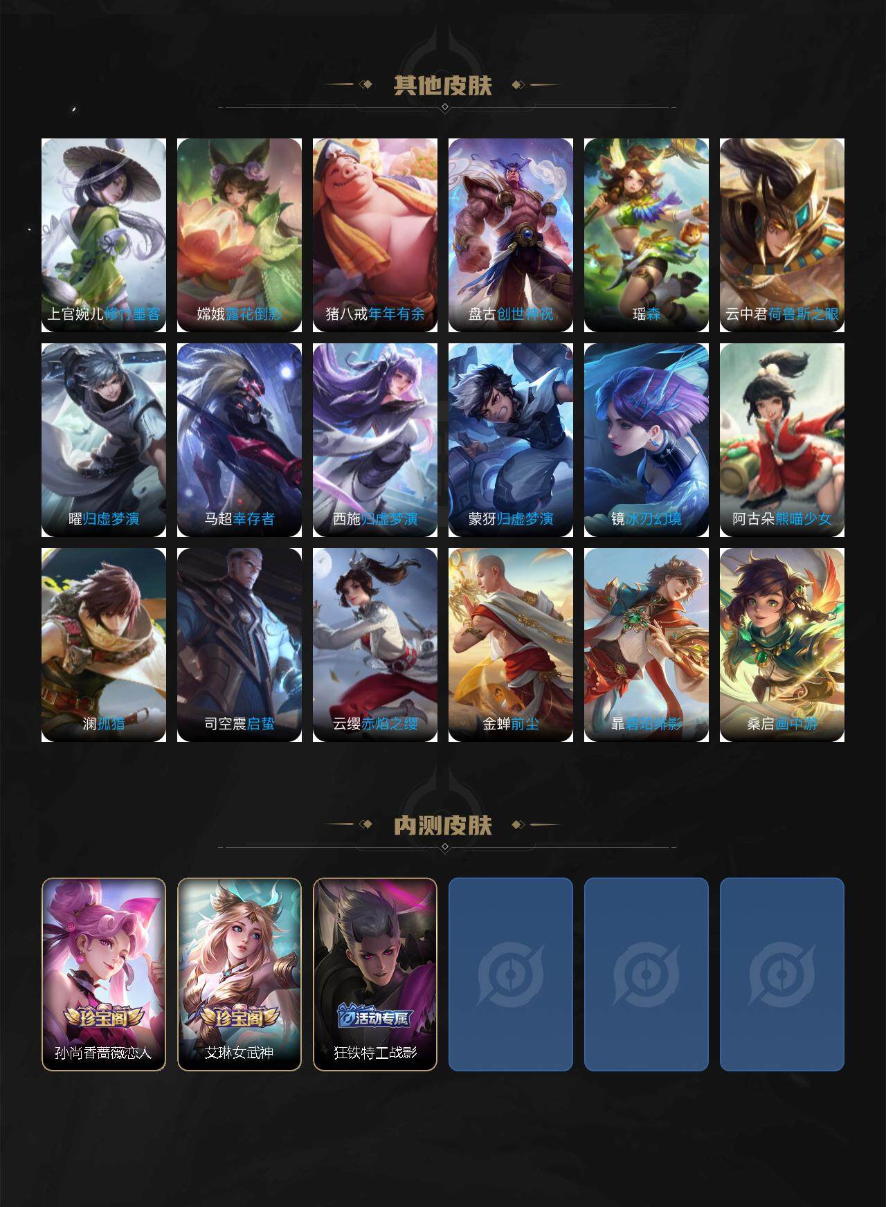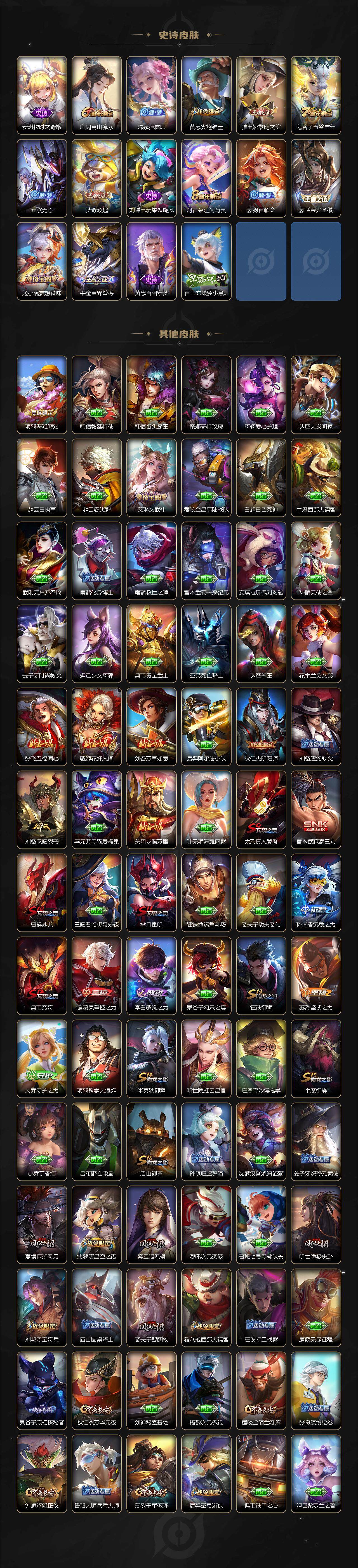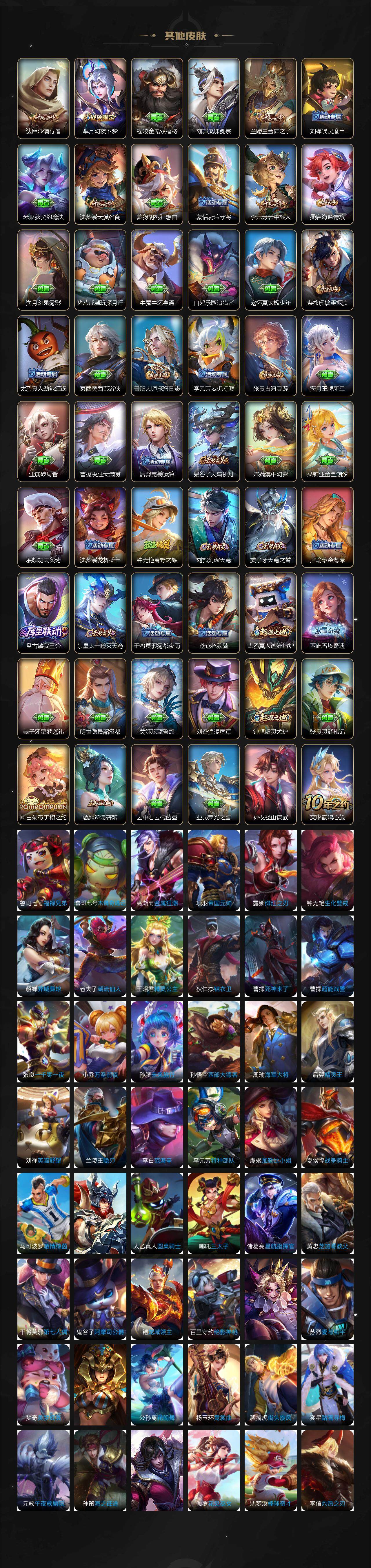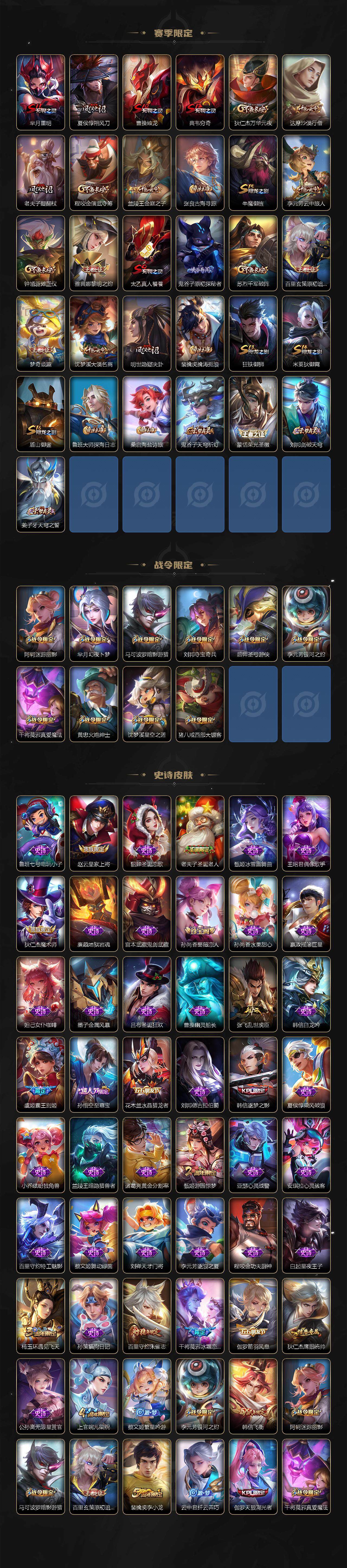 【限定皮肤】:姜子牙天穹之誓,狄仁杰阴阳师,赵云皇家上将,孙尚香蔷薇恋人,庄周高山流水,阿轲迷踪丽影,芈月重明,芈月幻夜卜梦,元歌无心,夏侯惇朔风刀,甄姬游园惊梦,曹操烛龙,典韦穷奇,马可波罗暗影游猎,狄仁杰魔术师,狄仁杰万华元夜,达摩沙漠行僧,项羽海滩派对,老夫子圣诞老人,老夫子醍醐杖,程咬金演武夺筹,刘邦夺宝奇兵,韩信逐梦之影,韩信飞衡,兰陵王金庭之子,不知火舞绯月行,孙悟空至尊宝,牛魔御旌,后羿圣弓游侠,李元芳银河之约,李元芳云中旅人,虞姬霸王别姬,钟馗驱傩正仪,杨玉环遇见飞天,干将莫邪冰霜恋舞曲,干将莫邪真爱魔法,雅典娜黎明之约,蔡文姬繁星吟游,太乙真人饕餮,鬼谷子原初探秘者,鬼谷子五谷丰年,黄忠火炮绅士,苏烈千军破阵,百里玄策白虎志,百里玄策原初追逐者,百里守约朱雀志,弈星混沌棋,梦奇顽趣,沈梦溪星空之诺,沈梦溪大漠名商,明世隐疑决卦,裴擒虎李小龙,裴擒虎擒涛扼浪,狂铁御狮,米莱狄御霄,云中君纤云弄巧,伽罗天狼溯光者,盾山御銮,猪八戒西部大镖客,上官婉儿梁祝,嫦娥拒霜思,鲁班大师探海日志,桑启海盐诗旅,艾琳女武神,阿古朵江河有灵,张良古海寻踪,蒙犽百解令,蒙恬荣光圣徽,鬼谷子天穹祈灯,姬小满妄想食味,孙尚香乘龙问璇玑,沈梦溪龙舞盛年,刘邦剑破天穹,周瑜熔金海岸