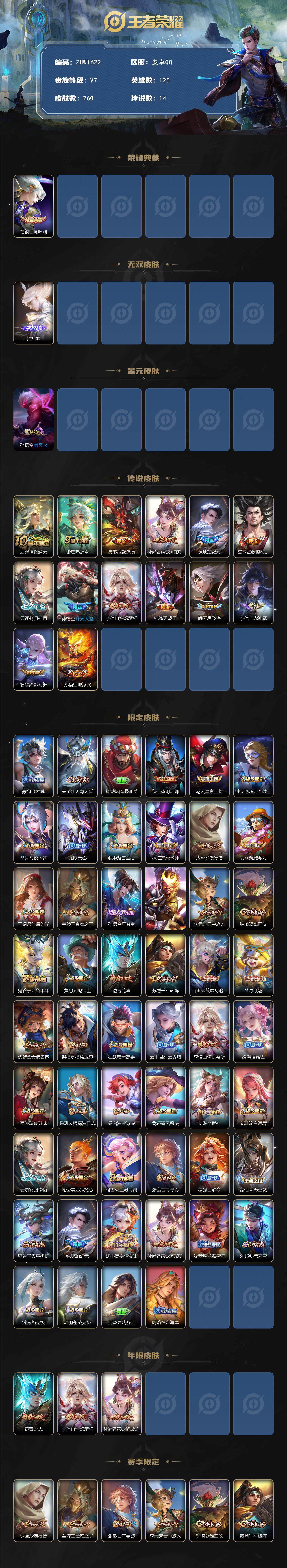 - [12705232]安卓Q-V7-永恒钻石V段位-123英雄-326皮肤-4典藏-0珍品无双-0无双-0珍品传说-23传说-98史诗 【荣耀典藏】:孙悟空全息碎影,夏侯惇无限飓风号,花木兰九霄神辉,韩信弑枪猎影 【内测皮肤】:艾琳女武神 【传说皮肤】:孙悟空地狱火,宫本武藏地狱之眼,孙尚香末日机甲,李白凤求凰,貂蝉仲夏夜之梦,诸葛亮武陵仙君,后羿黄金射手座,百里玄策白虎志,达摩黄金狮子座,虞姬云霓雀翎,貂蝉猫影幻舞,刘备时之恋人,李信一念神魔,曜云鹰飞将,虞姬启明星使,镜炽阳神光,李元芳飞鸢探春,赵云淬星耀世,孙策末日机甲,马超无双飞将,李白诗剑行,吕布怒海麟威,澜电玩雷克斯 【限定皮肤】:白起狰,狄仁杰阴阳师,虞姬凯尔特女王,赵云皇家上将,嬴政白昼王子,鲁班七号狮舞东方,庄周云端筑梦师,庄周高山流水,阿轲迷踪丽影,孙膑天狼运算者,扁鹊奇幻香踪,芈月重明,吕布猎兽之王,周瑜赤莲之焰,元歌云间偶戏,夏侯惇朔风刀,甄姬游园惊梦,曹操烛龙,典韦穷奇,典韦蓝屏警告,典韦岱宗,马可波罗逐梦之星,马可波罗暗影游猎,狄仁杰魔术师,狄仁杰万华元夜,达摩星际陆战队,达摩沙漠行僧,项羽海滩派对,老夫子醍醐杖,关羽冰锋战神,程咬金演武夺筹,露娜一生所爱,刘邦夺宝奇兵,韩信逐梦之影,韩信飞衡,兰陵王驯魔猎人,兰陵王金庭之子,花木兰瑞麟志,花木兰默契交锋,亚瑟潮玩骑士王,孙悟空至尊宝,孙悟空大圣娶亲,牛魔御旌,后羿如梦令,刘备百相守梦,李元芳银河之约,虞姬启明星使,钟馗神迹守卫,钟馗驱傩正仪,杨玉环遇见飞天,杨戬潮玩骑兵,女娲朔望之晖,干将莫邪冰霜恋舞曲,雅典娜单词大作战,蔡文姬繁星吟游,太乙真人饕餮,东皇太一逐梦之光,鬼谷子原初探秘者,诸葛亮武陵仙君,铠青龙志,百里玄策白虎志,百里玄策原初追逐者,百里守约朱雀志,弈星混沌棋,沈梦溪星空之诺,沈梦溪大漠名商,沈梦溪匿光破解者,明世隐疑决卦,裴擒虎天狼狩猎者,裴擒虎李小龙,裴擒虎擒涛扼浪,狂铁御狮,米莱狄御霄,米莱狄胡桃异想国,云中君纤云弄巧,盾山御銮,猪八戒西部大镖客,上官婉儿梁祝,嫦娥拒霜思,西施玲珑珍味,蒙犽狂想玩偶喵,鲁班大师探海日志,桑启海盐诗旅,戈娅驭风魔法,艾琳女武神,艾琳流音漫舞,司空震地狱燃心,阿古朵江河有灵,张良古海寻踪,蒙犽百解令,鬼谷子天穹祈灯,姬小满妄想食味,刘邦剑破天穹 【年限皮肤】:百里玄策白虎志,百里守约朱雀志,花木兰瑞麟志,铠青