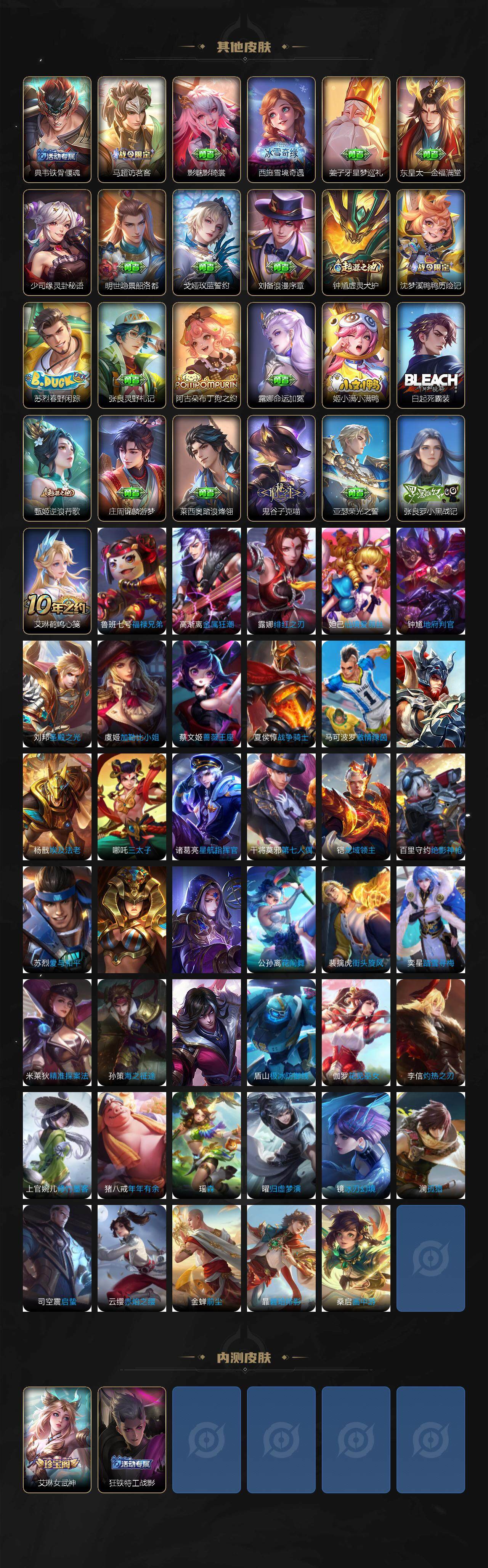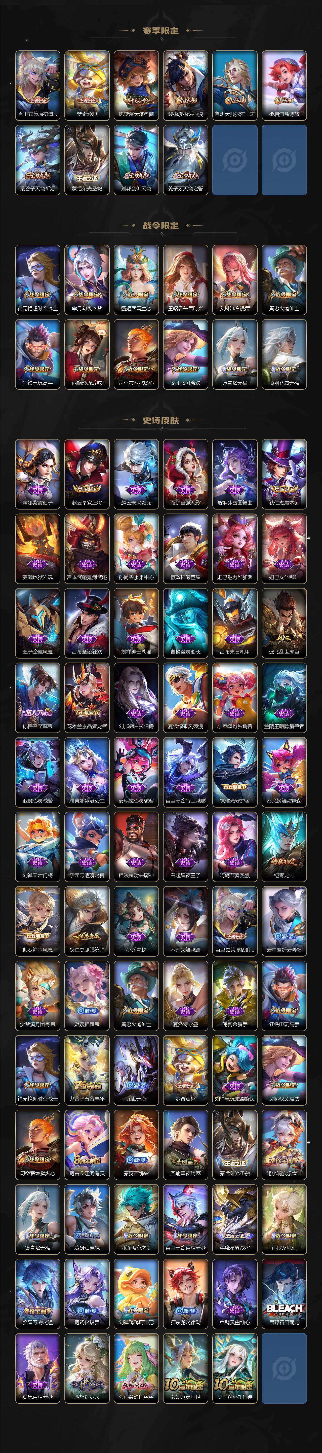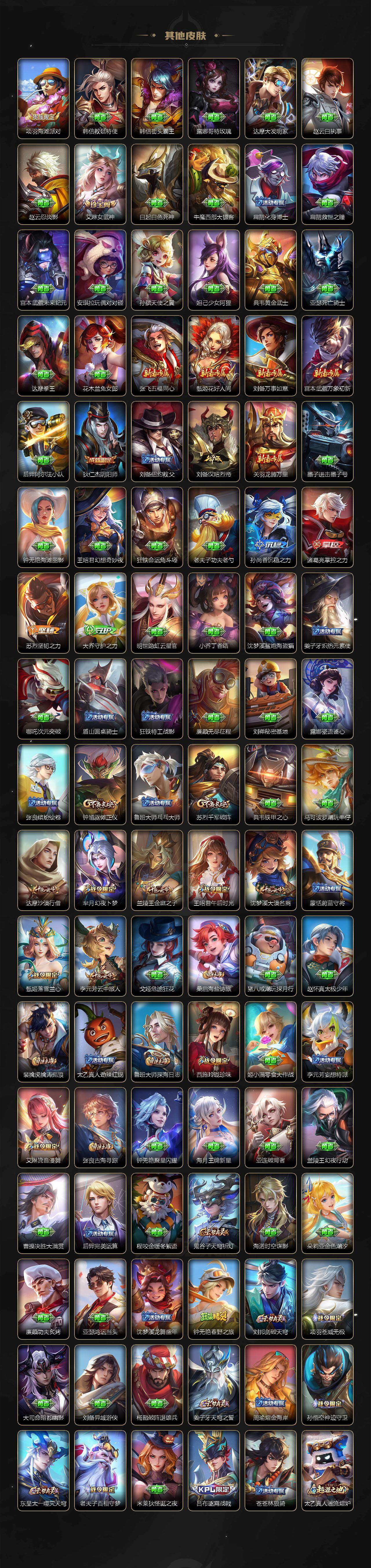 【限定皮肤】:蒙犽顽岩魄,姜子牙天穹之誓,杨戬破阵退雄兵,狄仁杰阴阳师,赵云皇家上将,钟无艳超时空战士,芈月幻夜卜梦,元歌无心,甄姬落雪兰心,狄仁杰魔术师,达摩沙漠行僧,项羽海滩派对,王昭君午后时光,兰陵王金庭之子,孙悟空至尊宝,孙悟空齐天大圣,李元芳云中旅人,钟馗驱傩正仪,鬼谷子五谷丰年,黄忠火炮绅士,铠青龙志,苏烈千军破阵,百里玄策原初追逐者,梦奇顽趣,沈梦溪大漠名商,裴擒虎擒涛扼浪,狂铁电玩高手,云中君纤云弄巧,李信山海炽霜斩,嫦娥拒霜思,西施玲珑珍味,鲁班大师探海日志,桑启海盐诗旅,戈娅驭风魔法,艾琳女武神,艾琳流音漫舞,云缨鹤归松栖,司空震地狱燃心,阿古朵江河有灵,张良古海寻踪,蒙犽百解令,蒙恬荣光圣徽,鬼谷子天穹祈灯,铠琥珀纪元,姬小满妄想食味,孙尚香乘龙问璇玑,沈梦溪龙舞盛年,刘邦剑破天穹,镜青焰无极,项羽苍威无极,刘备异域游侠,周瑜熔金海岸