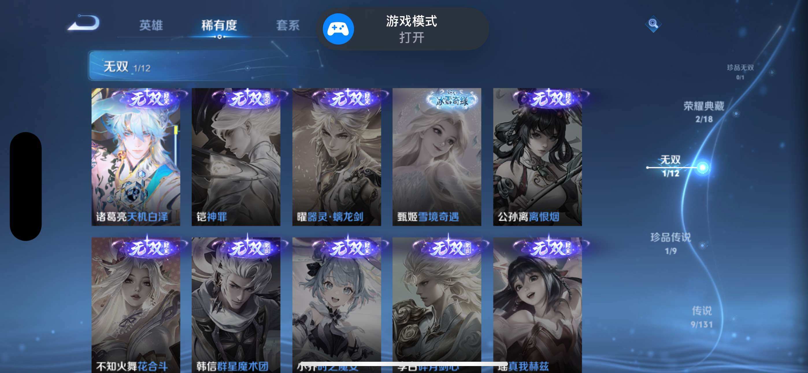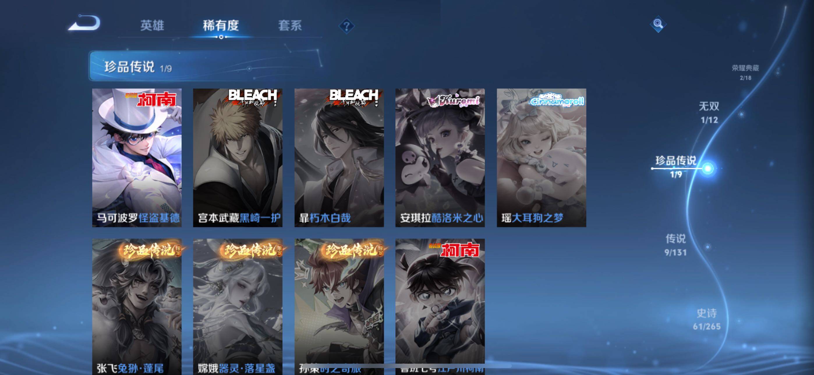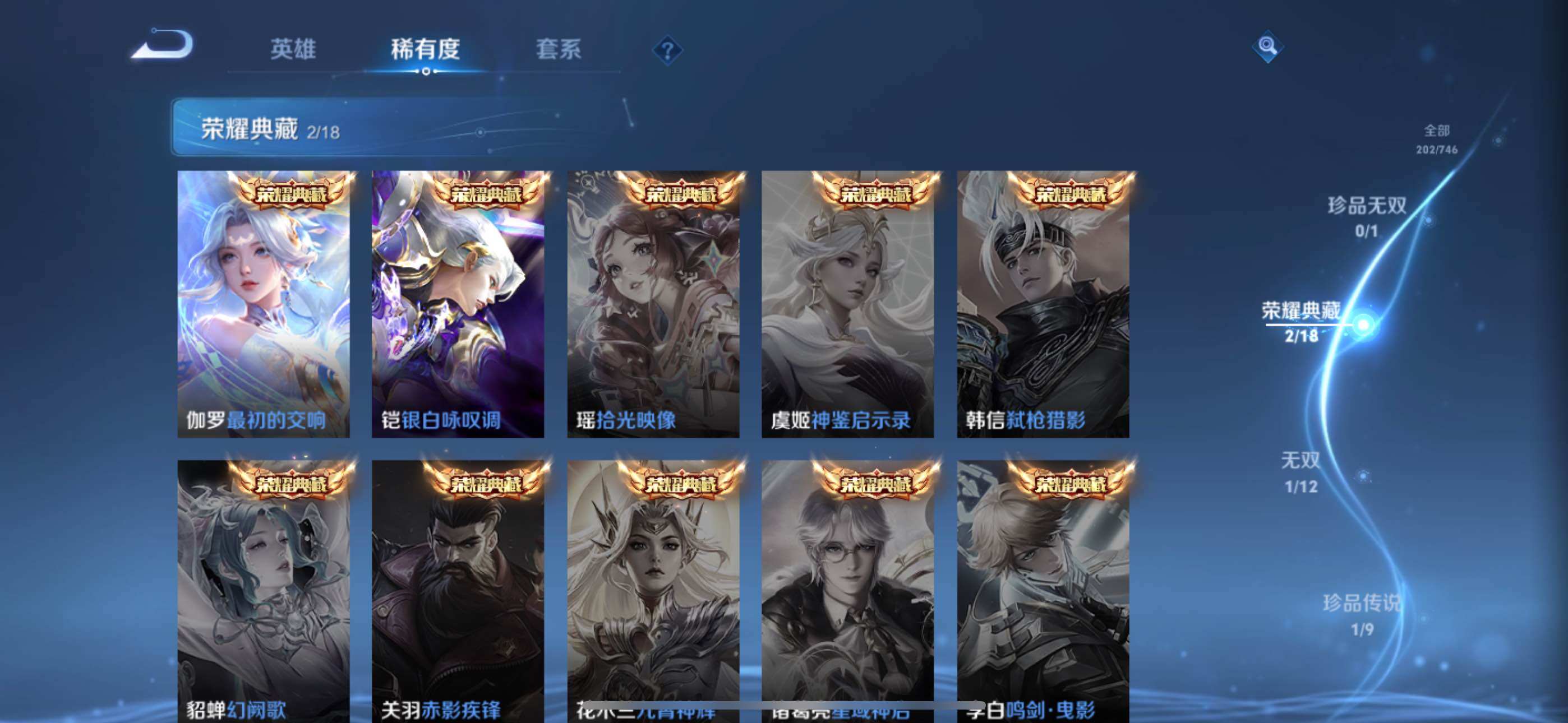 【史诗皮肤】:赵云皇家上将,赵云未来纪元,甄姬冰雪圆舞曲,狄仁杰魔术师,廉颇地狱岩魂,宫本武藏鬼剑武藏,孙尚香蔷薇恋人,孙尚香水果甜心,嬴政优雅恋人,嬴政摇滚巨星,妲己魅力维加斯,墨