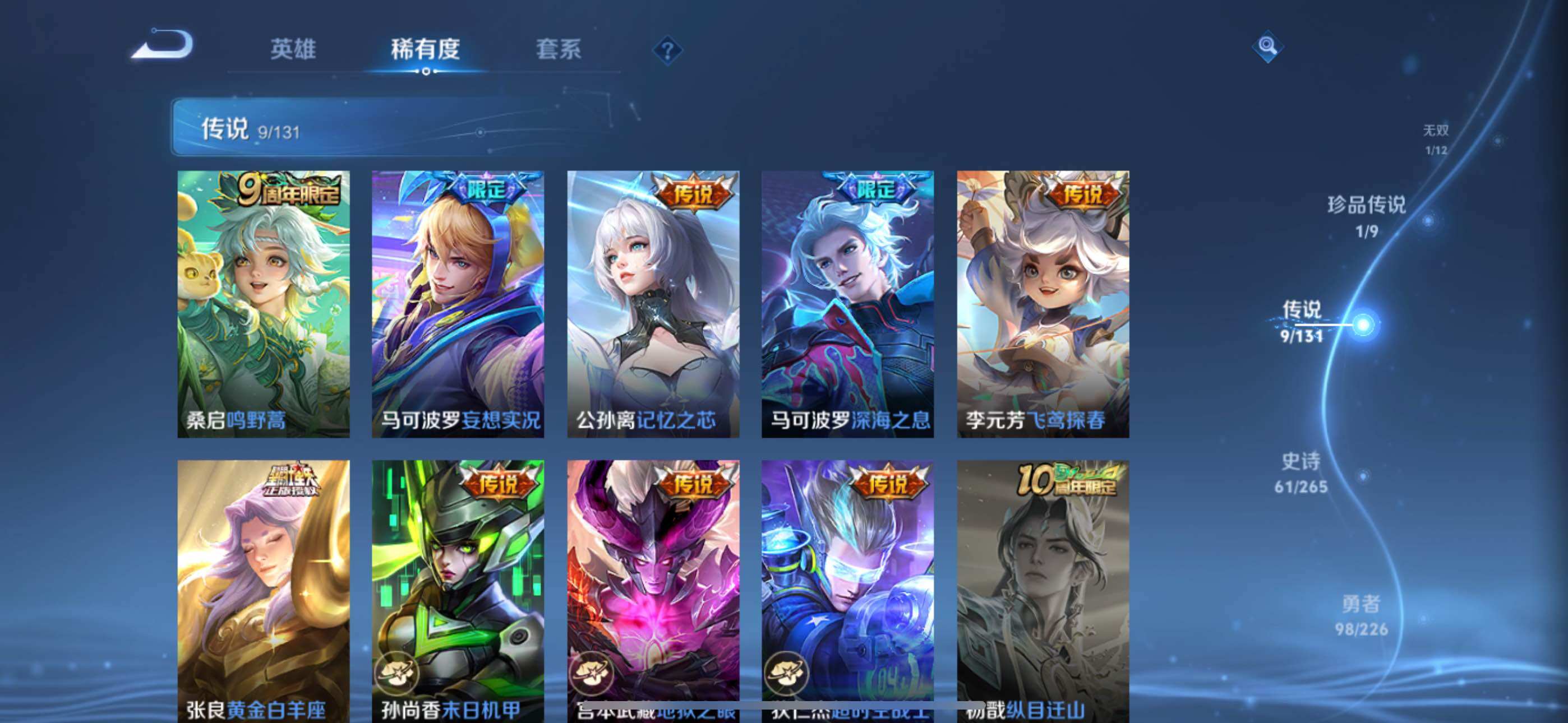 【传说皮肤】:桑启鸣野蒿,马可波罗妄想实况,公孙离记忆之芯,马可波罗深海之息,李元芳飞鸢探春,张良黄金白羊座,孙尚香末日机甲,宫本武藏地狱之眼,狄仁杰超时空战士