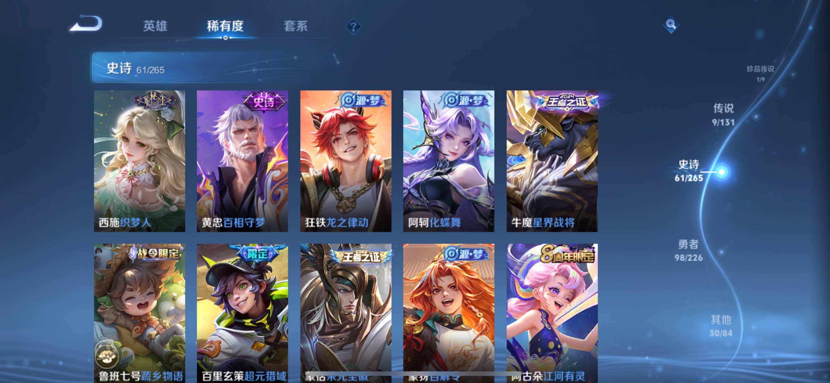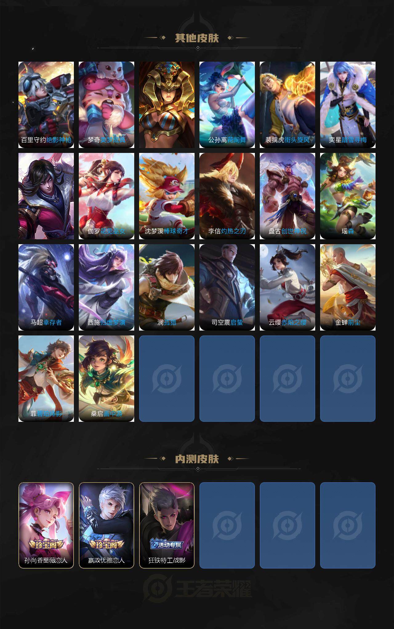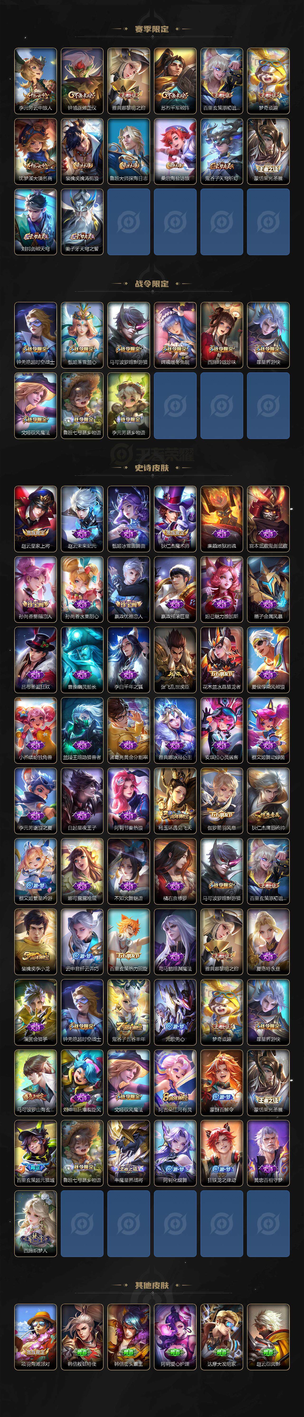 【赛季限定】:狄仁杰万华元夜,达摩沙漠行僧,老夫子醍醐杖,程咬金演武夺筹,兰陵王金庭之子,张良古海寻踪,李元芳云中旅人,钟馗驱傩正仪,雅典娜黎明之约,苏烈千军破阵,百里玄策原初追逐者,梦奇顽趣,沈梦溪大漠名商,裴擒虎擒涛扼浪,鲁班大师探海日志,桑启海盐诗旅,鬼谷子天穹祈灯,蒙恬荣光圣徽,刘邦剑破天穹,姜子牙天穹之誓