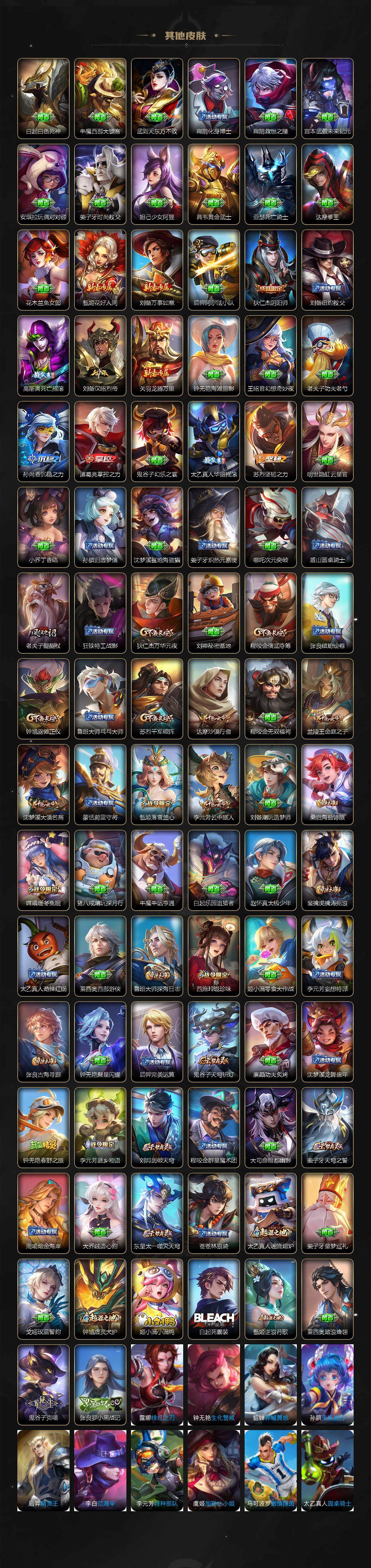 娜可露露晚萤,伽罗箭羽风息,李元芳逐浪之夏,不知火舞魅语,阿轲节奏热浪,诸葛亮黄金分割率,雅典娜冰冠公主,橘右京修罗,嬴政摇滚巨星,白起星夜王子,安琪拉心灵骇客,兰陵王暗隐猎兽者,曹操幽灵船长,宫本武藏鬼剑武藏,司马懿暗渊魔法,蔡文姬舞动绿茵,廉颇地狱岩魂,小乔缤纷独角兽,夏侯惇乘风破浪,花木兰水晶猎龙者,百里玄策热力回旋,墨子金属风暴,百里玄策原初追逐者,吕布圣诞狂欢,雅典娜黎明之约,李白千年之狐,夏洛特永昼,澜赏金猎手,刘禅电玩·爆裂旋风,蒙犽百解令