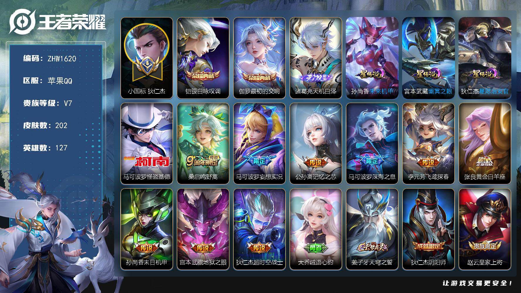 - [12039526]暑期末清货/特价急出/永久包赔【商品标题】:苹果Q-V8-永恒钻石IV段位-125英雄-318皮肤-1典藏-11传说-87史诗 【荣耀典藏】:夏侯惇无限飓风号 【内测皮肤】:嬴政优雅恋人,艾琳女武神,狂铁特工战影 【传说皮肤】:宫本武藏地狱之眼,孙尚香末日机甲,貂蝉仲夏夜之梦,达摩黄金狮子座,李信一念神魔,关羽武圣,虞姬启明星使,诸葛亮时雨天司,曜李逍遥 ,马超无双飞将,澜愿照九州拓 【限定皮肤】:蔡文姬夏日便利店,大乔绒语心约,虞姬夏日便利店,姜子牙天穹之誓,狄仁杰阴阳师,赵云皇家上将,墨子神迹守卫,嬴政优雅恋人,鲁班七号狮舞东方,鲁班七号乒乒小将,庄周高山流水,高渐离死亡摇滚,阿轲迷踪丽影,白起夜都怪侠,吕布御风骁将,周瑜赤莲之焰,元歌云间偶戏,夏侯惇朔风刀,马可波罗逐梦之星,马可波罗暗影游猎,狄仁杰魔术师,狄仁杰万华元夜,达摩星际陆战队,达摩沙漠行僧,项羽海滩派对,老夫子醍醐杖,老夫子航海奇遇记,关羽冰锋战神,关羽武圣,程咬金演武夺筹,刘邦夺宝奇兵,韩信逐梦之影,韩信飞衡,兰陵王驯魔猎人,兰陵王金庭之子,亚瑟潮玩骑士王,孙悟空至尊宝,孙悟空孙行者,牛魔御旌,后羿圣弓游侠,李元芳银河之约,李元芳云中旅人,虞姬霸王别姬,虞姬启明星使,钟馗神迹守卫,钟馗驱傩正仪,杨玉环遇见飞天,干将莫邪真爱魔法,雅典娜单词大作战,雅典娜黎明之约,蔡文姬繁星吟游,鬼谷子原初探秘者,诸葛亮时雨天司,苏烈千军破阵,百里玄策原初追逐者,弈星混沌棋,梦奇顽趣,沈梦溪星空之诺,沈梦溪大漠名商,明世隐疑决卦,明世隐吟游魔法,裴擒虎李小龙,裴擒虎擒涛扼浪,米莱狄御霄,米莱狄胡桃异想国,云中君纤云弄巧,伽罗天狼溯光者,盾山御銮,猪八戒西部大镖客,上官婉儿梁祝,曜李逍遥 ,蒙犽狂想玩偶喵,鲁班大师探海日志,桑启海盐诗旅,艾琳女武神,张良古海寻踪,蒙恬荣光圣徽,高渐离燃音魔法,鬼谷子天穹祈灯,沈梦溪龙舞盛年,刘邦剑破天穹,程咬金群星魔术团,镜青焰无极,项羽苍威无极,周瑜熔金海岸 【年限皮肤】:吕布御风骁将,诸葛亮时雨天司,韩信飞衡,关羽武圣 【赛季限定】:夏侯惇朔风刀,狄仁杰万华元夜,达摩沙漠行僧,老夫子醍醐杖,程咬金演武夺筹,兰陵王金庭之子,张良古海寻踪,牛魔御旌,李元芳云中旅人,钟馗驱傩正仪,雅典娜黎明之约,鬼谷子原初探秘者,苏烈千军破阵,百里玄策原初追逐者,弈星混沌棋,梦奇顽趣,沈梦溪大漠名商,