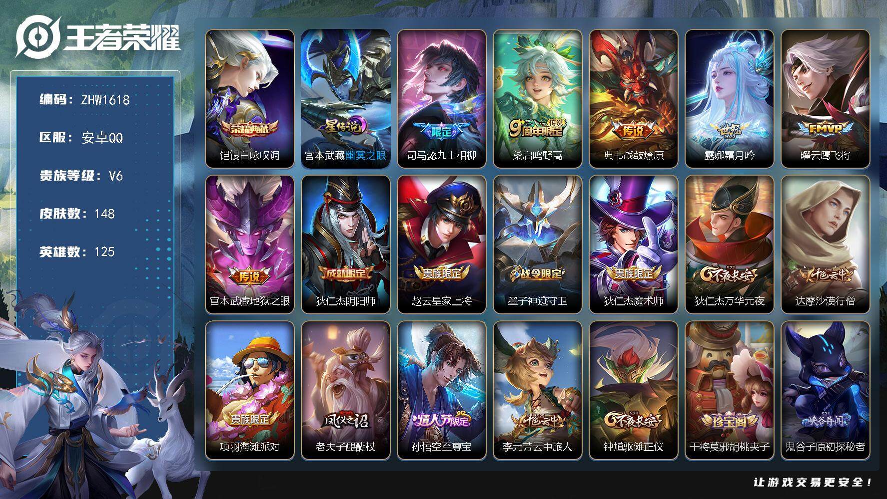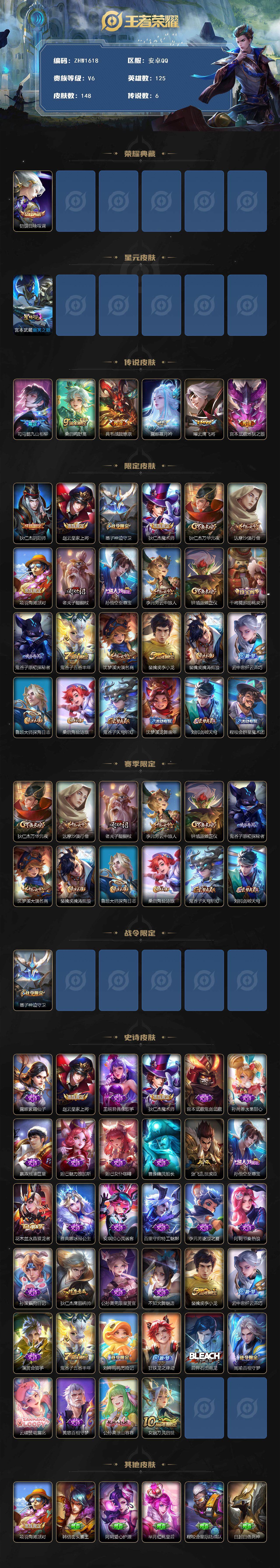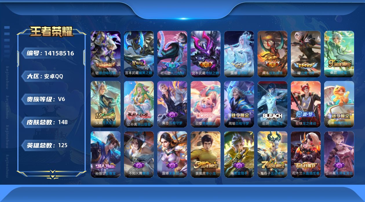[14158516]可二次【店主推荐捡漏号!可直接换绑】安卓Q-V6-最强王者段位-125英雄-148皮肤-1典藏皮肤-6传说-34史诗