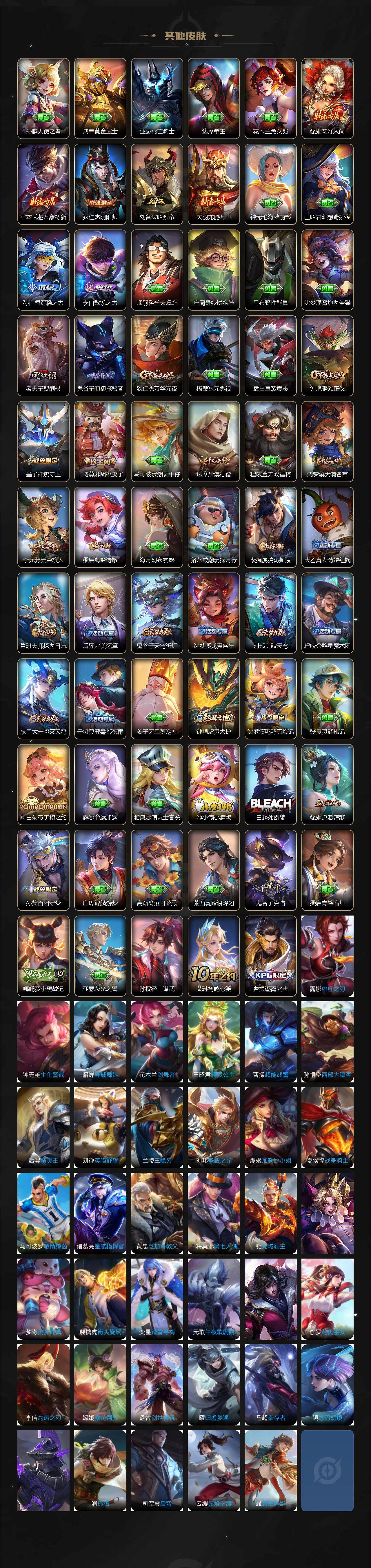 【其他皮肤】:项羽海滩派对,韩信街头霸王,阿轲爱心护理,芈月红桃皇后,程咬金星际陆战队,白起白色死神,孙膑天使之翼,典韦黄金武士,亚瑟死亡骑士,达摩拳王,花木兰兔女郎,甄姬花好人间,宫本武藏万象初新,狄仁杰阴阳师,刘备汉昭烈帝,关羽龙腾万里,钟无艳海滩丽影,王昭君幻想奇妙夜,孙尚香沉稳之力,李白敏锐之力,项羽科学大爆炸,庄周奇妙博物学,吕布野性能量,沈梦溪鲨炮海盗猫,老夫子醍醐杖,鬼谷子原初探秘者,狄仁杰万华元夜,杨戬次元傲视,盘古重装意志,钟馗驱傩正仪,墨子神迹守卫,干将莫邪胡桃夹子,马可波罗潮玩牛仔,达摩沙漠行僧,程咬金无双福将,沈梦溪大漠名商,李元芳云中旅人,桑启海盐诗旅,海月幻泉