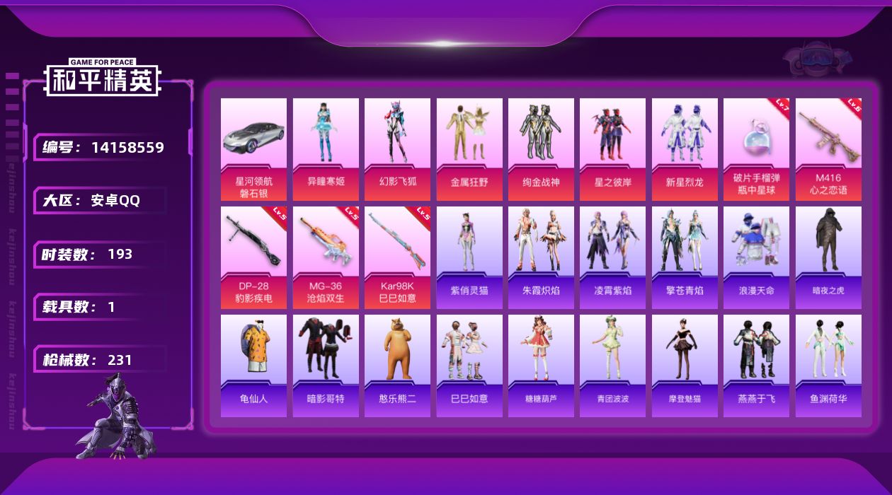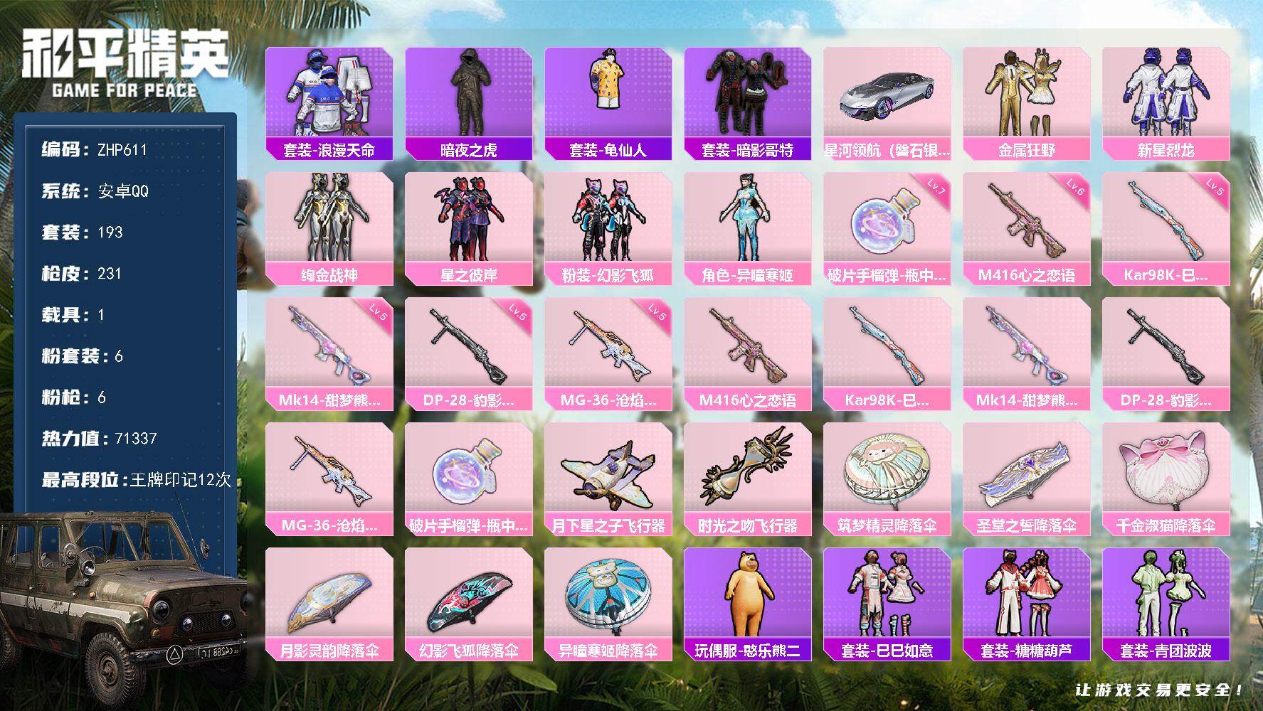 [14158559]安卓 手Q-6粉装-6特效枪-1载具-3粉色飞行器-71337热力值-12王牌印记-193套装-231枪皮