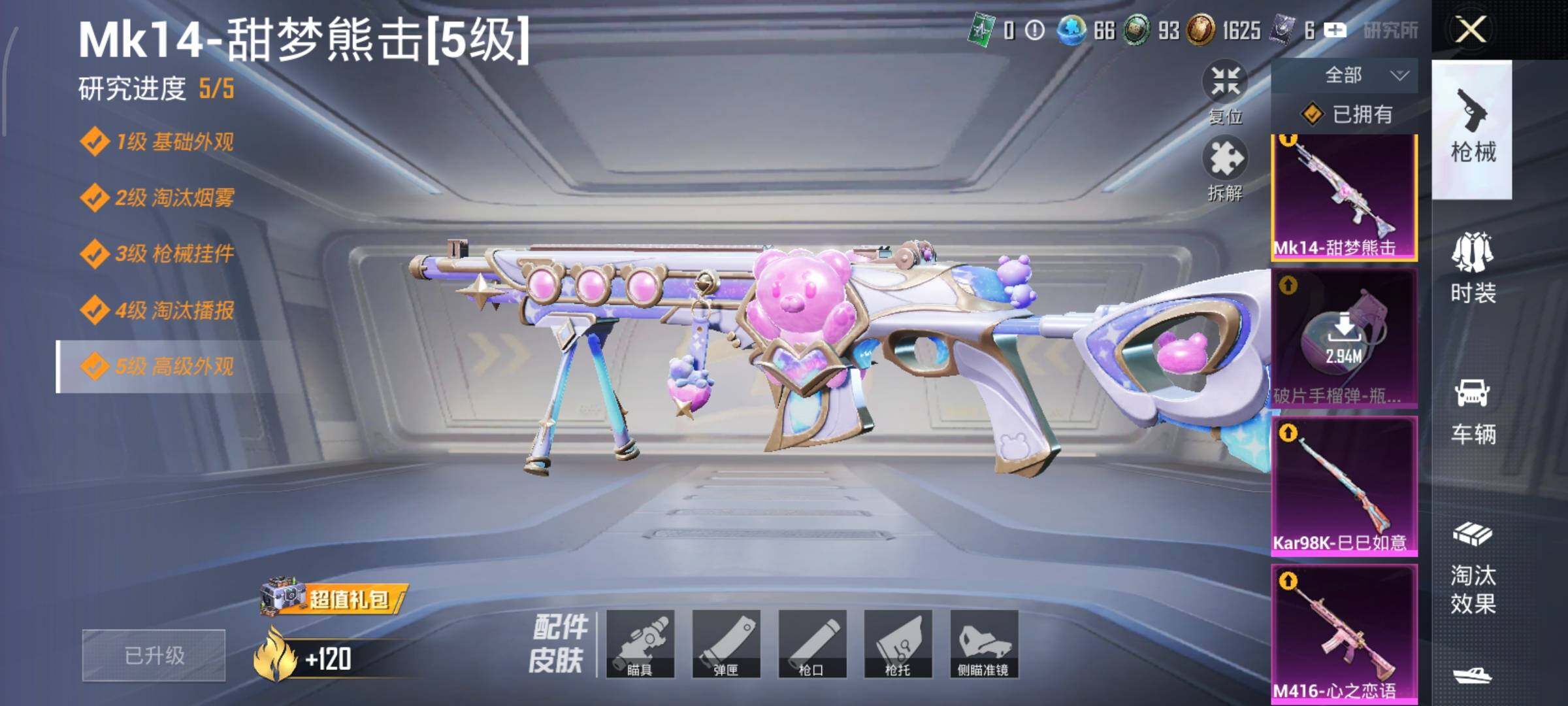 【粉色枪皮等级】:M416-心之恋语(六级),Kar98K-巳巳如意(五级),Mk14-甜梦熊击(五级),DP-28-豹影疾电(五级),MG-36-沧焰双生(五级),破片手榴弹-瓶中星球(七级)