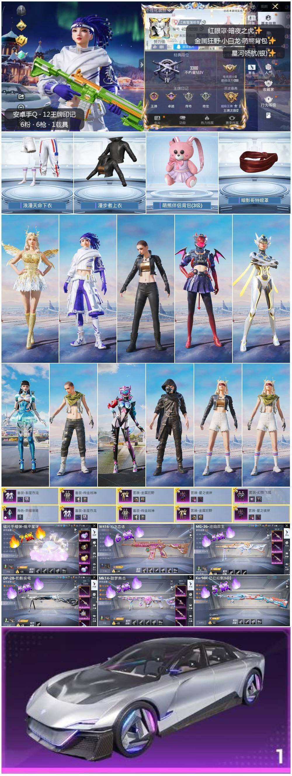 [14158559]安卓 手Q-6粉装-6特效枪-1载具-3粉色飞行器-71337热力值-12王牌印记-193套装-231枪皮 【热门品类】:套装-浪漫天命,套装-暗夜之虎,套装-龟仙人,套装-暗影哥特 【粉色载具】:星河领航(磐石银) 【粉色套装】:粉装-金属狂野,粉装-新星烈龙,粉装-绚金战神,粉装-星之彼岸,粉装-幻影飞狐,角色-异瞳寒姬 【粉色枪皮等级】:M416-心之恋语(六级),Kar98K-巳巳如意(五级),Mk14-甜梦熊击(五级),DP-28-豹影疾电(五级),MG-36-沧焰双生(五级),破片手榴弹-瓶中星球(七级) 【粉色枪皮】:M416-心之恋语,Kar98K-巳巳如意,Mk14-甜梦熊击,DP-28-豹影疾电,MG-36-沧焰双生,破片手榴弹-瓶中星球 【粉色飞行器】:月下星之子飞行器,时光之吻飞行器 【粉色降落伞】:筑梦精灵降落伞,圣堂之誓降落伞,千金淑猫降落伞,月影灵韵降落伞,幻影飞狐降落伞,异瞳寒姬降落伞 【稀有套装】:套装-龟仙人,玩偶服-憨乐熊二,套装-巳巳如意,套装-糖糖葫芦,套装-青团波波,角色-摩登魅猫,套装-燕燕于飞,套装-鱼渊荷华,角色-海琴烟,套装-晶辉守护,套装-粉恋花,套装-紫幽梦,套装-蓝冰羽,角色-瑰梦爱神,套装-极速光影,套装-彩虹兔,套装-云朵鹅,套装-雪绒豹,套装-朱霞炽焰,套装-凌霄紫焰,套装-擎苍青焰,角色-紫俏灵猫,套装-炫彩糖果 【稀有枪皮】:AUG-冰晶雪宝,AKM-彩虹符号,AKM-灼热熔岩,AKM-生命誓言,AKM-破晓战魂,AKM-筑梦精灵,AKM-虎虎生威,AKM-霓虹街区,AKM-龙的传人,M16A4-幻世战舞者,M16A4-甜心亚梦,M16A4-蓝色火焰,M16A4-千金淑猫,SCAR-L-夜灯,SCAR-L-暗夜玫瑰,SCAR-L-玉兔迎春,SCAR-L-红色方程式,SCAR-L-黄金龙骨,M416-夜灯,M416-糯团青竹,M416-葫芦兄弟,M416-蓝色火焰,GROZA-异彩先驱,AUG-天降萌叽,AUG-甜蜜菠萝,AUG-耀粉歌者,QBZ-彩虹符号,QBZ-飞驰魅影,M762-天降萌叽,M762-奇异狩猎者,M762-牛气冲天,M762-瑞龙福将,M762-云朵鹅,Mk47-妙红点点,G36C-时空追击者,AC-VAL-天降萌叽,AC-VAL-快闪甜心,AC-VAL-甜心亚梦,蜜獾-天降萌叽