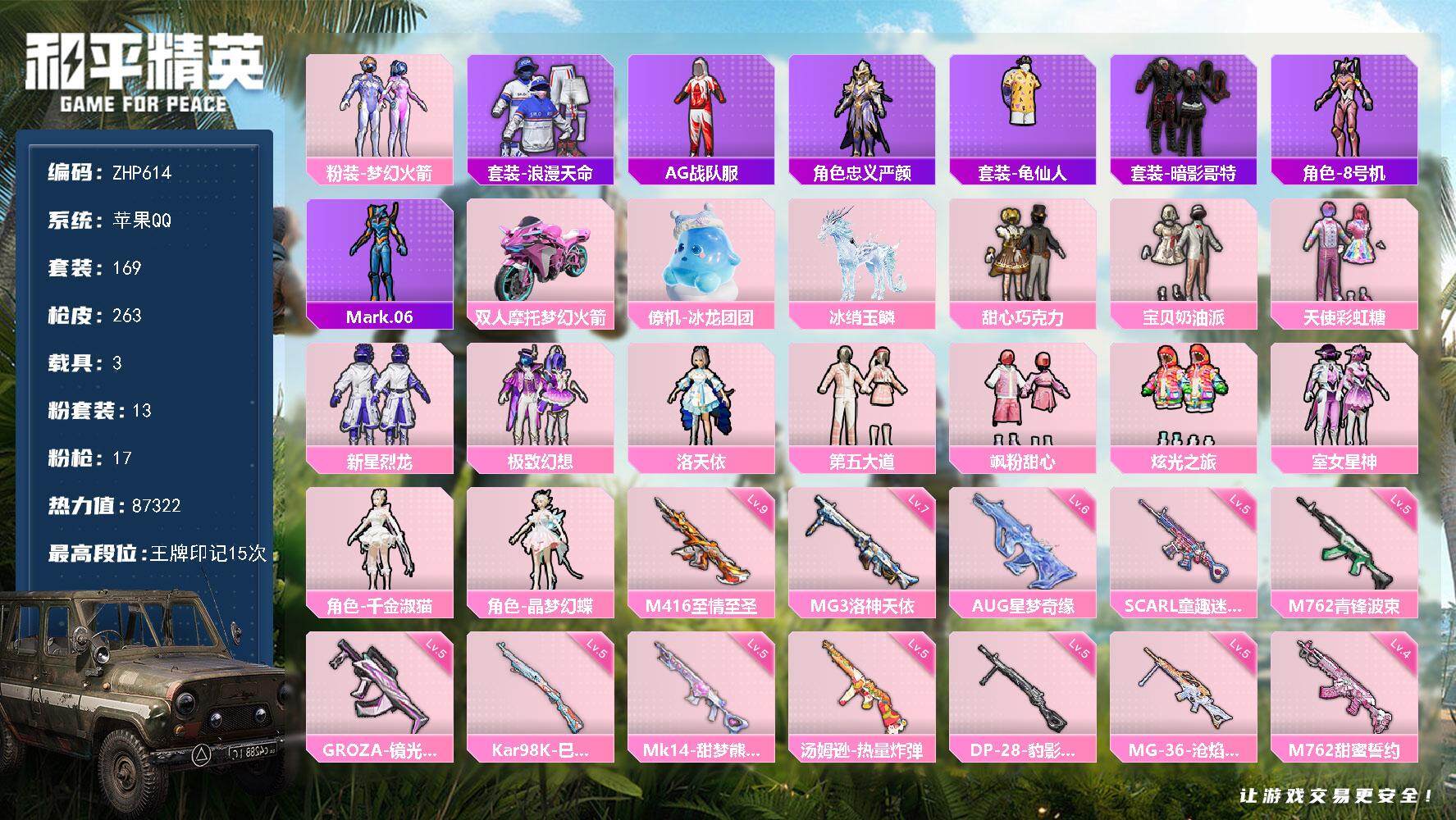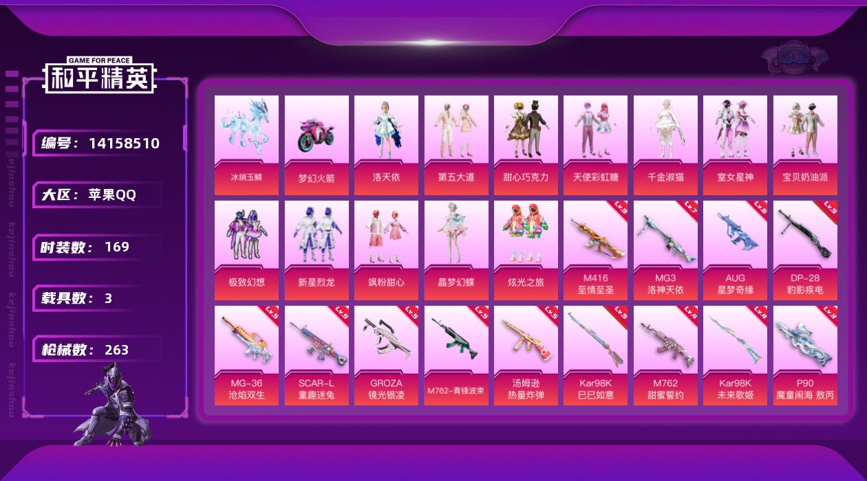[14158510]【店主推荐捡漏号!可直接换绑】/素材身法号/M416-至情至圣(九级)/地铁满天赋 苹果 手Q-13粉装-17特效枪-3载具-5粉色飞行器-8.7w热力值-15王牌印记-169套装-263枪皮【热门品类】:粉装-梦幻火箭,套装-浪漫天命,套装-AG战队服,角色-忠义严颜,套装-龟仙人,套装-暗影哥特,角色-8号机,角色-Mark.06【粉色载具】:双人摩托-梦幻火箭,僚机-冰龙团团,冰绡玉鳞【粉色套装】:粉装-甜心巧克力,粉装-宝贝奶油派,粉装-天使彩虹糖,粉装-梦幻火箭,粉装-新星烈龙,粉装-极致幻想,角色-洛天依,粉装-第五大道,粉装-飒粉甜心,粉装-炫光之旅,粉装-室女星神,角色-千金淑猫,角色-晶梦幻蝶【粉色枪皮等级】:SCAR-L-童趣迷兔(五级),SCAR-L-青春物语(一级),M416-心之恋语(一级),M416-至情至圣(九级),GROZA-镜光银凌(五级),AUG-超新星(一级),AUG-星梦奇缘(六级),M762-甜蜜誓约(四级),M762-青锋波束(五级),汤姆逊-热量炸弹(五级),P90-魔童闹海 敖丙(三级),Kar98K-未来歌姬(四级),Kar98K-巳巳如意(五级),Mk14-甜梦熊击(五级),DP-28-豹影疾电(五级),MG3-洛神天依(七级),MG-36-沧焰双生(五级)【粉色飞行器】:梦幻火箭飞行器,齐天大圣飞行器,镜域双华-灵镜之阶