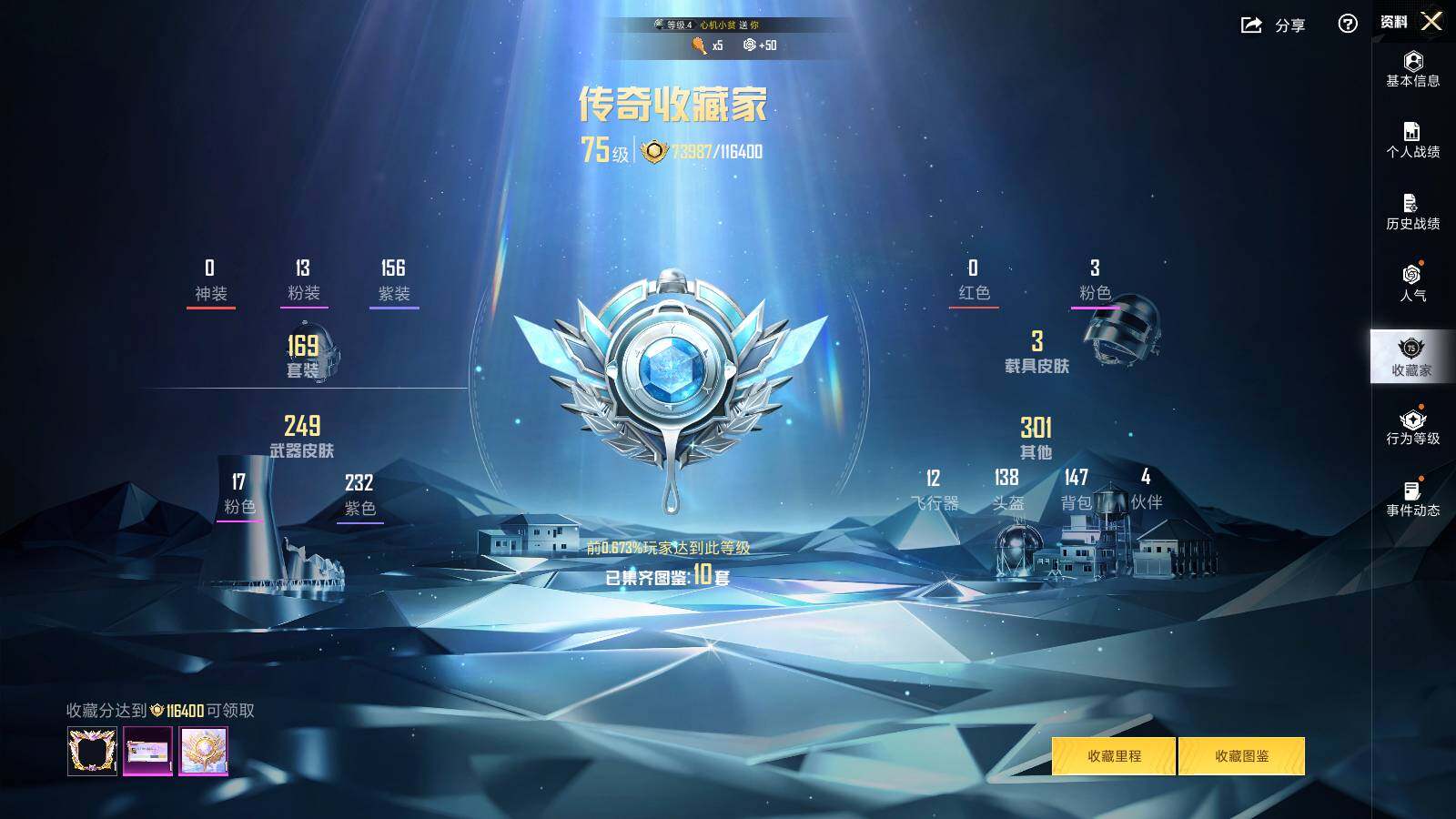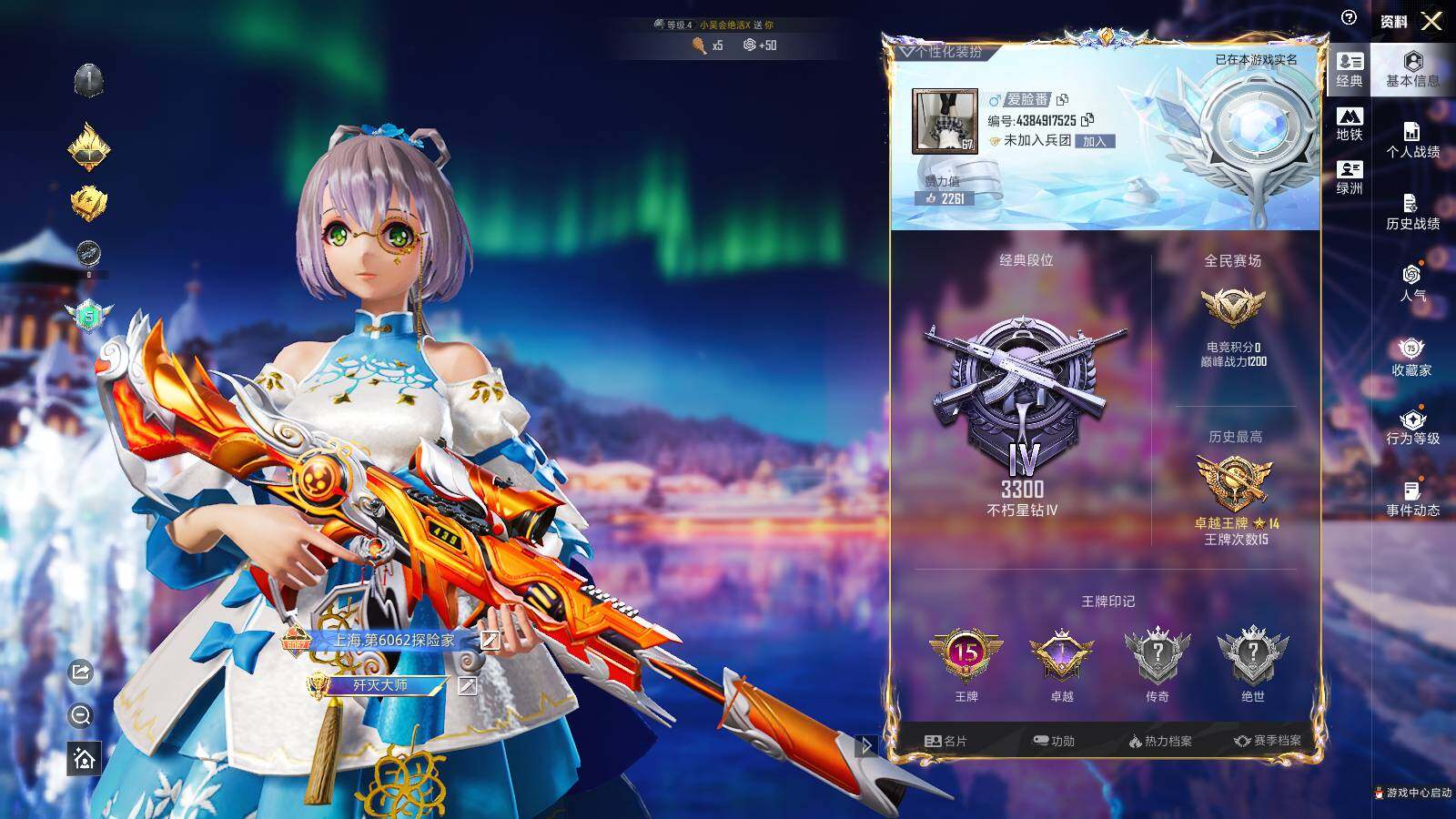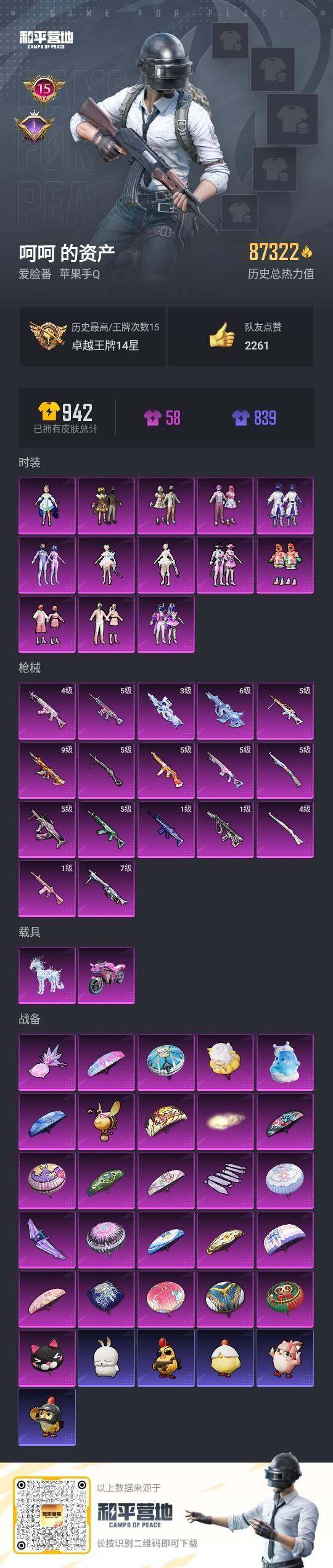 - PX_2095424-安卓QQ 历史总热力值:64375 粉装数量:15 特效枪数量:11 载具数量:1 王牌印记:8 历史最高段位:超级王牌15星 套装数量:121 时装数量:435 枪械数量:178 战备数量:159 装备数量:295 载具:双人摩托-梦幻火箭 时装:套装-冰川幽秘,套装-冰川粉黛,套装-宝贝奶油派,套装-寒光使者,套装-岚岚物语,套装-星穹咏叹调,套装-炙焰红王,套装-缤纷油