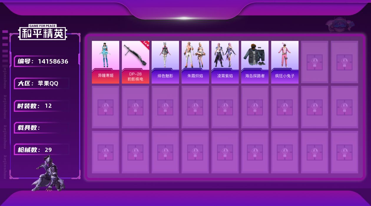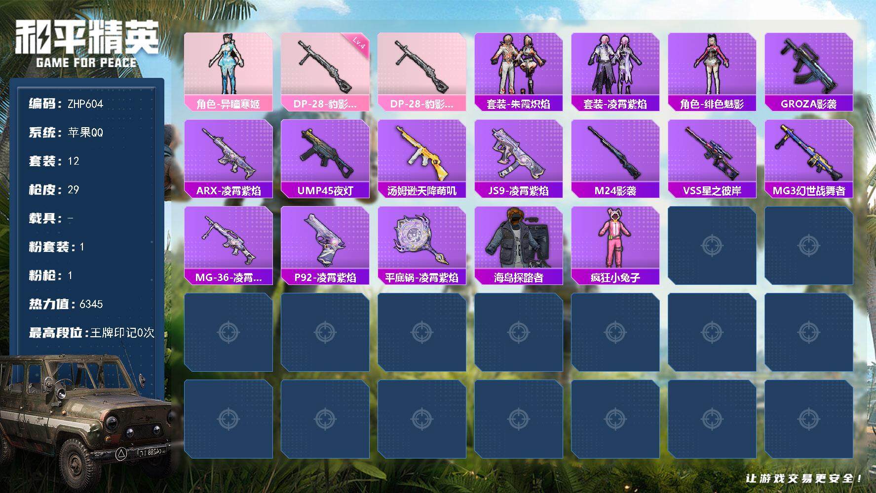 [14158636]【店主推荐捡漏号!可直接换绑】 苹果 手Q-1粉装-1特效枪-1粉色飞行器-6345热力值-1王牌印记-12套装-29枪皮【粉色套装】:角色-异瞳寒姬【粉色枪皮等级】:DP-28-豹影疾电(四级)