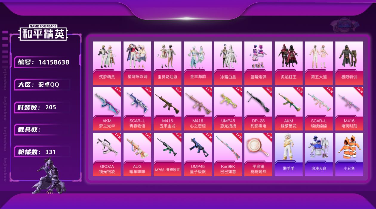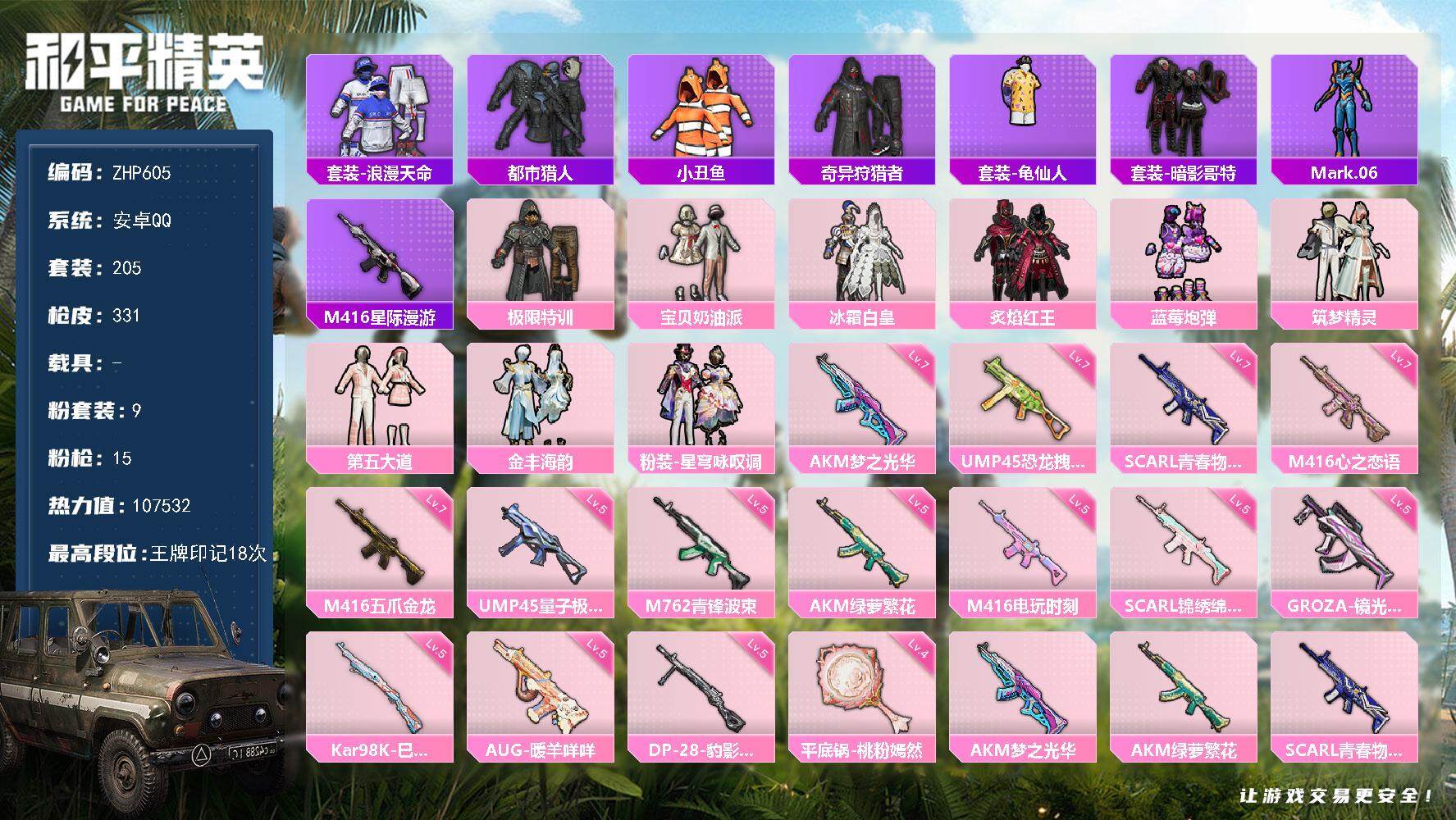 [14158638]可二次【店主推荐捡漏号!可直接换绑】/素材身法号/绝世印记2 安卓 手Q-9粉装-15特效枪-3粉色飞行器-10.7w热力值-18王牌印记-205套装-331枪皮【热门品类】:套装-浪漫天命,套装-都市猎人,套装-小丑鱼,套装-奇异狩猎者,套装-龟仙人,套装-暗影哥特,角色-Mark.06,M416-星际漫游【粉色套装】:粉装-极限特训,粉装-宝贝奶油派,粉装-冰霜白皇,粉装-炙焰红王,粉装-蓝莓炮弹,粉装-筑梦精灵,粉装-第五大道,粉装-金丰海韵,粉装-星穹咏叹调【粉色枪皮等级】:AKM-梦之光华(七级),AKM-绿萝繁花(五级),SCAR-L-青春物语(七级),SCAR-L-锦绣绵绵(五级),M416-五爪金龙(七级),M416-心之恋语(七级),M416-电玩时刻(五级),GROZA-镜光银凌(五级),AUG-暖羊咩咩(五级),M762-青锋波束(五级),UMP45-恐龙拽拽(七级),UMP45-量子极限(五级),Kar98K-巳巳如意(五级),DP-28-豹影疾电(五级),平底锅-桃粉嫣然(四级)【粉色飞行器】:镜光幻境飞行翼,绝色倾城飞行器