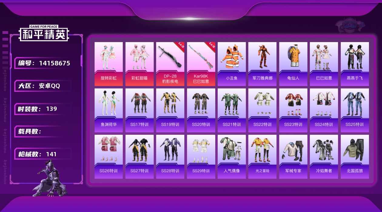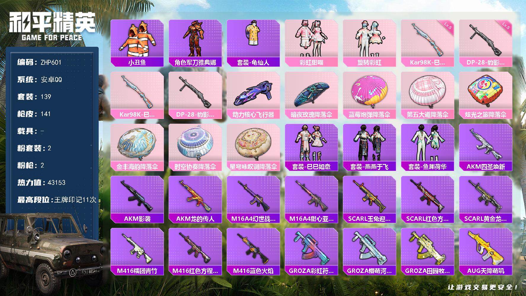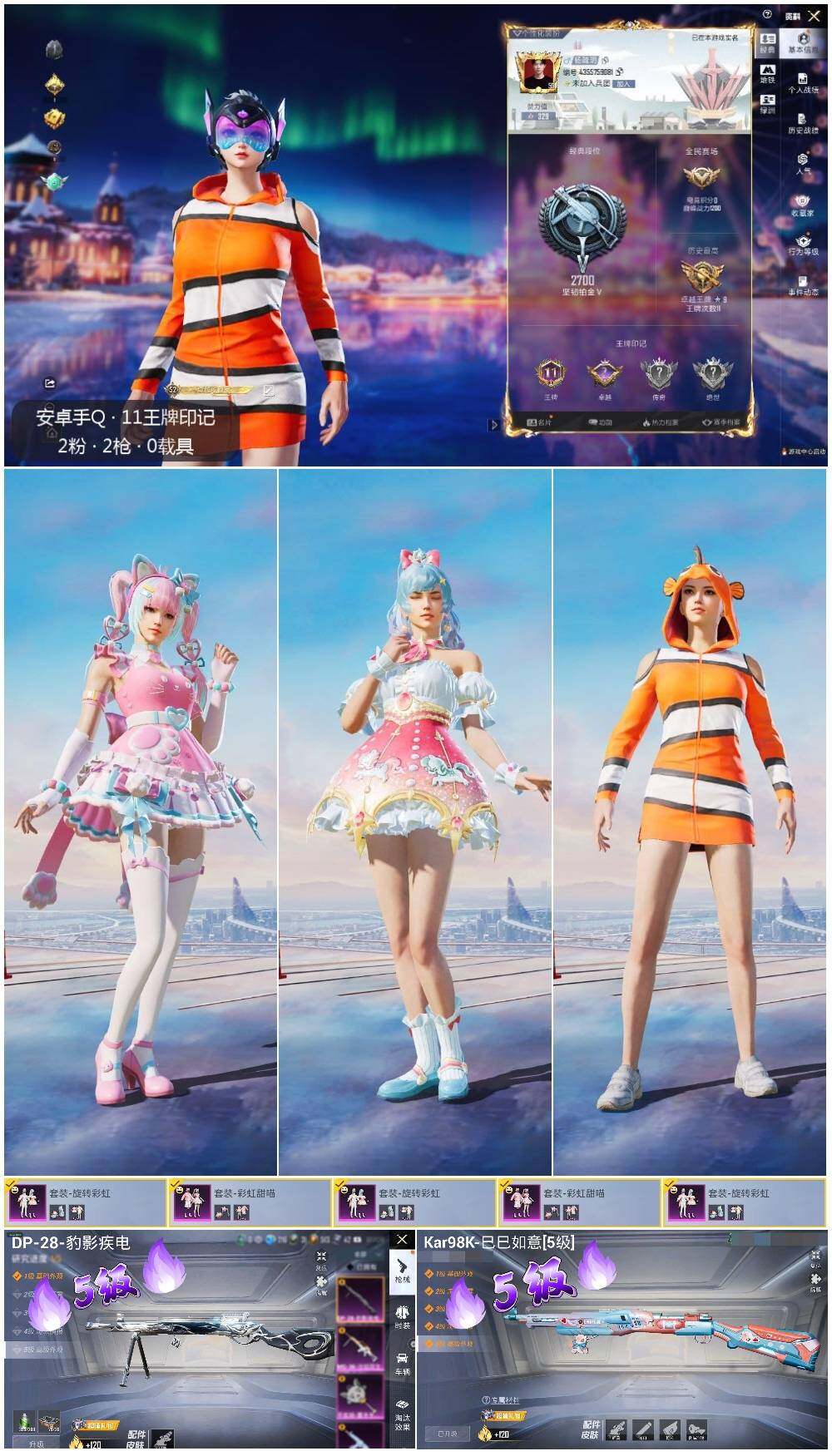 [14158675]【店主推荐捡漏号!可直接换绑】 安卓 手Q-2粉装-2特效枪-1粉色飞行器-4.3w热力值-11王牌印记-139套装-141枪皮【热门品类】:套装-小丑鱼,角色-军刀雅典娜,套装-龟仙人【粉色套装】:粉装-彩虹甜喵,粉装-旋转彩虹【粉色枪皮等级】:Kar98K-巳巳如意(五级),DP-28-豹影疾电(五级)【粉色飞行器】:动力核心飞