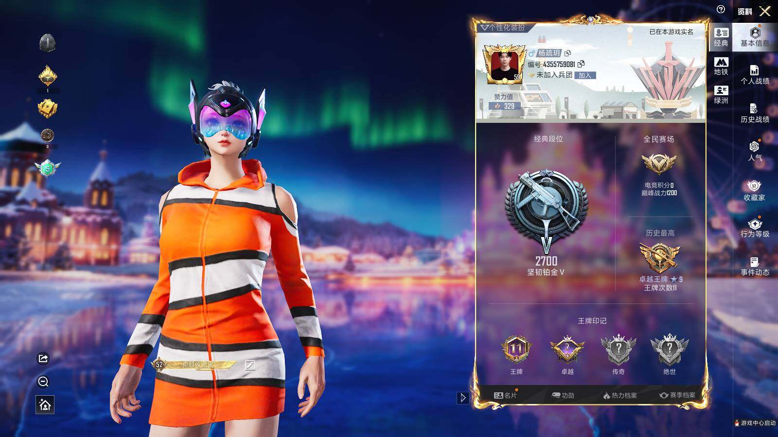 - PX_2108095-实名: 可修改 贵族等级: V8 英雄数: 122 皮肤数: 245 荣耀水晶: 弑枪猎影 传说皮: 云鹰飞将,炽阳神光,一念神魔,零号·赤焰,李逍遥,淬星耀世,超时空战士-狄仁杰,妄想实况,澜逐花归海,貂蝉曦玄引 限定皮: 李小龙,梁祝,时雨天司,魔法小厨娘,傲雪梅枪,五谷丰年,怒海麟威,鸣野蒿