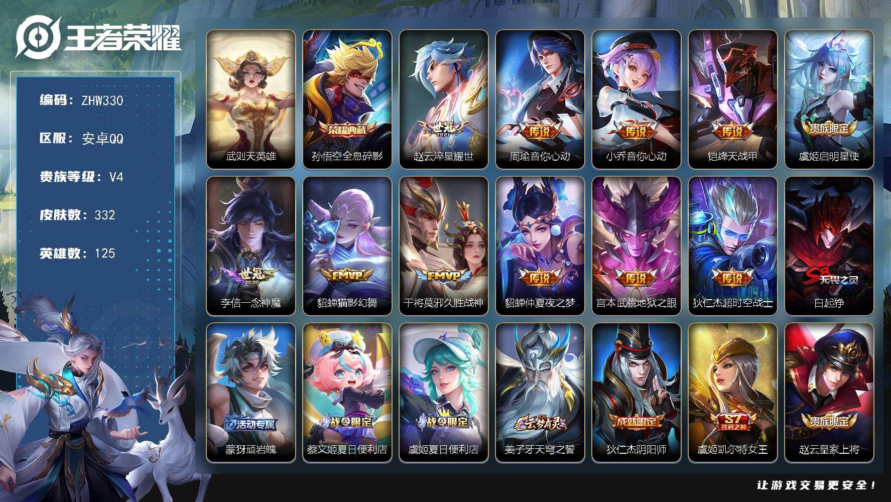 [14158681]中路30段【特价急出/详情看图】:安卓Q-V4-至尊星耀III段位-125英雄-332皮肤-1典藏-11传说-87史诗 【英雄全皮】:钟馗全皮,猪八戒全皮,蒙恬全皮,空空儿全皮 【荣耀典藏】:武则天英雄,孙悟空全息碎影 【传说皮肤】:赵云淬星耀世,周瑜音你心动,小乔音你心动,铠绛天战甲,虞姬启明星使,李信一念神魔,貂蝉猫影幻舞,干将莫邪久胜战神,貂蝉仲夏夜之梦,宫本武藏地狱之眼,狄仁杰超时空战士 【限定皮肤】:白起狰,蒙犽顽岩魄,蔡文姬夏日便利店,虞姬夏日便利店,姜子牙天穹之誓,狄仁杰阴阳师,虞姬凯尔特女王,赵云皇家上将,墨子神迹守卫,妲己时之彼端,嬴政白昼王子,孙尚香蔷薇恋人,鲁班七号狮舞东方,庄周蜃楼王,庄周高山流水,高渐离死亡摇滚,阿轲迷踪丽影,孙膑妖精王,扁鹊炼金王,芈月重明,芈月幻夜卜梦,吕布猎兽之王,周瑜赤莲之焰,元歌云间偶戏,夏侯惇朔风刀,曹操烛龙,典韦穷奇,典韦蓝屏警告,马可波罗逐梦之星,马可波罗暗影游猎,狄仁杰魔术师,狄仁杰万华元夜,达摩星际陆战队,达摩沙漠行僧,项羽海滩派对,老夫子醍醐杖,老夫子航海奇遇记,程咬金演武夺筹,刘邦夺宝奇兵,韩信飞衡,韩信傲雪梅枪,兰陵王驯魔猎人,兰陵王金庭之子,亚瑟潮玩骑士王,孙悟空孙行者,牛魔御旌,后羿辉光之辰,后羿圣弓游侠,李元芳银河之约,李元芳匿光侦查者,李元芳云中旅人,虞姬启明星使,钟馗神迹守卫,钟馗驱傩正仪,女娲朔望之晖,干将莫邪真爱魔法,雅典娜单词大作战,雅典娜黎明之约,蔡文姬繁星吟游,太乙真人饕餮,太乙真人华丽摇滚,鬼谷子原初探秘者,黄忠火炮绅士,苏烈千军破阵,百里玄策原初追逐者,弈星混沌棋,梦奇顽趣,沈梦溪星空之诺,沈梦溪大漠名商,明世隐疑决卦,裴擒虎李小龙,裴擒虎擒涛扼浪,狂铁御狮,米莱狄御霄,米莱狄胡桃异想国,云中君纤云弄巧,盾山御銮,猪八戒西部大镖客,猪八戒猪悟能,嫦娥拒霜思,蒙犽狂想玩偶喵,鲁班大师探海日志,桑启海盐诗旅,艾琳女武神,艾琳流音漫舞,司空震地狱燃心,阿古朵江河有灵,张良古海寻踪,蒙恬荣光圣徽,鬼谷子天穹祈灯,沈梦溪龙舞盛年,周瑜熔金海岸 【年限皮肤】:后羿辉光之辰,韩信飞衡 【赛季限定】:庄周蜃楼王,孙膑妖精王,扁鹊炼金王,白起狰,芈月重明,夏侯惇朔风刀,曹操烛龙,典韦穷奇,狄仁杰万华元夜,达摩沙漠行僧,老夫子醍醐杖,程咬金演武夺筹,兰陵王金庭之子,张良古海寻踪,牛魔御旌,李元