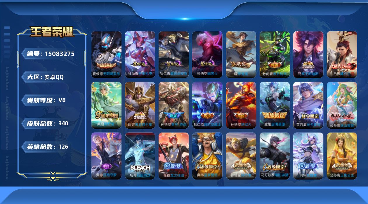 [15083275]【店主推荐捡漏号!可直接换绑】对抗路33段,安卓Q-V8-最强王者段位-126英雄-340皮肤-1典藏皮肤-10传说-102史诗 【英雄全皮】:狂铁全皮,猪八戒全皮,蒙恬全皮 【荣耀典藏】:夏侯惇无限飓风号 【传说皮肤】:桑启鸣野蒿,铠冥王哈迪斯,吕布曦玄引,曜李逍遥 ,虞姬启明星使,孙悟空零号赤焰,后羿黄金射手座,孙尚香末日机甲,孙悟空地狱火,狄仁杰超时空战士 【限定皮肤】:白起狰,铠冥王哈迪斯,蔡文姬夏日便利店,大乔绒语心约,虞姬夏日便利店,姜子牙天穹之誓,狄仁杰阴阳师,虞姬凯尔特女王,廉颇寅虎御盾,赵云皇家上将,赵云引擎之心,墨子神迹守卫,嬴政白昼王子,鲁班七号乒乒小将,庄周高山流水,高渐离玩趣恶龙,钟无艳王者之锤,扁鹊炼金王,白起夜都怪侠,芈月幻夜卜梦,吕布猎兽之王,吕布御风骁将,元歌云间偶戏,夏侯惇朔风刀,典韦穷奇,典韦蓝屏警告,马可波罗暗影游猎,狄仁杰魔术师,狄仁杰万华元夜,达摩星际陆战队,达摩沙漠行僧,项羽海滩派对,老夫子醍醐杖,老夫子航海奇遇记,程咬金演武夺筹,韩信飞衡,王昭君午后时光,兰陵王金庭之子,花木兰默契交锋,亚瑟潮玩骑士王,孙悟空零号赤焰,孙悟空孙行者,牛魔御旌,后羿辉光之辰,后羿如梦令,后羿圣弓游侠,李元芳银河之约,李元芳云中旅人,虞姬启明星使,钟馗驱傩正仪,女娲朔望之晖,干将莫邪真爱魔法,雅典娜单词大作战,雅典娜黎明之约,蔡文姬繁星吟游,鬼谷子原初探秘者,黄忠烈魂,黄忠火炮绅士,苏烈千军破阵,百里玄策原初追逐者,百里守约朱雀志,弈星混沌棋,梦奇顽趣,公孙离蜜橘之夏,公孙离玉兔公主,沈梦溪大漠名商,明世隐疑决卦,裴擒虎李小龙,裴擒虎擒涛扼浪,狂铁御狮,狂铁电玩高手,米莱狄御霄,米莱狄胡桃异想国,云中君纤云弄巧,伽罗天狼溯光者,盾山御銮,猪八戒西部大镖客,猪八戒猪悟能,上官婉儿梁祝,嫦娥拒霜思,曜李逍遥 ,蒙犽狂想玩偶喵,鲁班大师探海日志,桑启海盐诗旅,艾琳女武神,艾琳流音漫舞,张良古海寻踪,蒙恬荣光圣徽,鬼谷子天穹祈灯,吕布曦玄引,沈梦溪龙舞盛年,刘邦剑破天穹,周瑜熔金海岸 【年限皮肤】:百里守约朱雀志,廉颇寅虎御盾,后羿辉光之辰,吕布御风骁将,韩信飞衡,黄忠烈魂 【赛季限定】:扁鹊炼金王,白起狰,夏侯惇朔风刀,典韦穷奇,狄仁杰万华元夜,达摩沙漠行僧,老夫子醍醐杖,程咬金演武夺筹,兰陵王金庭之子,张良古海寻踪,牛魔御旌,李元芳云中旅人,