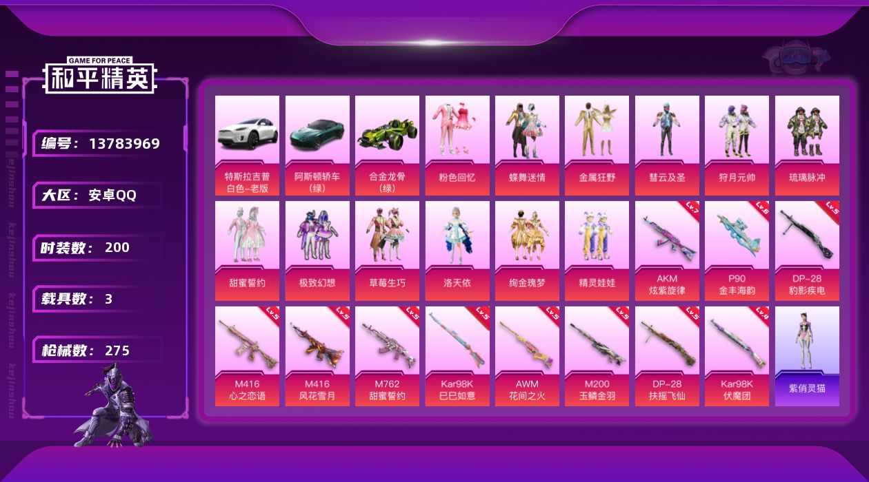 [13783969]【1556】安卓 手Q-12粉装-11特效枪-3载具-3粉色飞行器-99556热力值-21王牌印记-200套装-275枪皮 【热门品类】:角色-军刀雅典娜,旭日初心兜帽大衣,套装-龟仙人,套装-浪漫波比,套装-粉红小猪 【粉色载具】:特斯拉Model X(珍珠白),阿斯顿马丁DBS(绿),合金龙骨(绿),空客H135-蔚蓝之翼 【粉色套装】:粉装-粉色回忆,粉装-蝶舞迷情,粉装-金属狂野,粉装-彗云及圣,粉装-狩月元帅,粉装-琉璃脉冲,粉装-甜蜜誓约,粉装-极致幻想,粉装-草莓生巧,角色-洛天依,粉装-绚金瑰梦,粉装-精灵娃娃 【粉色枪皮等级】:AKM-炫紫旋律(七级),M416-心之恋语(五级),M416-风花雪月(五级),M762-甜蜜誓约(五级),P90-金丰海韵(六级),Kar98K-伏魔团(四级),Kar98K-巳巳如意(五级),AWM-花间之火(五级),M200-玉鳞金羽(五级),DP-28-扶摇飞仙(五级),DP-28-豹影疾电(五级) 【粉色枪皮】:AKM-炫紫旋律,M416-心之恋语,M416-风花雪月,M762-甜蜜誓约,P90-金丰海韵,Kar98K-伏魔团,Kar98K-巳巳如意,AWM-花间之火,M200-玉鳞金羽,DP-28-扶摇飞仙,DP-28-豹影疾电 【粉色飞行器】:古堡领主飞行器,伏魔团飞行器,心之恋语飞行翼 【粉色降落伞】:甜心宝贝降落伞,炫紫旋律降落伞,神秘黑猫降落伞,古堡领主降落伞,甜蜜誓约降落伞,四圣焕新降落伞,心之恋语降落伞,扶摇飞仙降落伞,马卡龙降落伞,洛神天依降落伞,甜心娃娃降落伞,暗星紫秘降落伞,天之羽翼降落伞,星夜魔法师降落伞,旋转彩虹降落伞,青空秋雨降落伞,沙丘之主降落伞,精灵梦叶罗丽降落伞,喜羊羊与灰太狼降落伞 【稀有套装】:套装-龟仙人,套装-巳巳如意,套装-雏菊兔兔,套装-萝兰蝴蝶,套装-小熊娃娃,套装-糖糖葫芦,套装-青团波波,套装-棉花软糖,角色-俏兔智灵,套装-燕燕于飞,套装-鱼渊荷华,玩偶服-懒羊羊,角色-紫俏灵猫 【稀有枪皮】:AKM-四圣焕新,AKM-夜灯,AKM-彩虹符号,AKM-江南烟雨,AKM-灼热熔岩,AKM-玉龙,AKM-虎虎生威,AKM-霓虹街区,AKM-龙的传人,M16A4-夜灯,M16A4-幻世战舞者,M16A4-机械英豪,M16A4-甜心亚梦,SCAR-L-扶摇飞仙,SCA