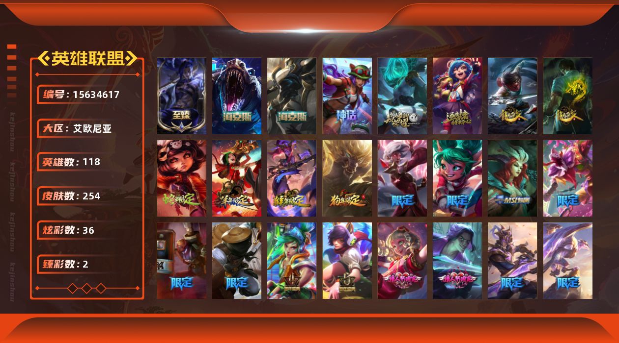 - [11732896]可二次 可修改实名 4神话 8臻彩 77限定 33传说 120史诗 417皮肤 41炫彩 171英雄 铂金 皮肤:至臻 神龙尊者 炎龙瑟提,王国机神苍狼 瑟提,太空律动 “创乐之神” 奥恩,雷霆领主 奥恩,晨星之翎 洛,冰雪游神 巴德,腥红之月 卡莉丝塔,灌篮高手 艾翁,糖果之王 艾翁,上古战魂 雷克塞,虚空使者 俄洛伊,腥红之月 锤石,冠军典狱长 锤石,司马懿 仲达,星际之门 阿兹尔,海皇姬 娜美,鲛妮座人 娜美,胜利之剑 亚托克斯,仲裁圣骑 亚托克斯,源计划:裁决 蔚,虎痴之拳 蔚,霓虹杀拳 蔚,SKT T1 艾克,任性学霸 艾克,爵士 克烈,胜利枪神 卢锡安,纳财大帝 塔姆,海牛大大 塔姆,星之守护者 金克丝,神龙烈焰 金克丝,黯焰双魂 千珏,腥红之月 烬,西部牛仔 烬,糖果大战 布隆,布隆·狮心,猛虎 布隆,屠龙勇士 布隆,源代码 卡蜜尔,弗雷尔卓德 塔莉垭,这货不是维克兹,苍穹之光 维克兹,战地机甲 维克兹,源计划:风 亚索,西部牛仔 亚索,邪恶魔人 扎克,狂狮 纳尔,萌侦探 喵尔摩斯,最后一只恐龙 纳尔,魔女 婕拉,驯龙女巫 婕拉,SKT T1 婕拉,鬼影森森 婕拉,野火之藤 婕拉