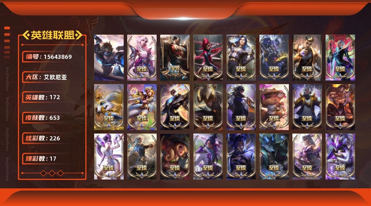 、未定级段位-172英雄-653皮肤-226炫彩-1终极-41神话-87限定-61传说-130史诗