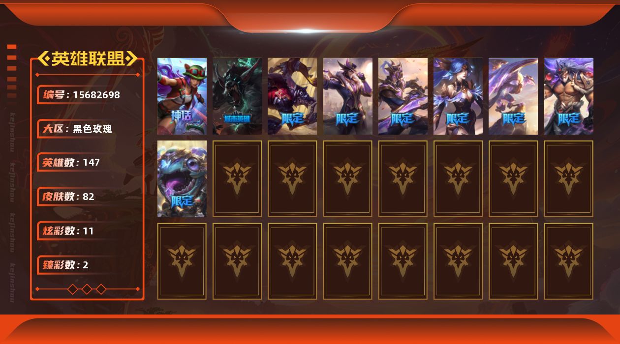 黄金段位-147英雄-82皮肤-11炫彩-0终极-2神话-10限定-3传说-20史诗